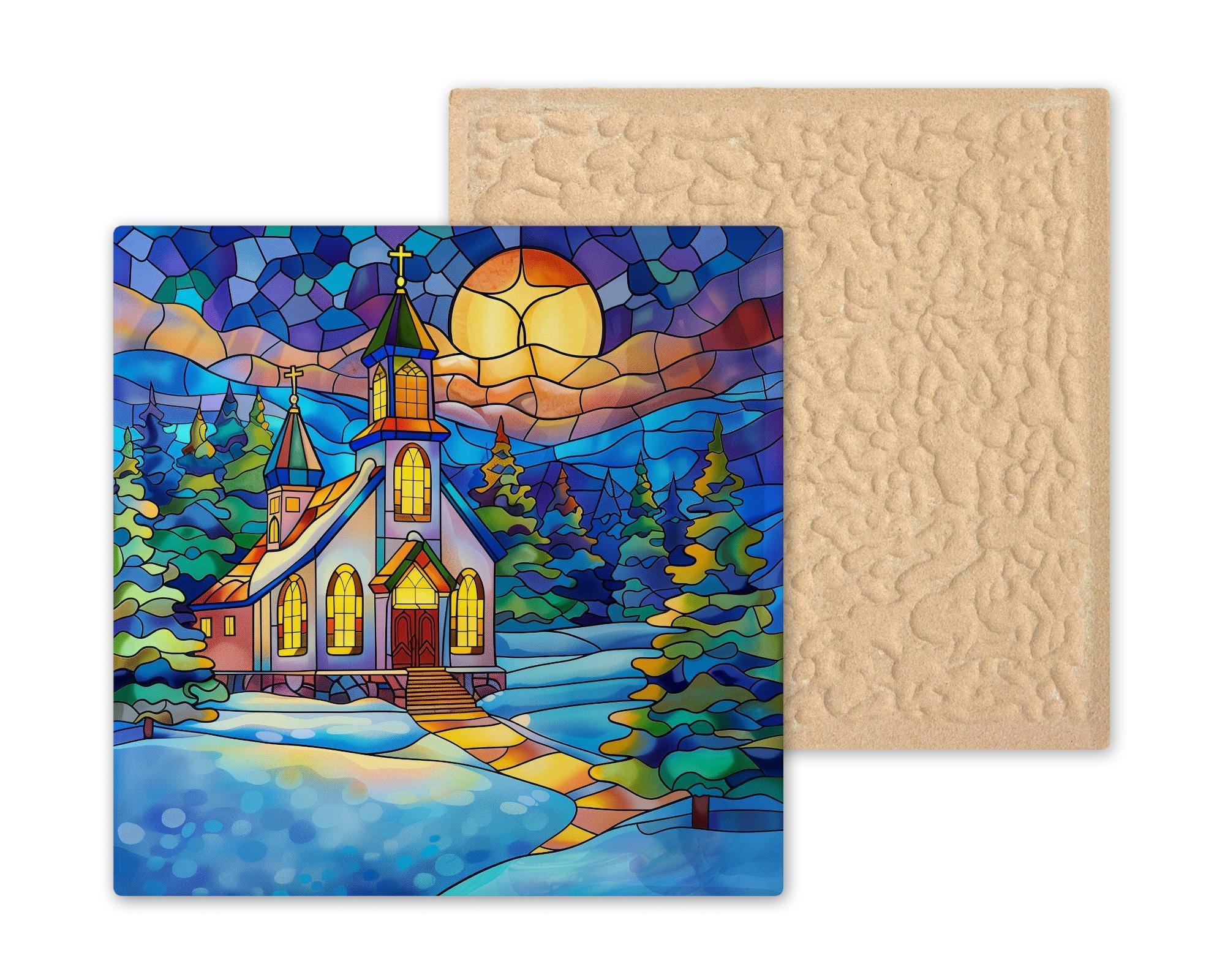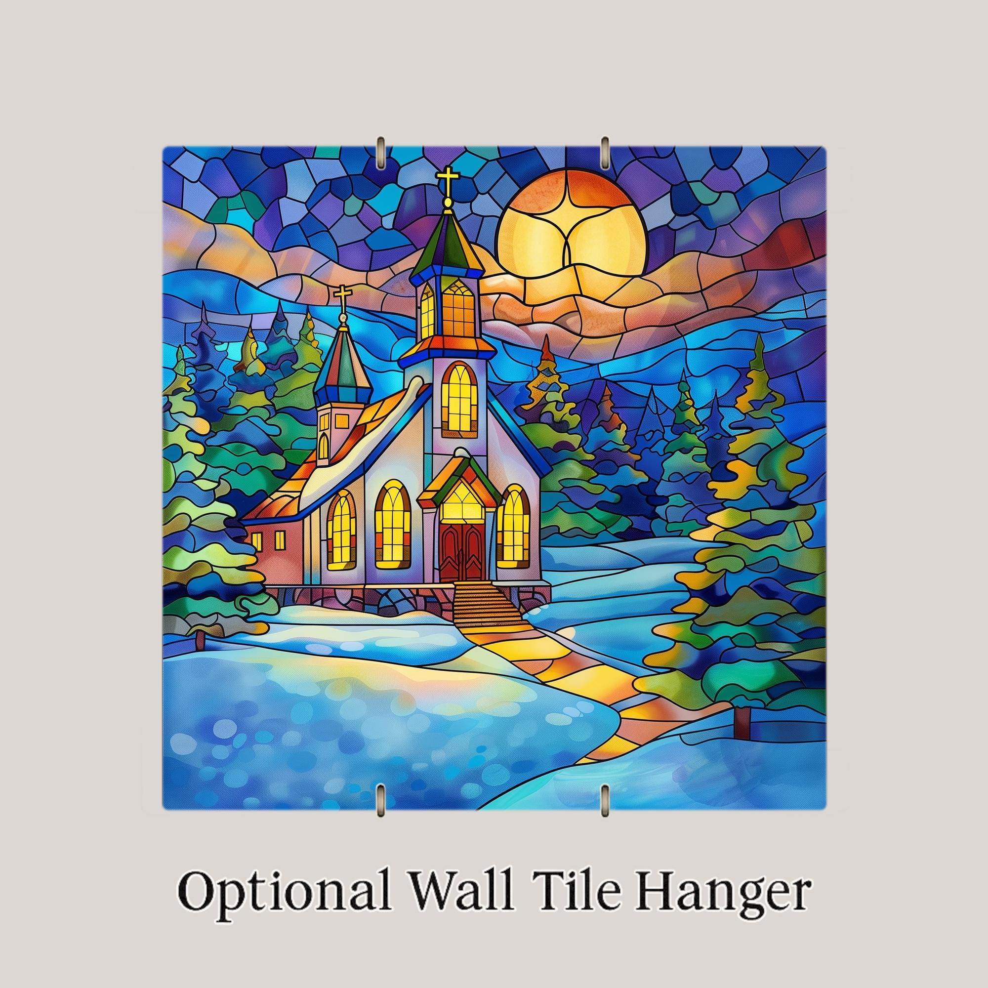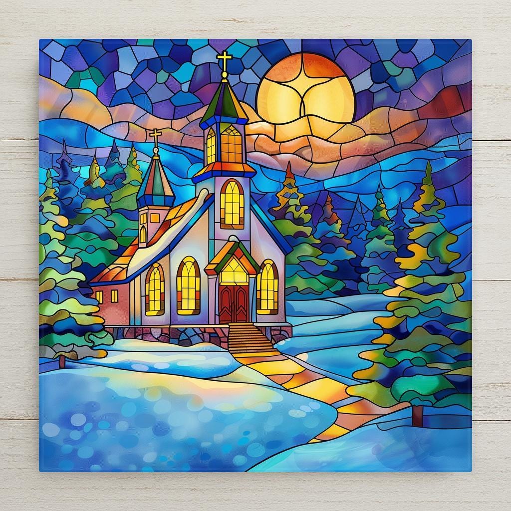 Bring the beauty of Christmas into your home with this stained glass–style ceramic tile featuring a winter church glowing with golden light. Surrounded by snow-covered trees beneath a shining moon, the scene radiates warmth and peace. Though it looks like stained glass or mosaic, please note this is not. The design is a permanent print on ceramic tile, crafted for lasting brilliance and durability.