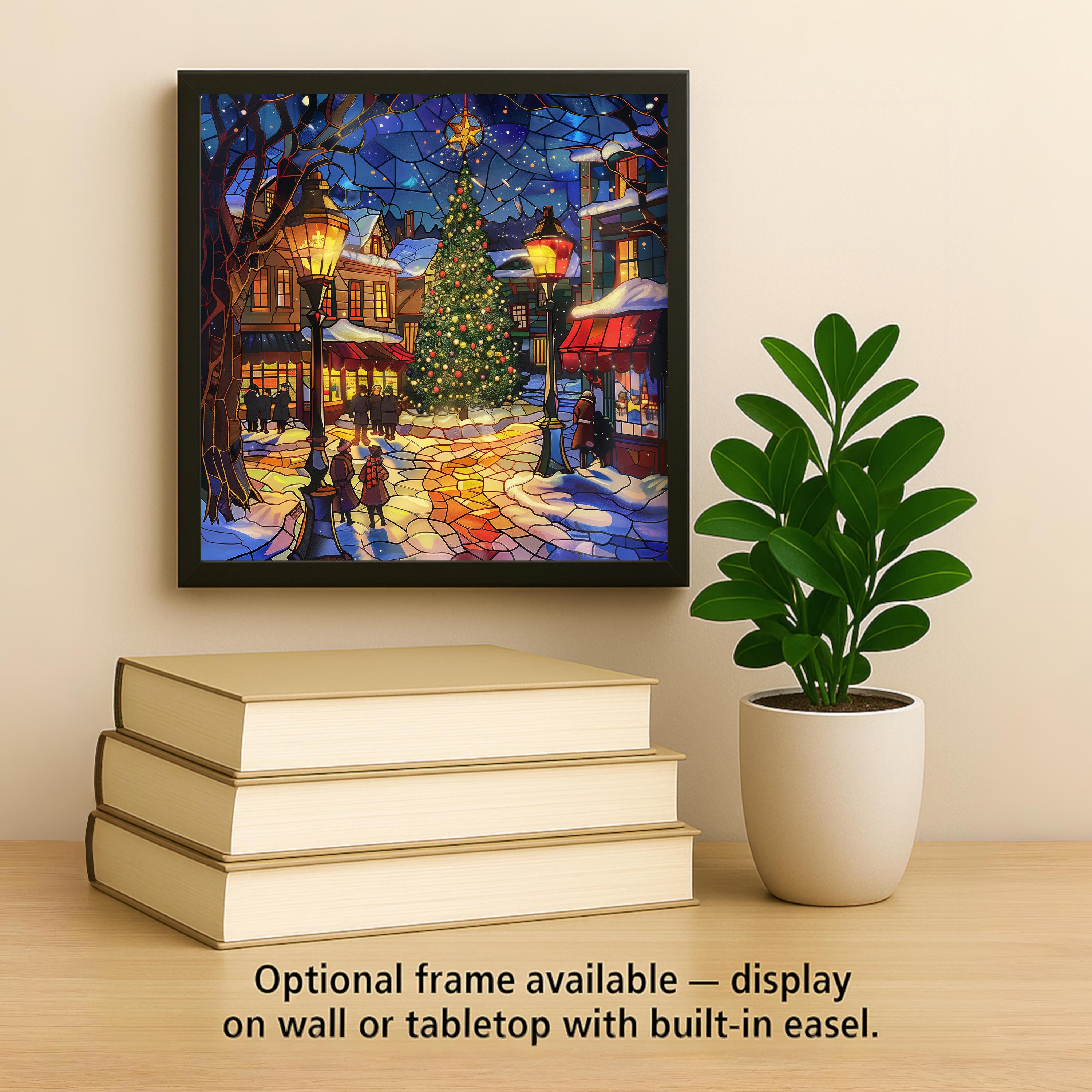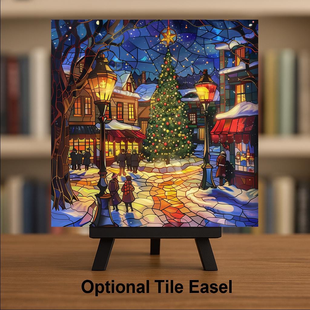 Celebrate the wonder of the holidays with this stained glass–style ceramic tile featuring a glowing Christmas town square. A decorated tree stands proudly beneath a star, surrounded by warmly lit shops, snow-covered streets, and vintage lanterns casting golden light. The design captures the joy of gathering, tradition, and the spirit of Christmas. Please note: while it looks like stained glass or mosaic, this is not. The artwork is a permanent print on ceramic tile, designed for lasting beauty and vibrant color.