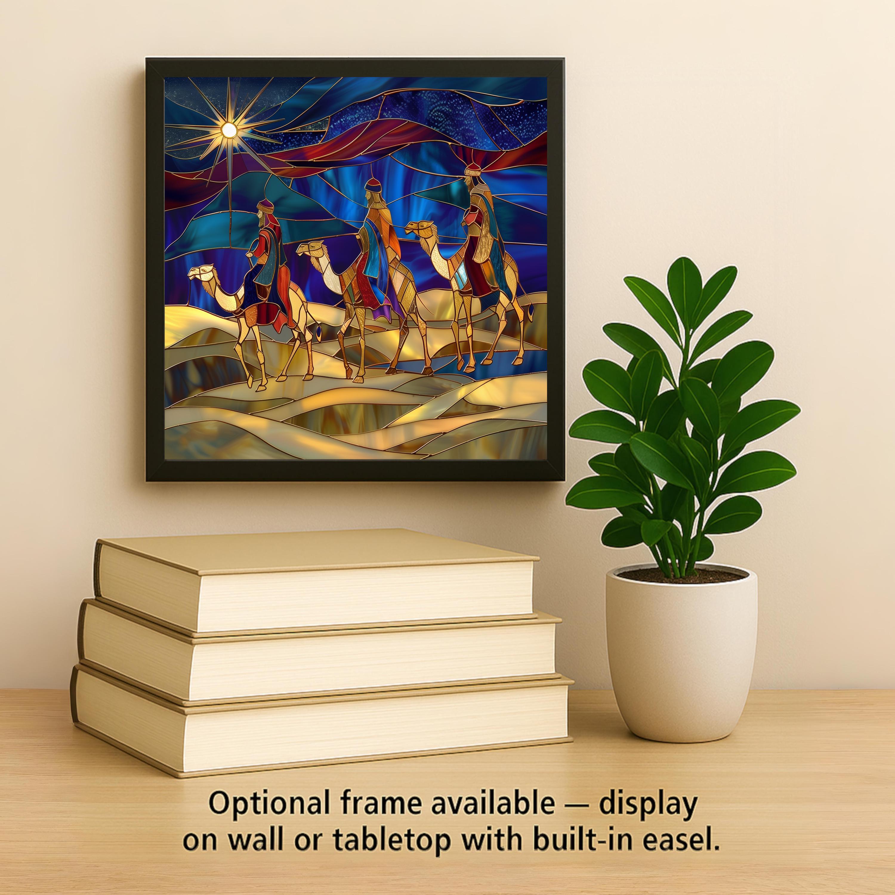 Honor the Nativity story with this stained glass–style ceramic tile featuring the Three Magi following the shining Star of Bethlehem. Clad in rich robes of crimson, sapphire, and gold, the Wise Men ride their camels across golden sands beneath a radiant night sky. Though it may look like stained glass or mosaic, please note this is not. It is a permanent print on ceramic tile, crafted to preserve the glowing artistry of stained glass in a lasting, fade-resistant format.