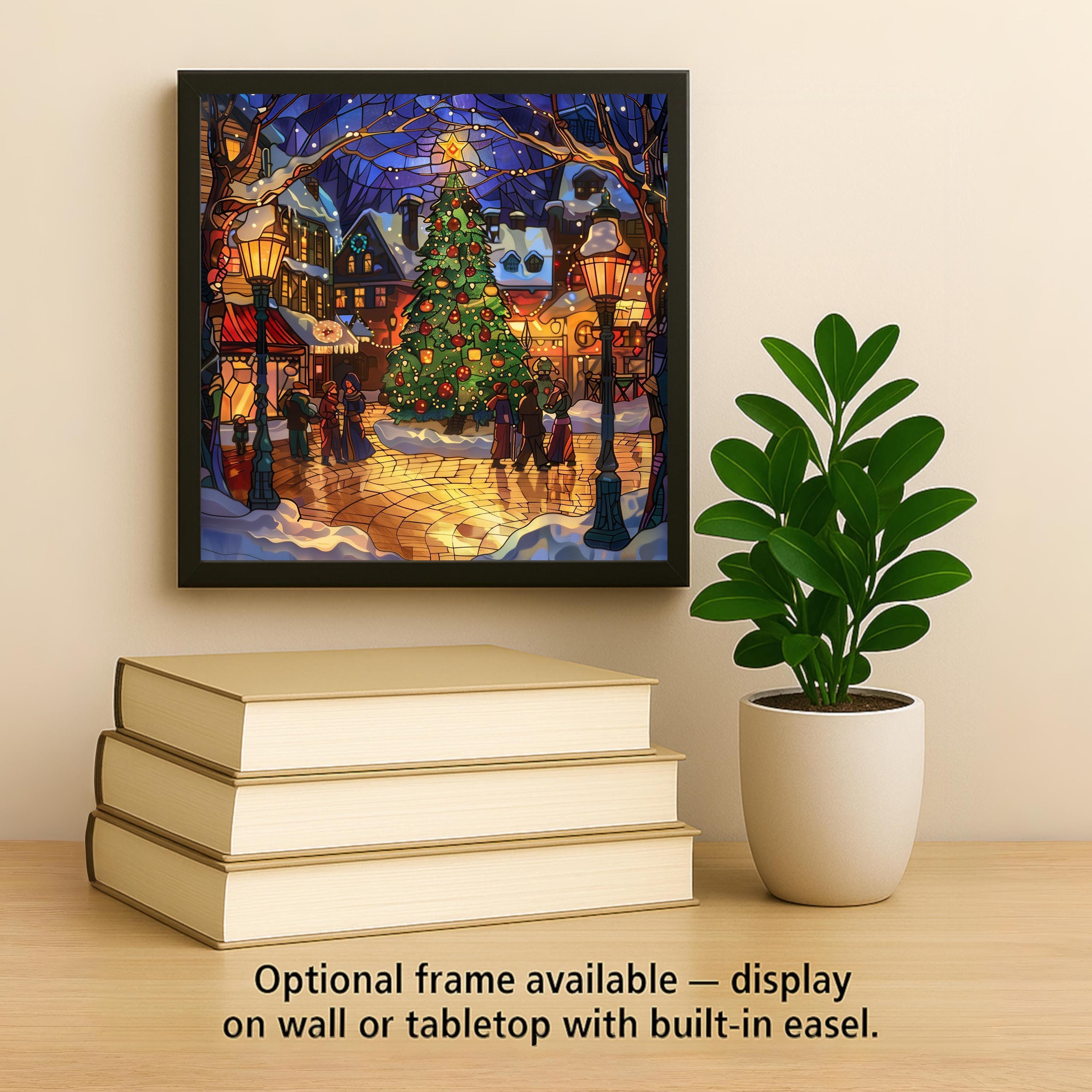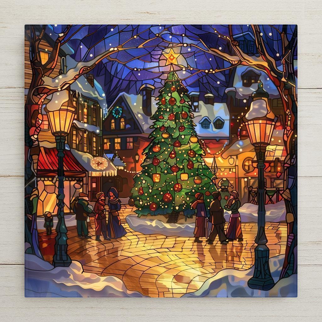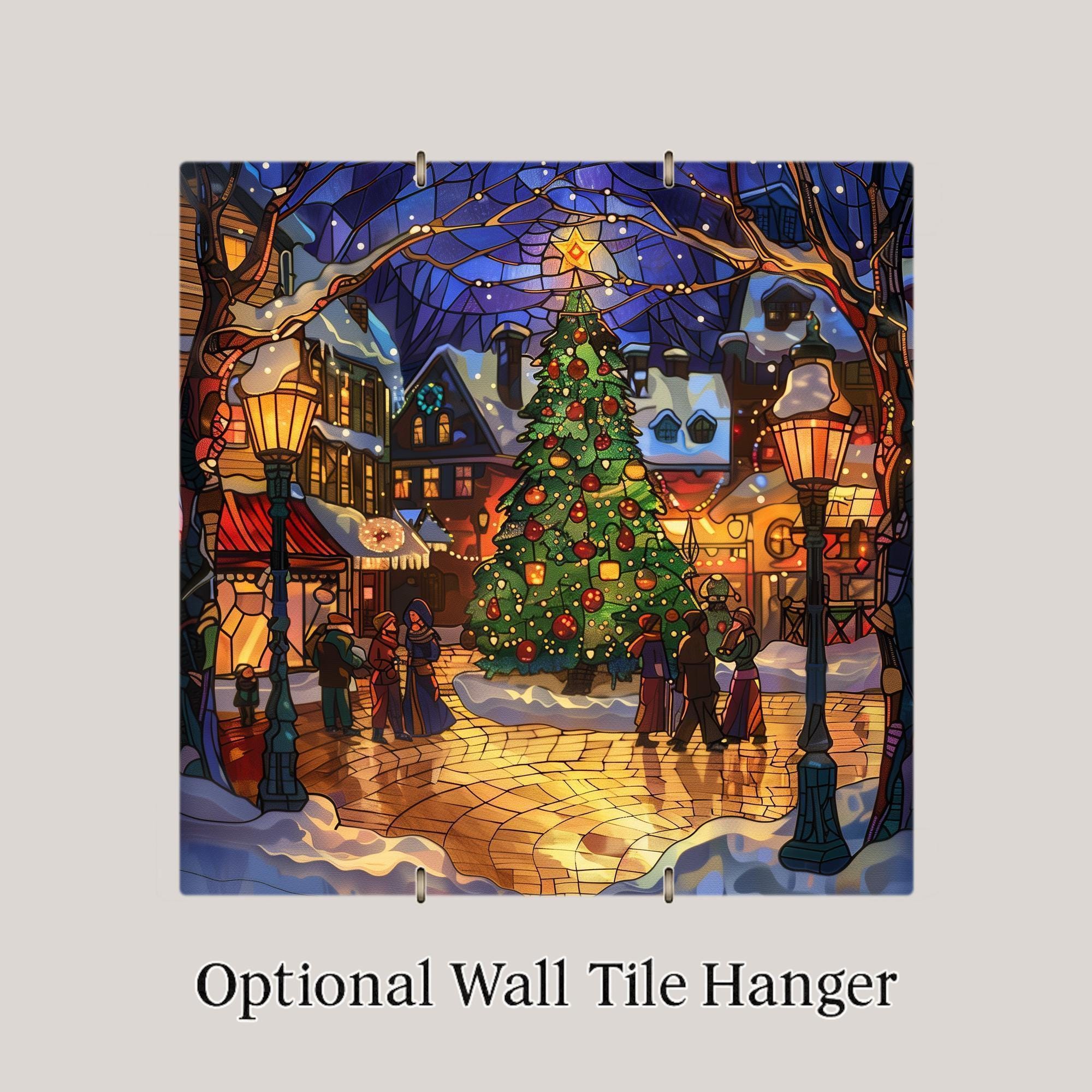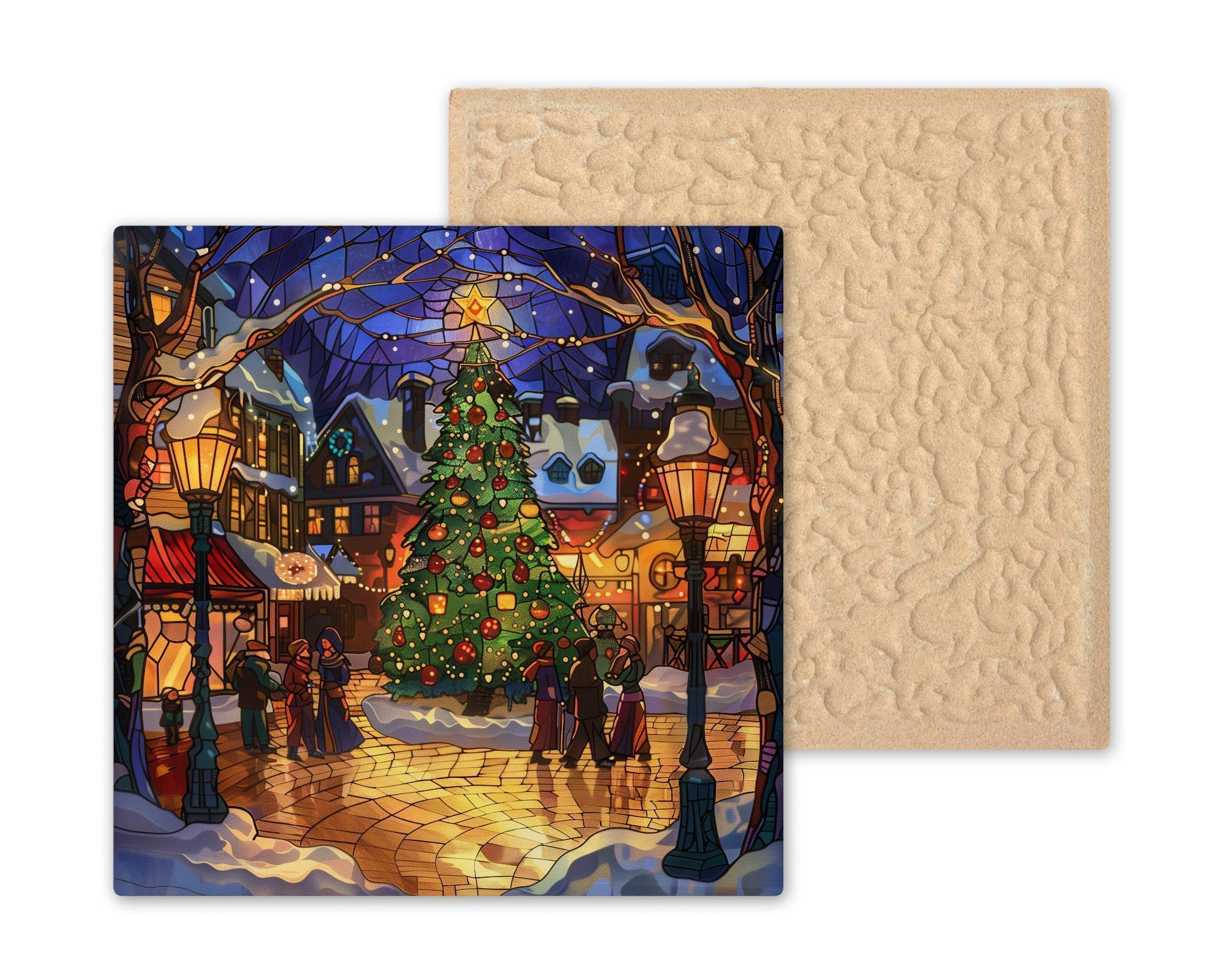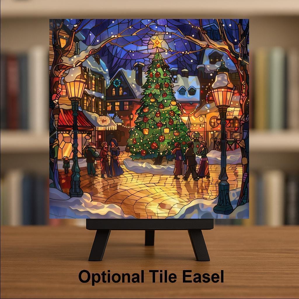 Bring festive charm into your home with this stained glass–style ceramic tile featuring a radiant Christmas town square. At the center stands a tall holiday tree adorned with glowing ornaments and crowned with a shining star. Snow-covered shops, golden street lamps, and warmly dressed villagers create a magical scene that reflects the joy of Christmas gatherings. Though it resembles stained glass or mosaic, please note this is not. The design is a permanent print on ceramic tile, designed for lasting brilliance.