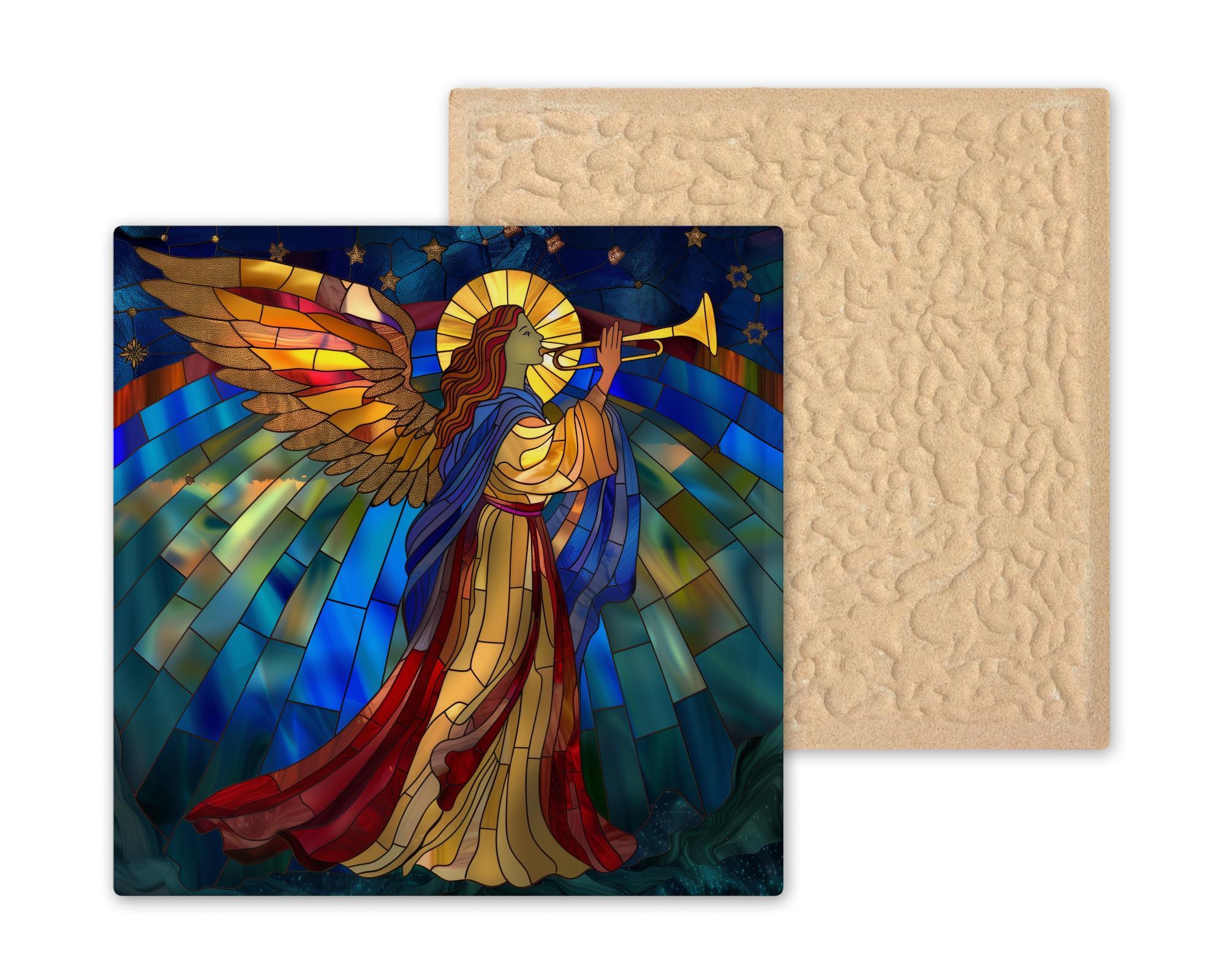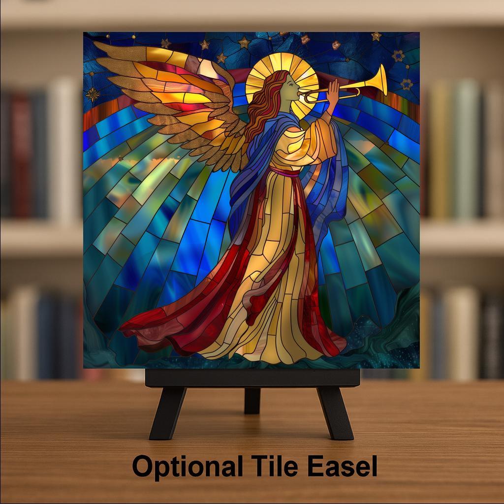 Bring a sense of heavenly peace to your home with this stained glass–style ceramic tile featuring a majestic angel with trumpet. Draped in flowing robes of red, cream, and blue, the angel’s golden wings shine as radiant light streams across the sky. Above her, stars shimmer with spiritual beauty, while the golden halo symbolizes divine light and guidance. Though the artwork may resemble stained glass or mosaic, please note it is not. This is a permanent print on ceramic tile, made to capture the luminous artistry of stained glass in lasting form.