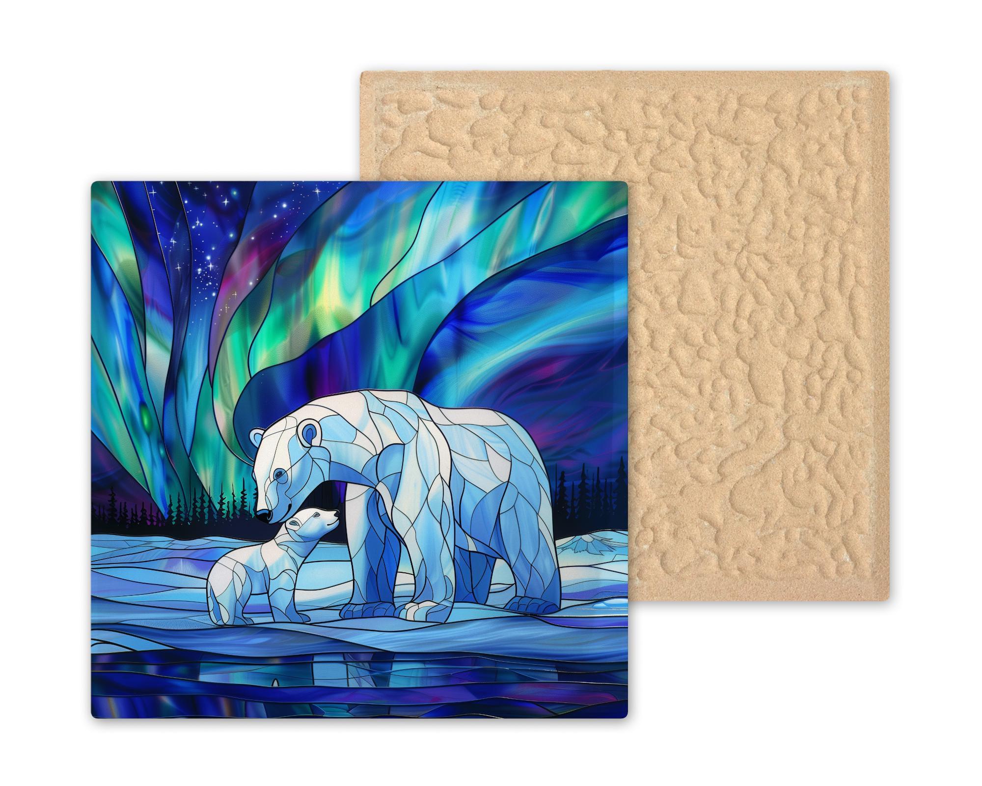 Celebrate the beauty of nature with this stained glass–style ceramic tile featuring a mother polar bear and her cub beneath the aurora borealis. The glowing sky shimmers in emerald green, sapphire blue, and violet as the bears stand in the icy landscape, reflected in the water below. This piece captures both warmth and majesty, with the tender bond between mother and cub at its heart. Though it may look like stained glass or mosaic, please note it is not. This is a permanent print on ceramic tile, created to emulate the glow of stained glass in a lasting format.