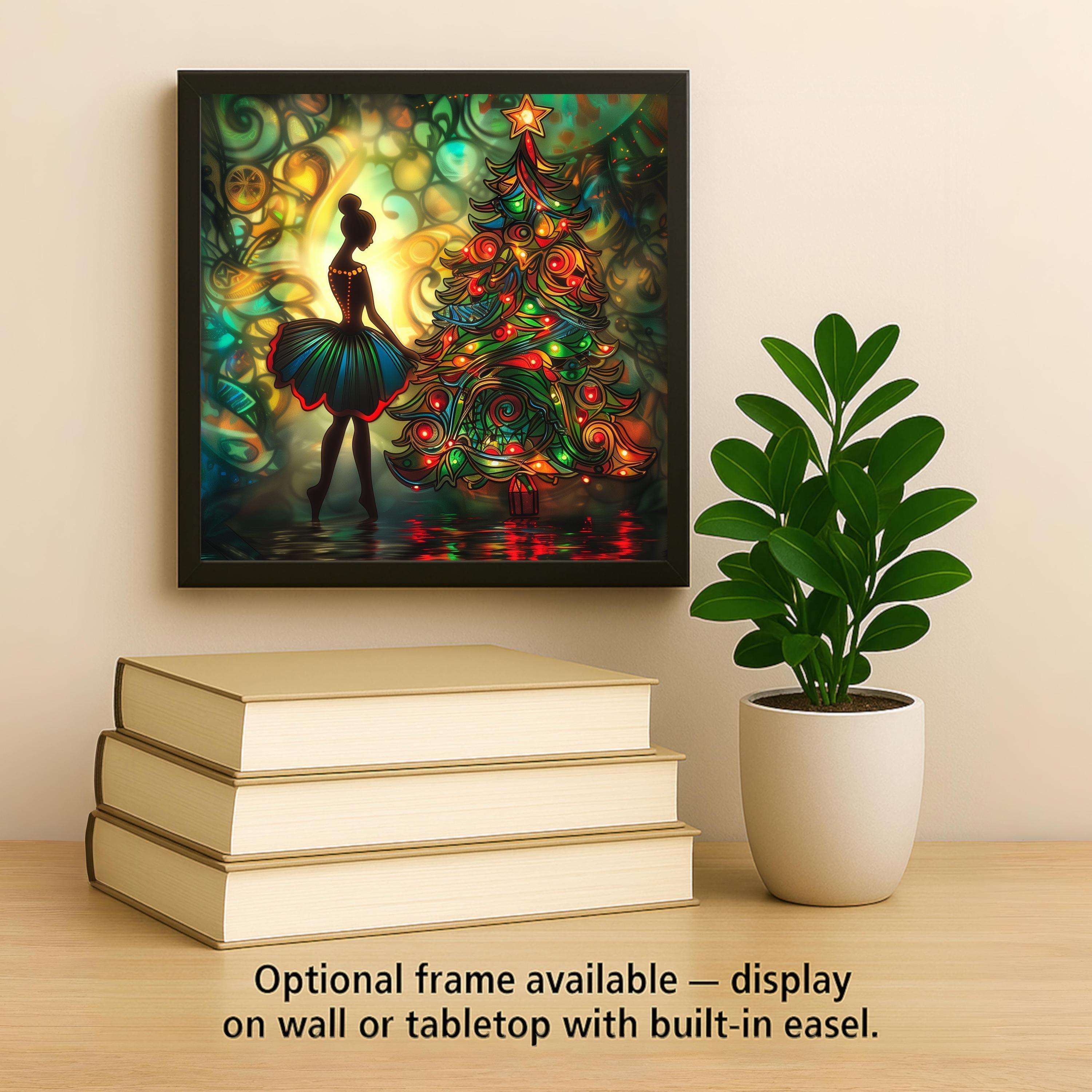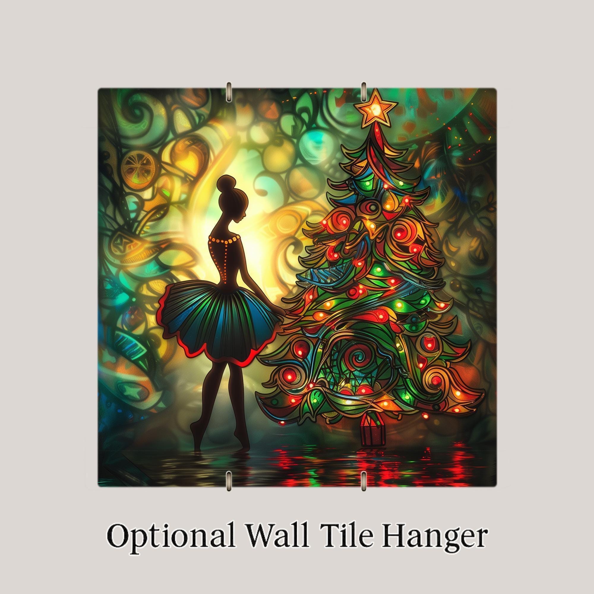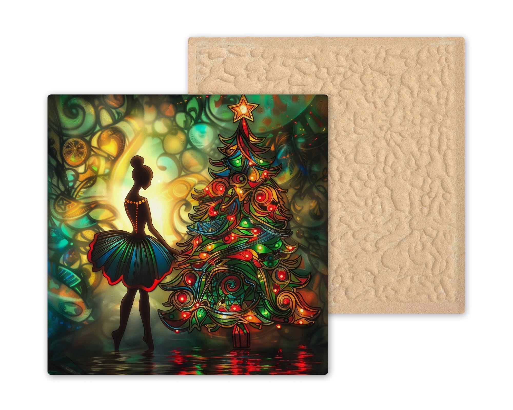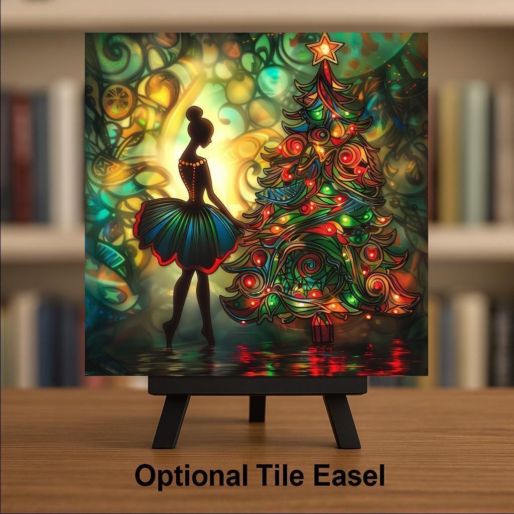 Bring home the enchantment of the season with this stained glass–style ceramic tile featuring a ballerina illuminated by a radiant Christmas tree. Her silhouette glows against the background, creating a sense of elegance and wonder. The swirling ornaments and lights of the tree glow with jewel tones, filling the scene with warmth and celebration. Though it looks like stained glass or mosaic, please note it is not. This design is a permanent print on ceramic tile, designed to replicate the luminous artistry of stained glass in lasting form.