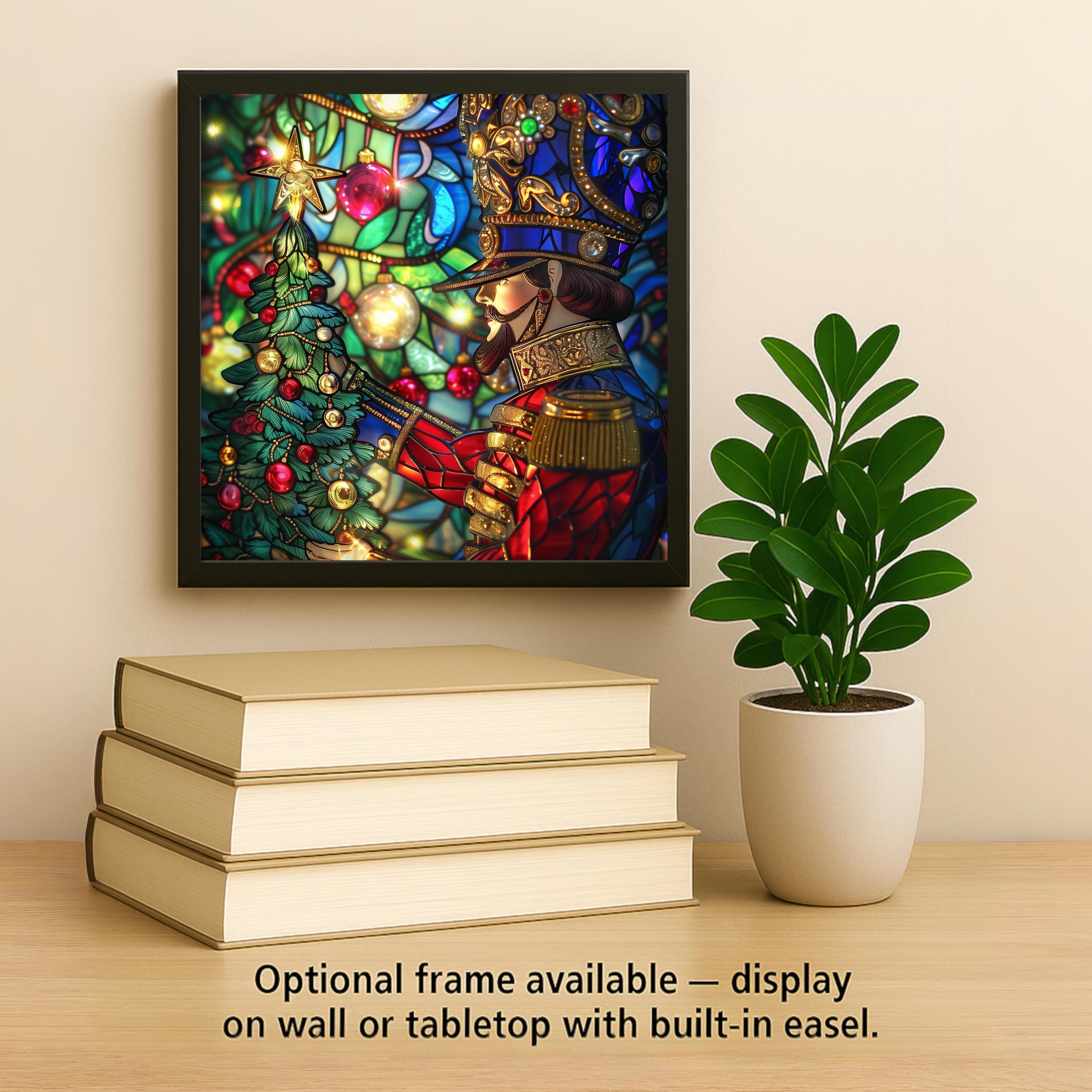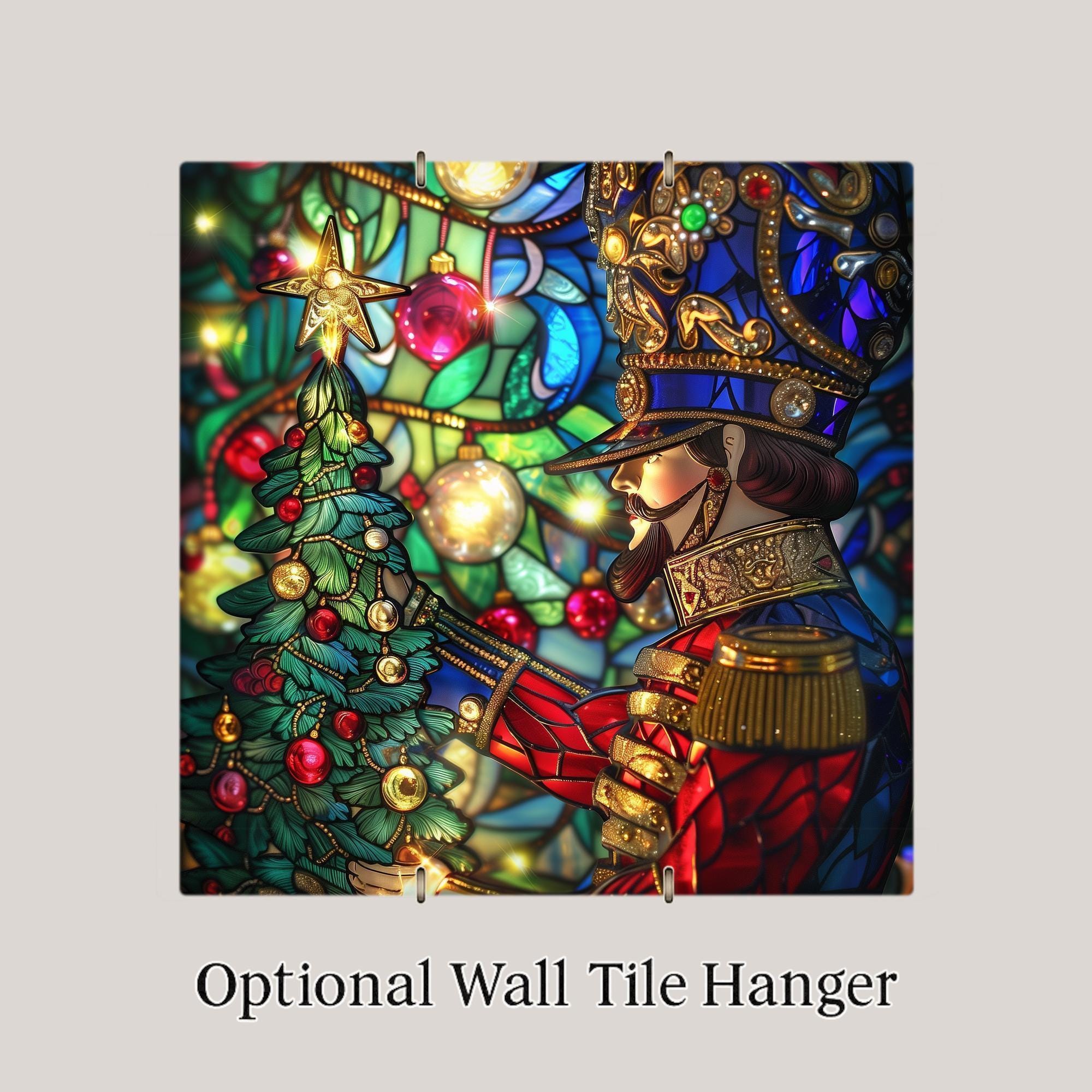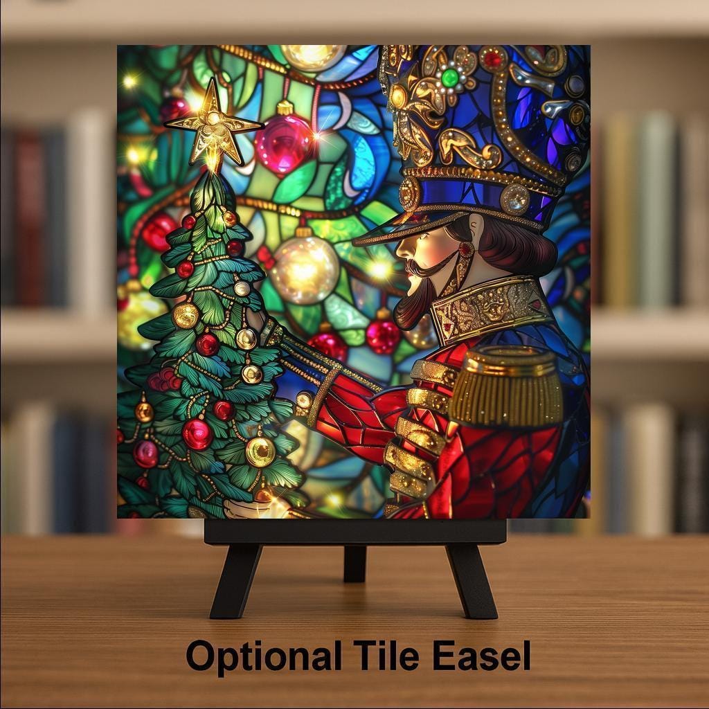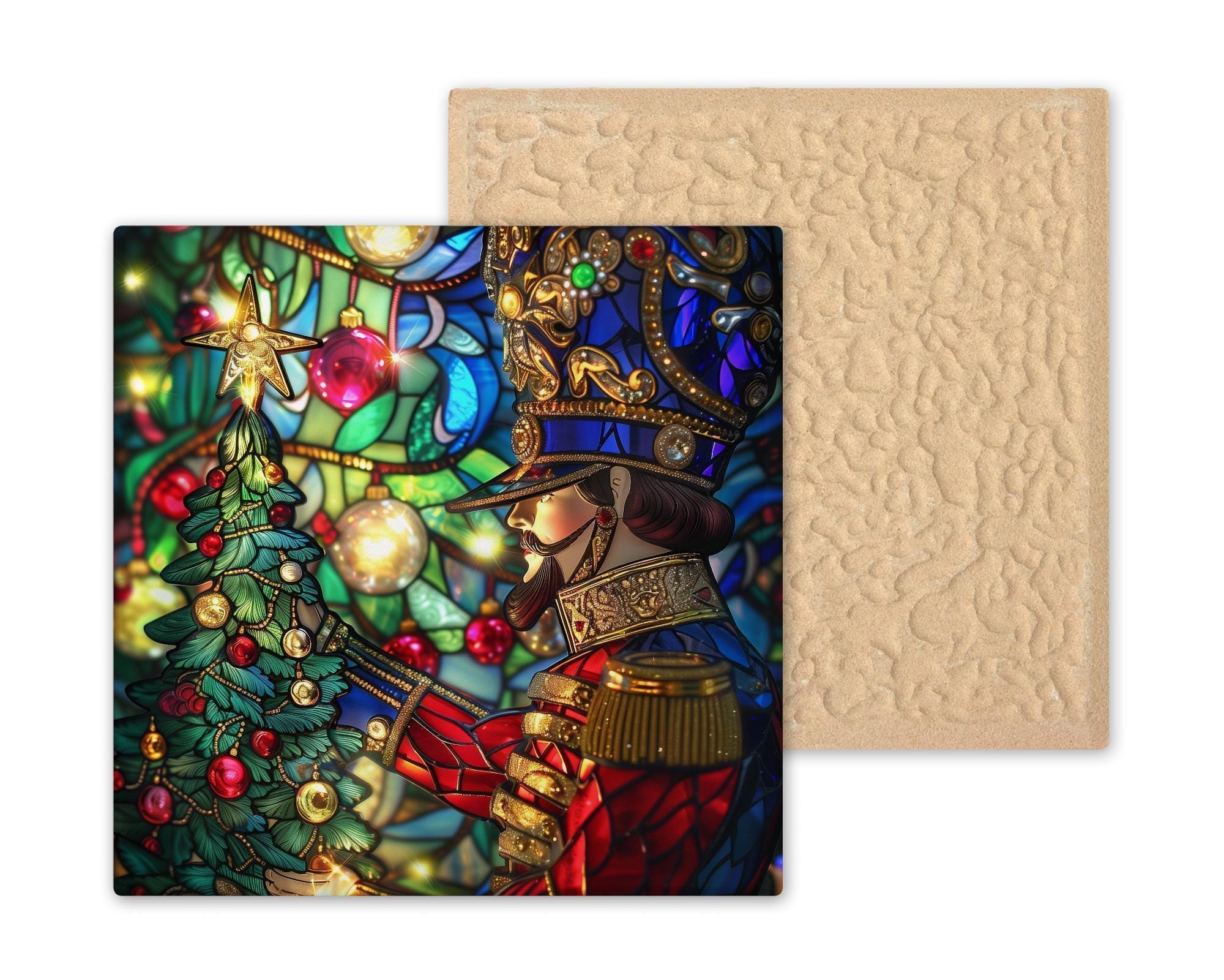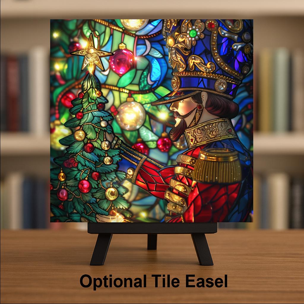 Bring a touch of classic holiday tradition into your home with this stained glass–style ceramic tile featuring a Nutcracker soldier. His ornate blue and red uniform is highlighted with gold accents, while he stands beside a decorated Christmas tree glowing with jewel-like ornaments and a shining star. Though it resembles stained glass or mosaic, please note it is not. This design is a permanent print on ceramic tile, created to capture the luminous artistry of stained glass in lasting form.