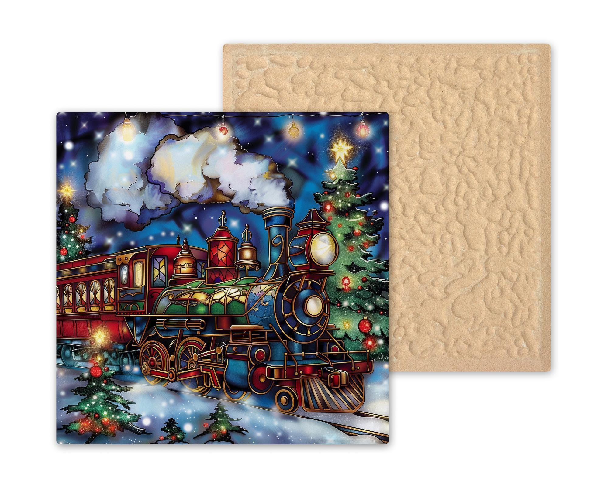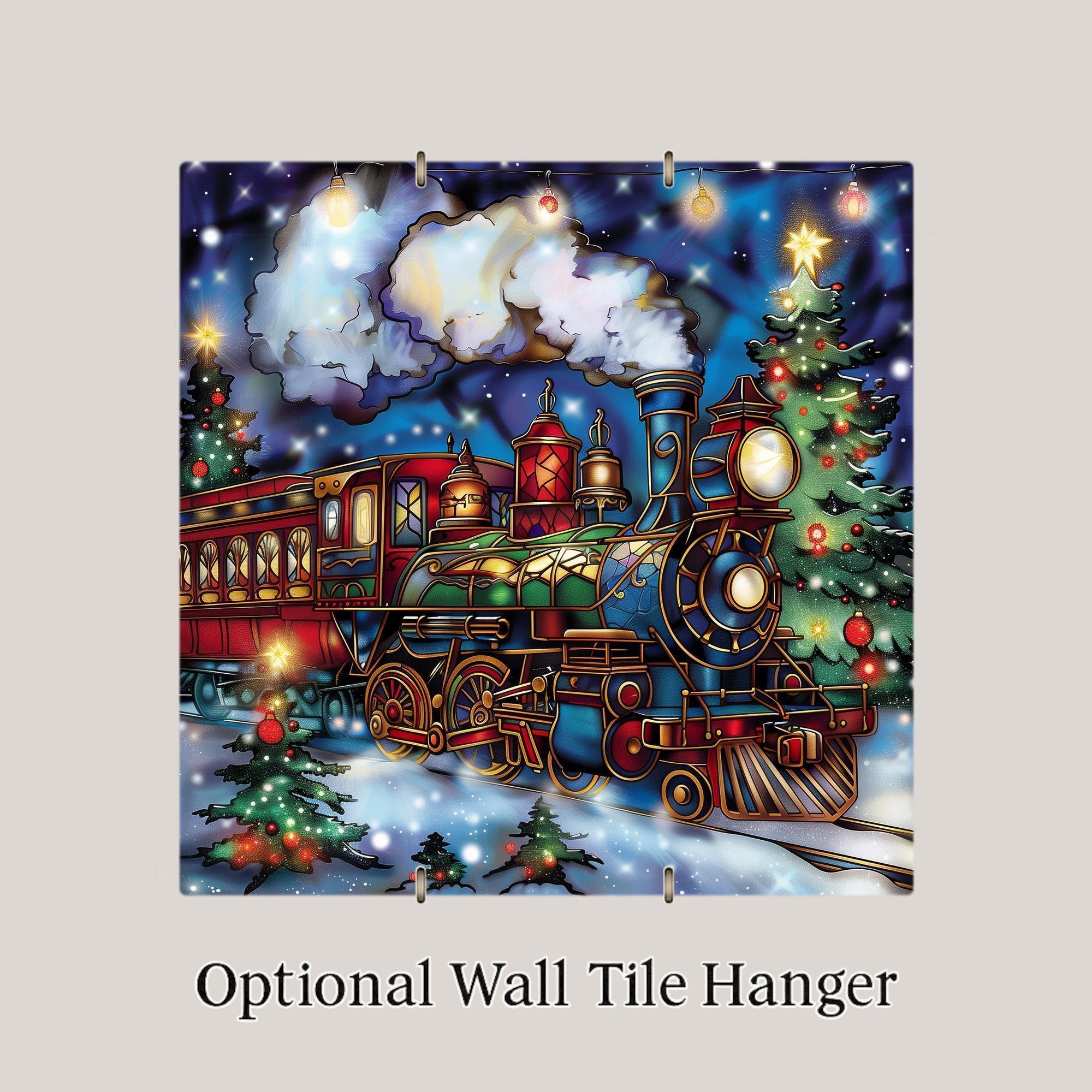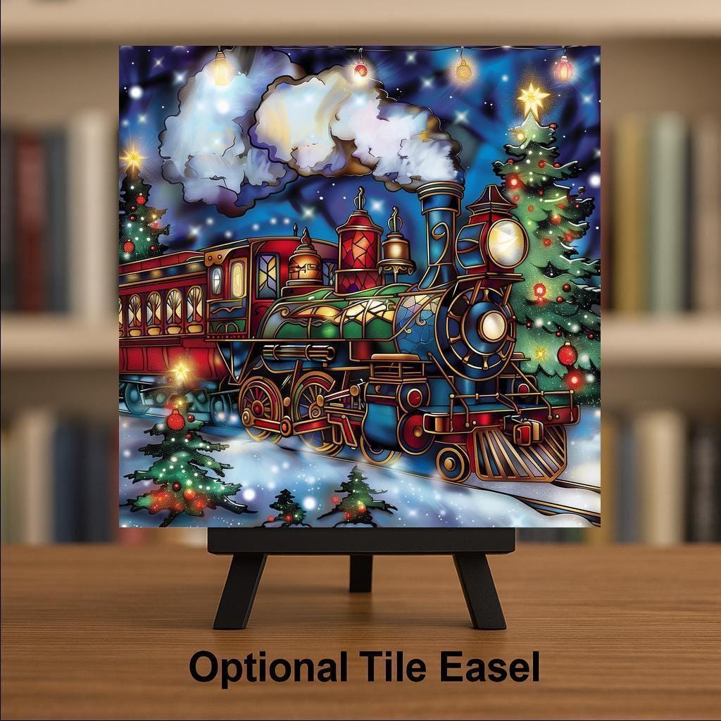 Bring the spirit of Christmas home with this stained glass–style ceramic tile featuring a holiday train surrounded by glowing Christmas trees. The vintage engine shines with radiant color, while a golden star tops a festive tree nearby. The snow-covered ground glimmers under strings of holiday lights, creating a cheerful and magical scene. Though it looks like stained glass or mosaic, please note this design is not. It is a permanent print on ceramic tile, created to capture the brilliance of stained glass in a lasting form.