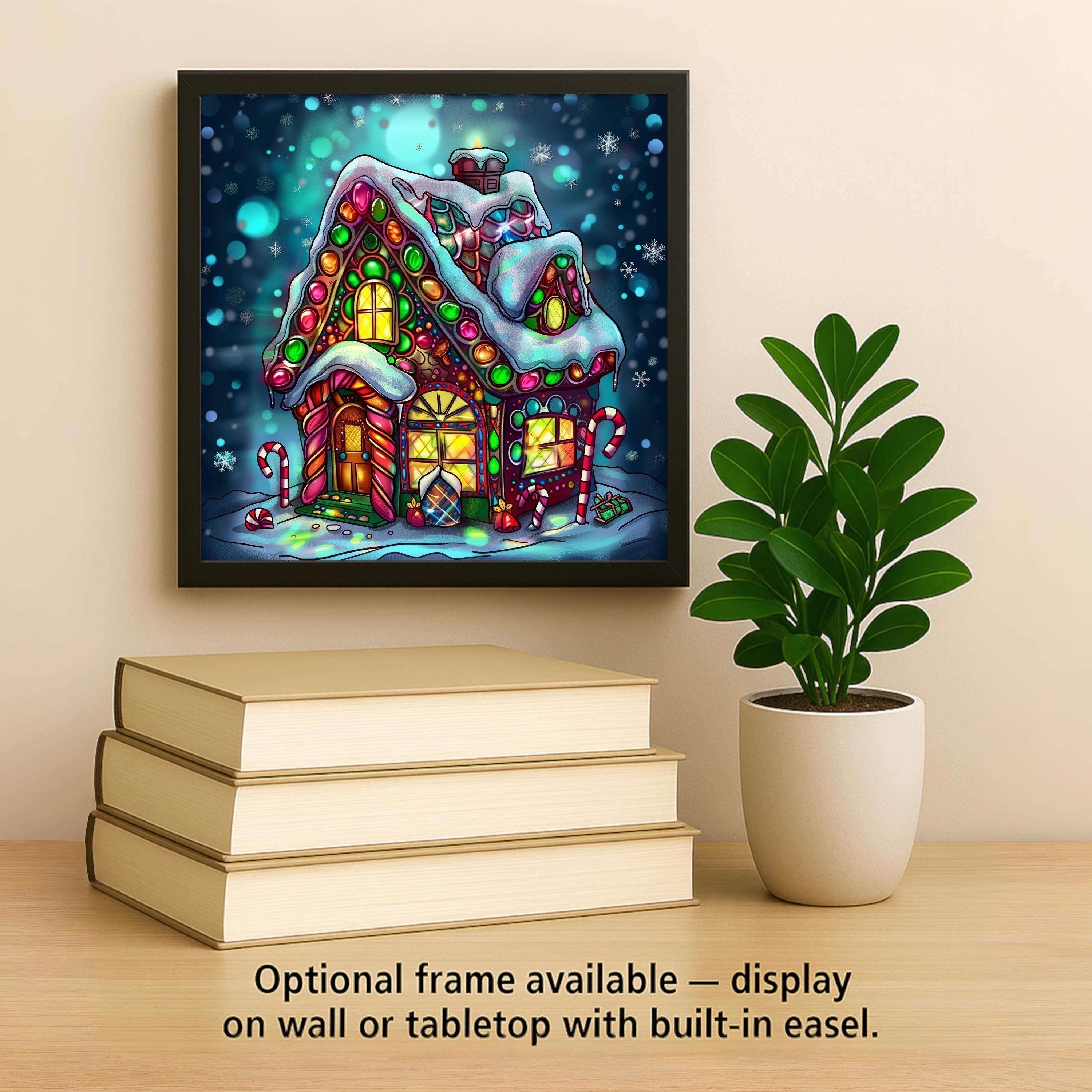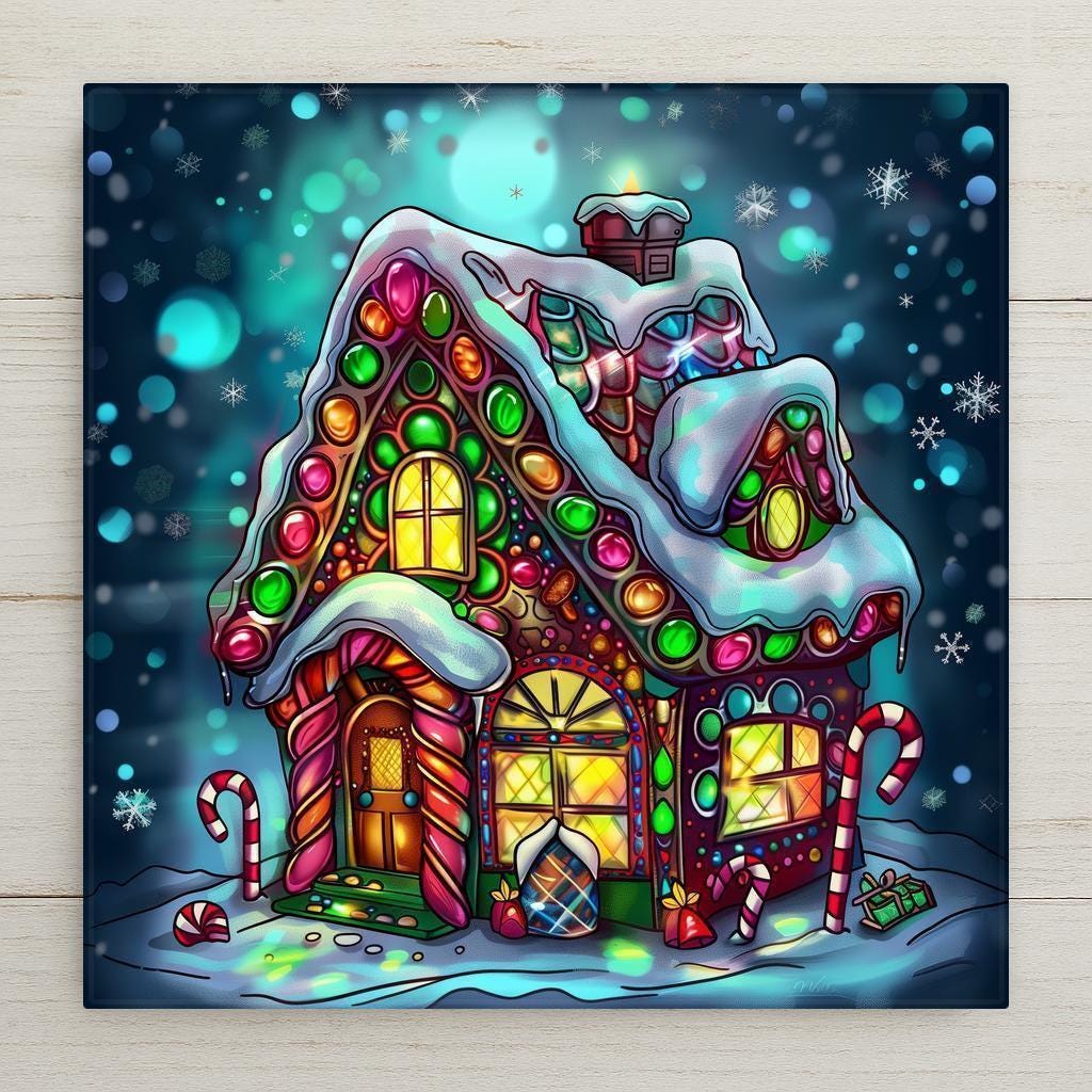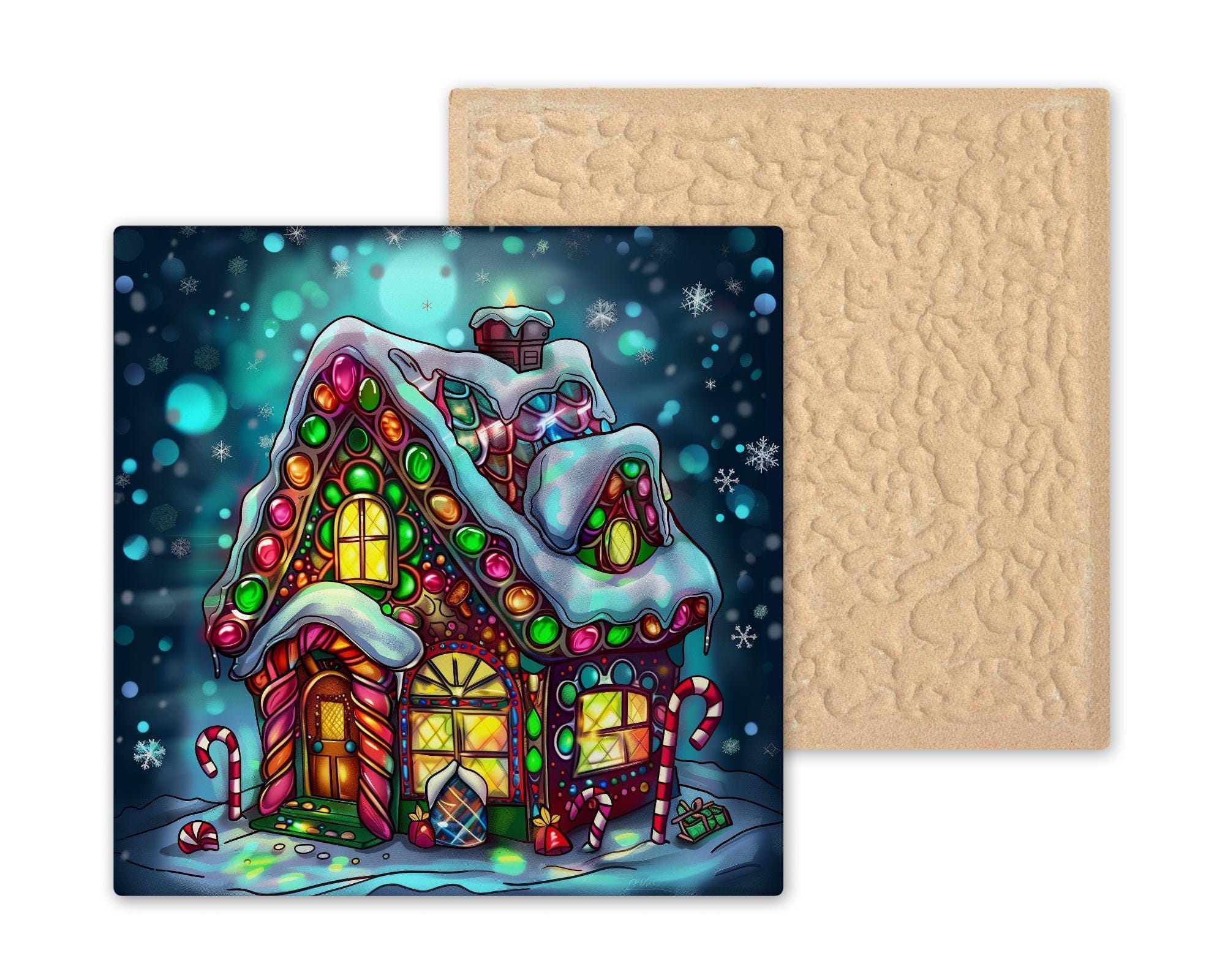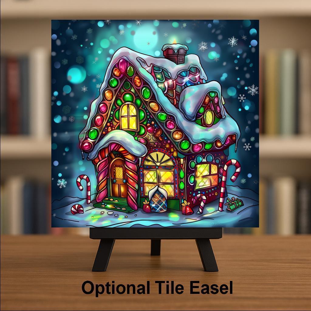 Bring home holiday sweetness with this stained glass–style ceramic tile featuring a festive gingerbread house. Gumdrops, peppermint sticks, and colorful candy details decorate the snowy cottage, while golden windows glow with warmth. A backdrop of twinkling snowflakes completes the scene, adding charm and cheer. Though it may resemble stained glass or mosaic, please note it is not. This artwork is a permanent print on ceramic tile, created to replicate the glowing artistry of stained glass in lasting form.
