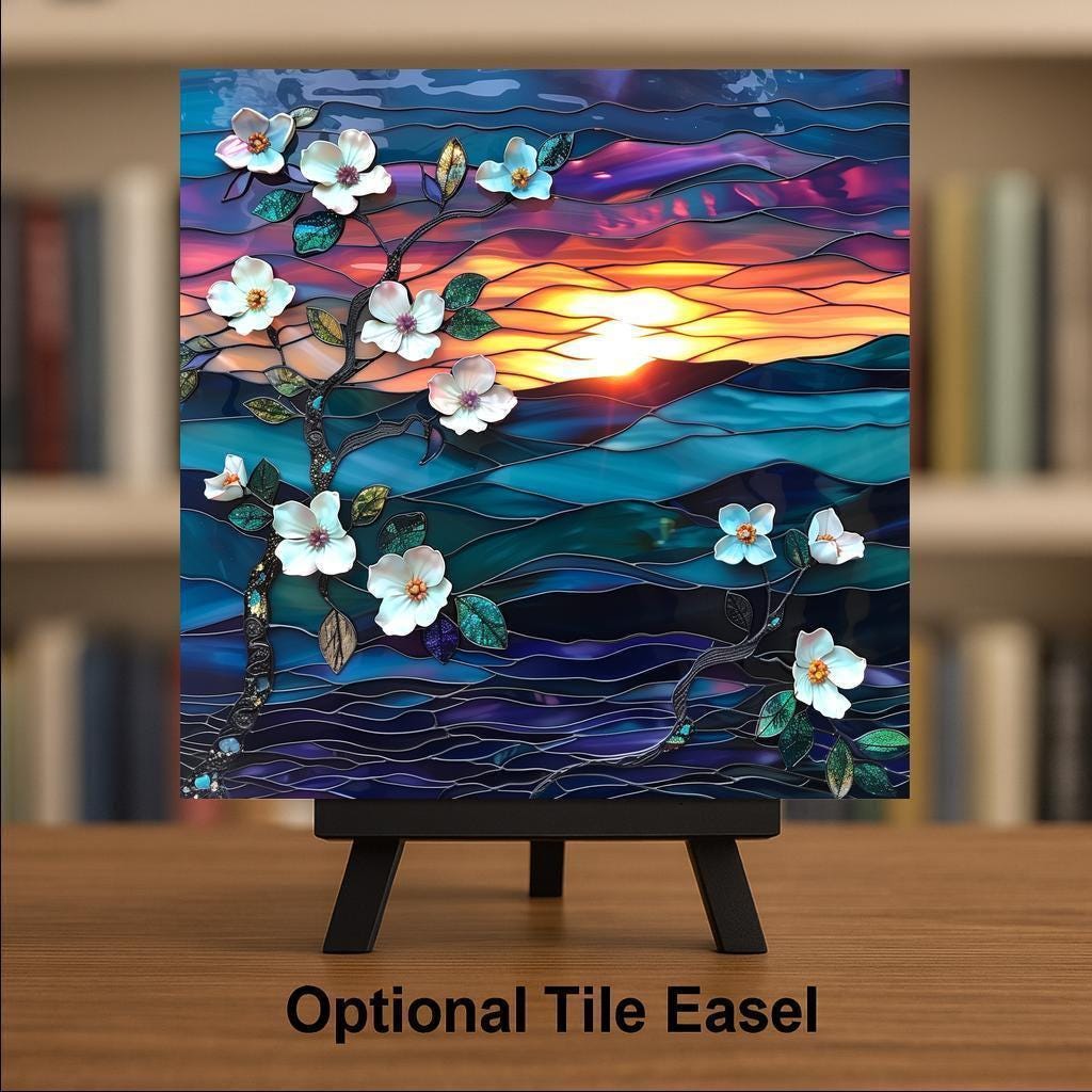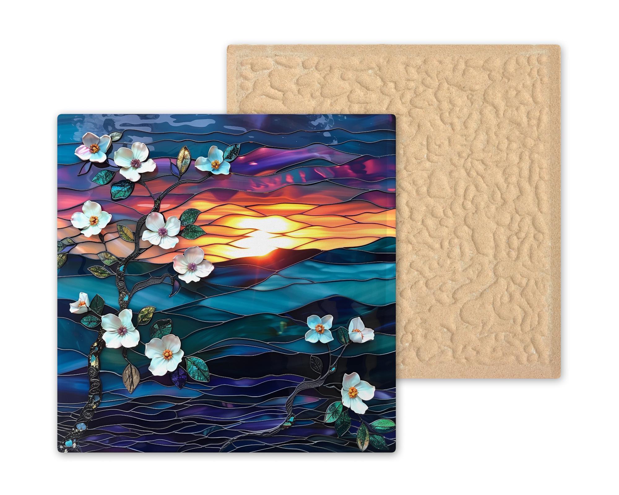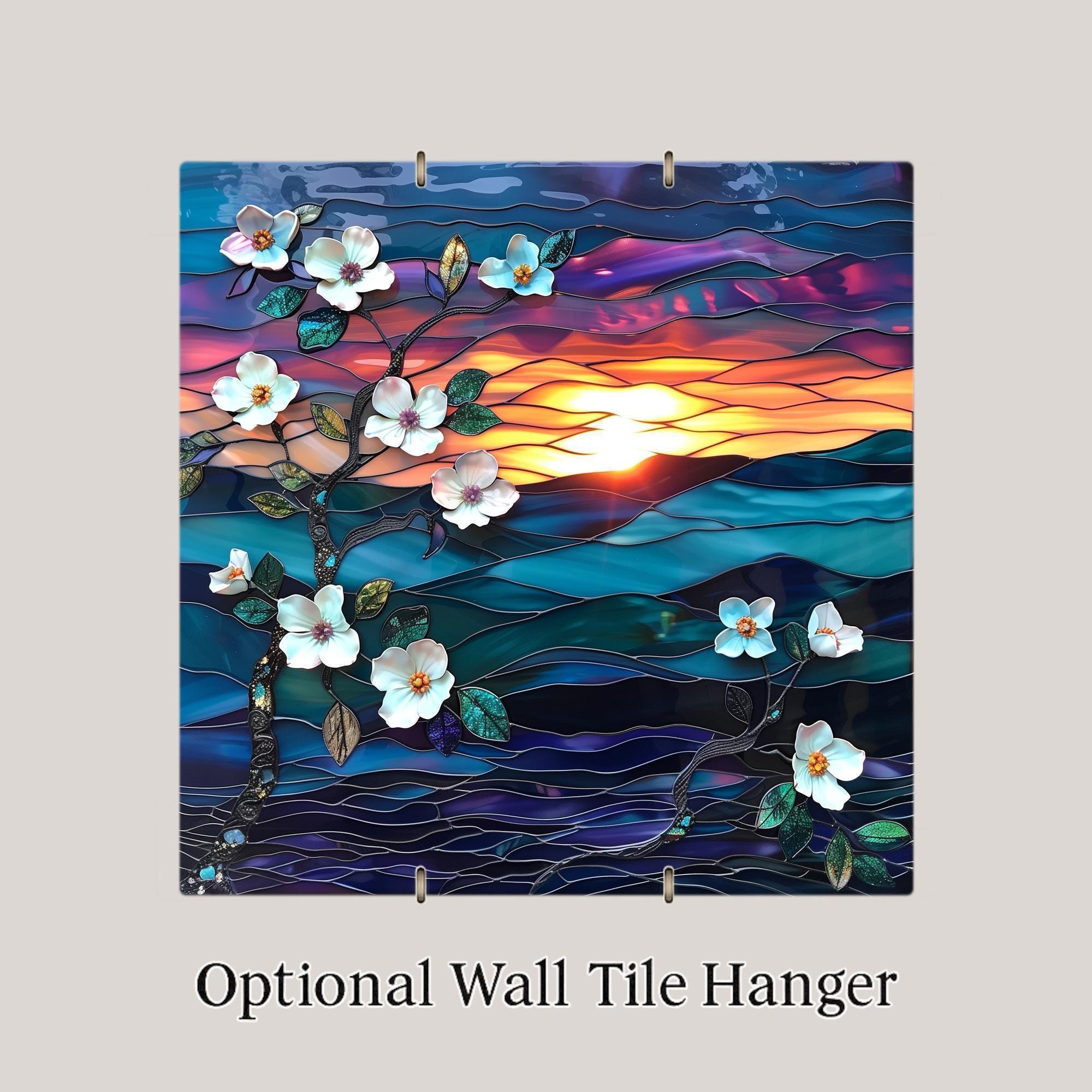 Bring the warmth of the Blue Ridge sunset into your home with this luminous stained glass look ceramic tile. Sculpted dogwood blossoms with raised, dimensional petals stretch across glowing ridges of teal, sapphire, and violet, while a fiery sun sets in the background. The combination of stained glass artistry and ceramic craftsmanship makes this piece a lasting addition to your home décor.