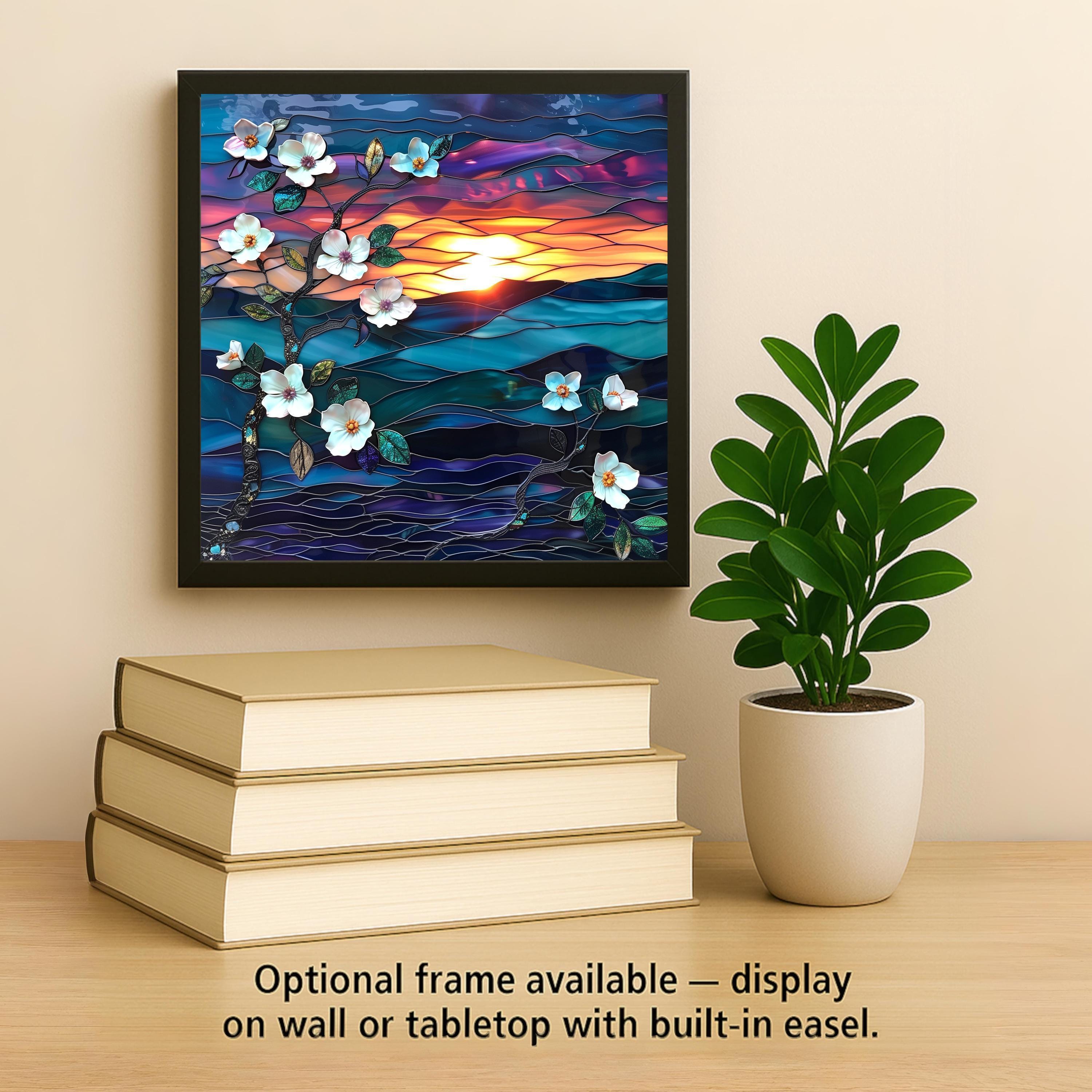 The dogwood, a flower celebrated for its beauty and meaning, creates a focal point that is both symbolic and elegant. Each blossom is detailed with soft pearl tones and golden or violet centers, contrasting beautifully with the vibrant jewel-tone sky. The artistry mimics Tiffany-style stained glass, giving the impression of glowing light and handcrafted detail.