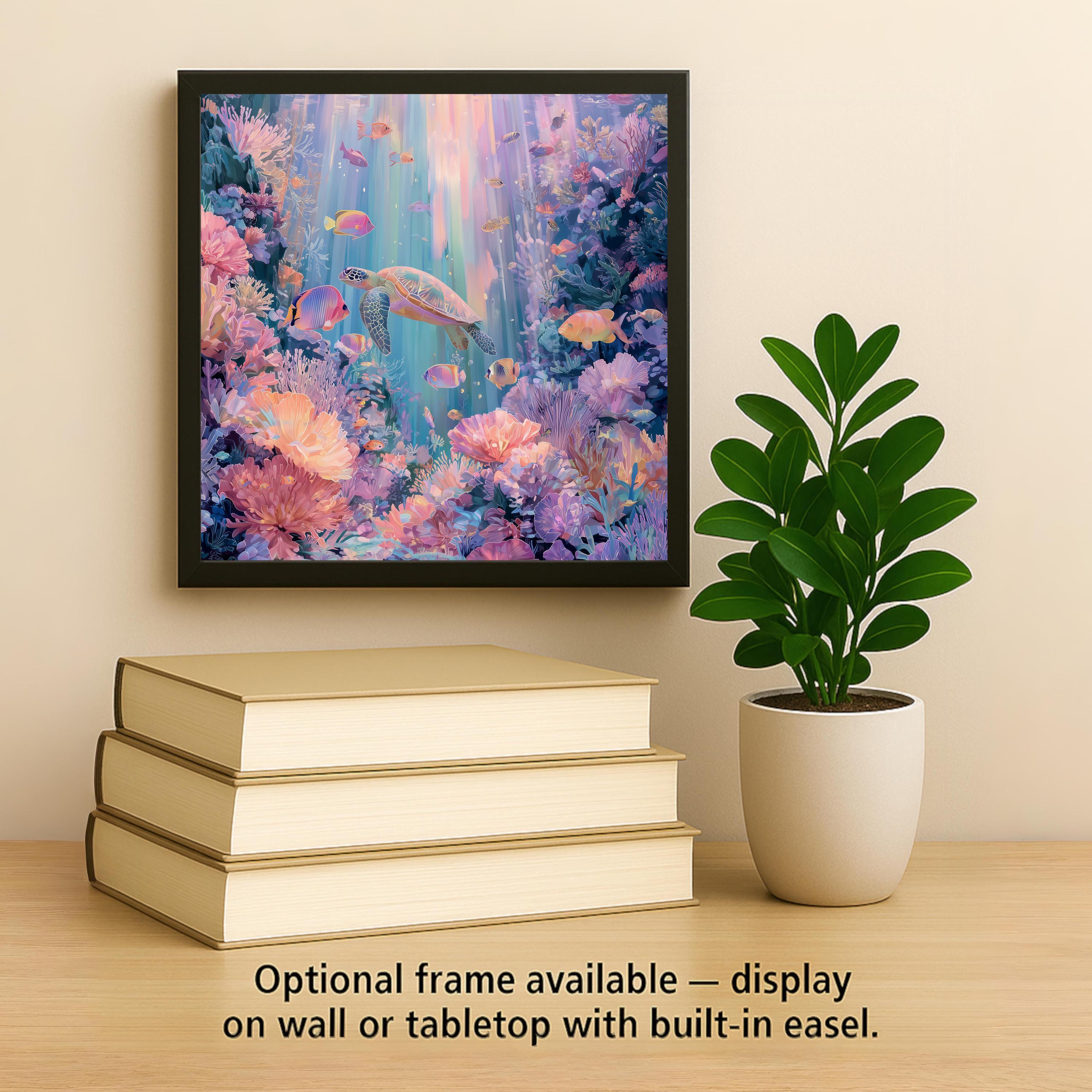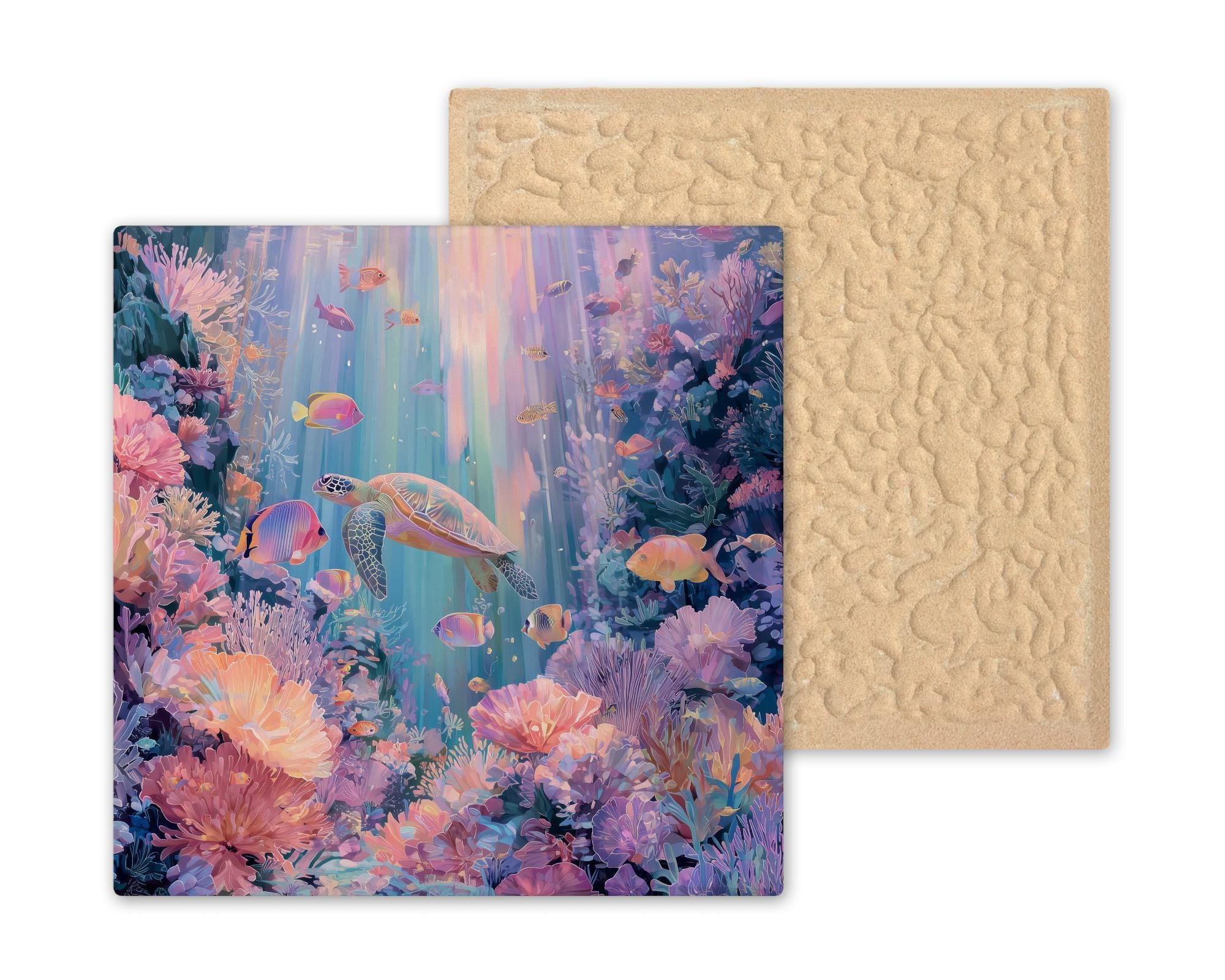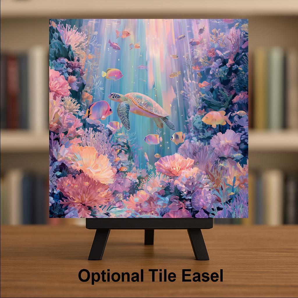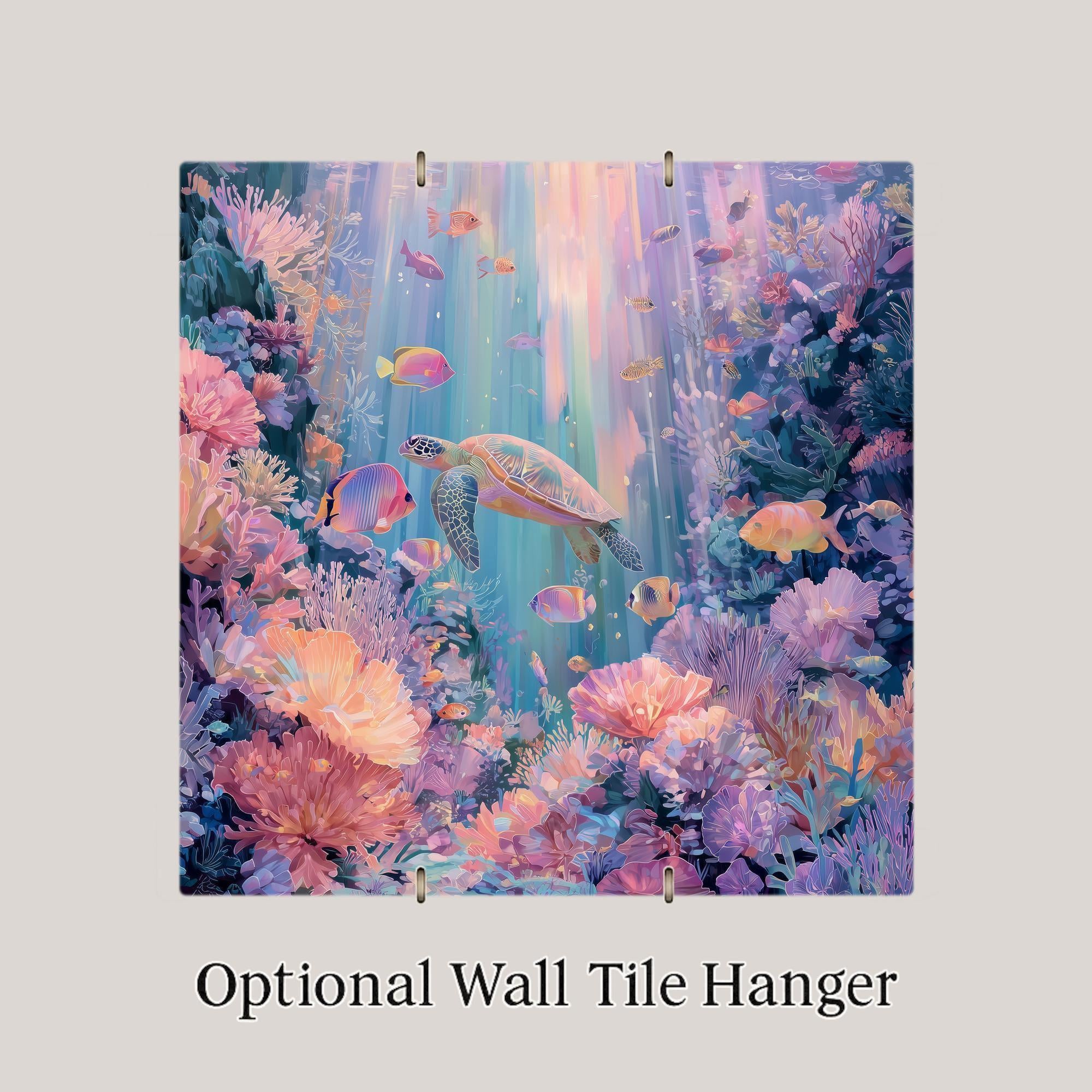 This stained glass style sea turtle wall art ceramic tile captures the beauty of the ocean and the coral reef in a breathtaking design. A peaceful turtle swims among colorful tropical fish while rays of sunlight filter through the water, creating a luminous glow across the reef. The detailed coral formations shine in radiant colors, blending pinks, purples, blues, and oranges into a lively underwater scene. This coastal wall art is a perfect choice for ocean lovers, beach house decor, or anyone who finds peace in sea life. It is both calming and uplifting, bringing the energy of the ocean directly into your space. Display it as wall art in your bathroom, living room, or bedroom for a coastal escape. It also makes a unique nautical accent for an entryway, office, or gallery wall. The stained glass effect is rich and glowing, giving the appearance of light passing through a radiant window. This design is ideal for those who enjoy snorkeling, scuba diving, or simply the joy of seeing sea turtles and fish in their natural habitat. It makes a thoughtful gift for beach cottage owners, turtle enthusiasts, or ocean conservation supporters. Its style fits a wide range of coastal and nautical themes. Pair this tile with other ocean wall art for a complete underwater gallery. The luminous design ensures it stands out while blending with seaside decor. Enhance your home with this glowing turtle and reef tile and celebrate the timeless beauty of the sea. Optional add-ons such as a tile wall hanger, easel tile stand, or cork backing are available.