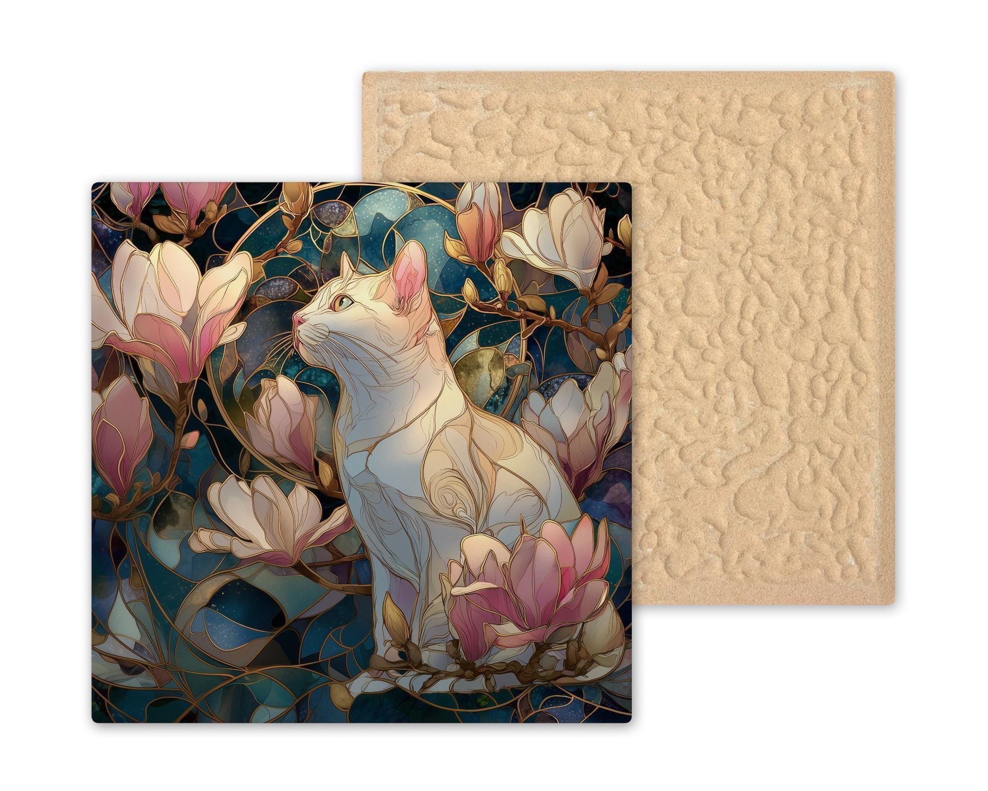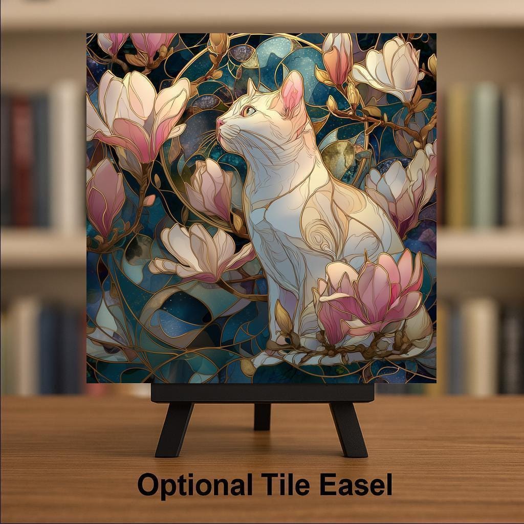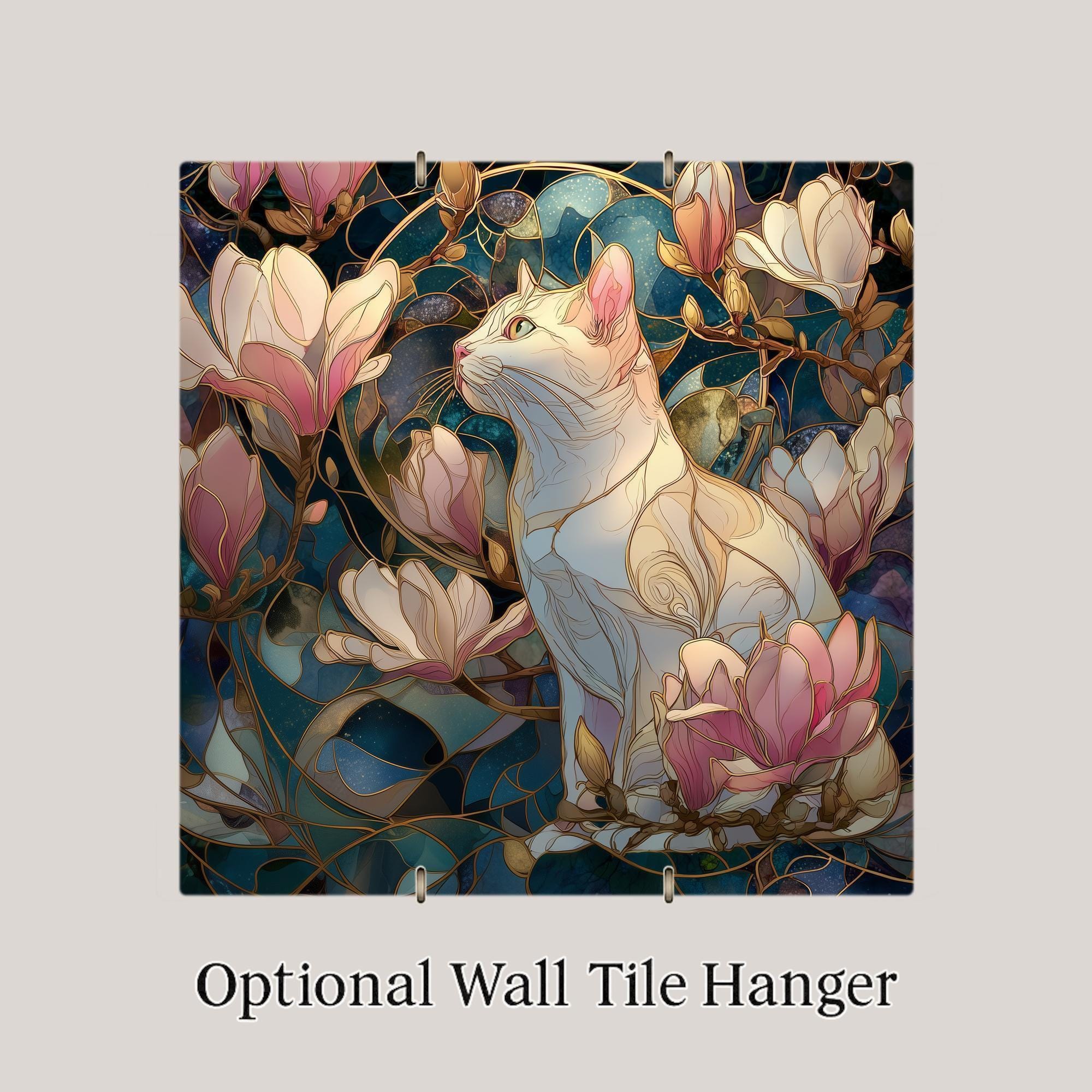 This stained glass style cat and magnolia ceramic tile wall art brings elegance and serenity to your home decor. A white cat rests gracefully among blooming magnolia flowers, bathed in the glow of golden outlines and rich jewel tones. The stained glass effect makes the blossoms shimmer in shades of soft pink, cream, and lavender, contrasting beautifully with a deep night sky background.