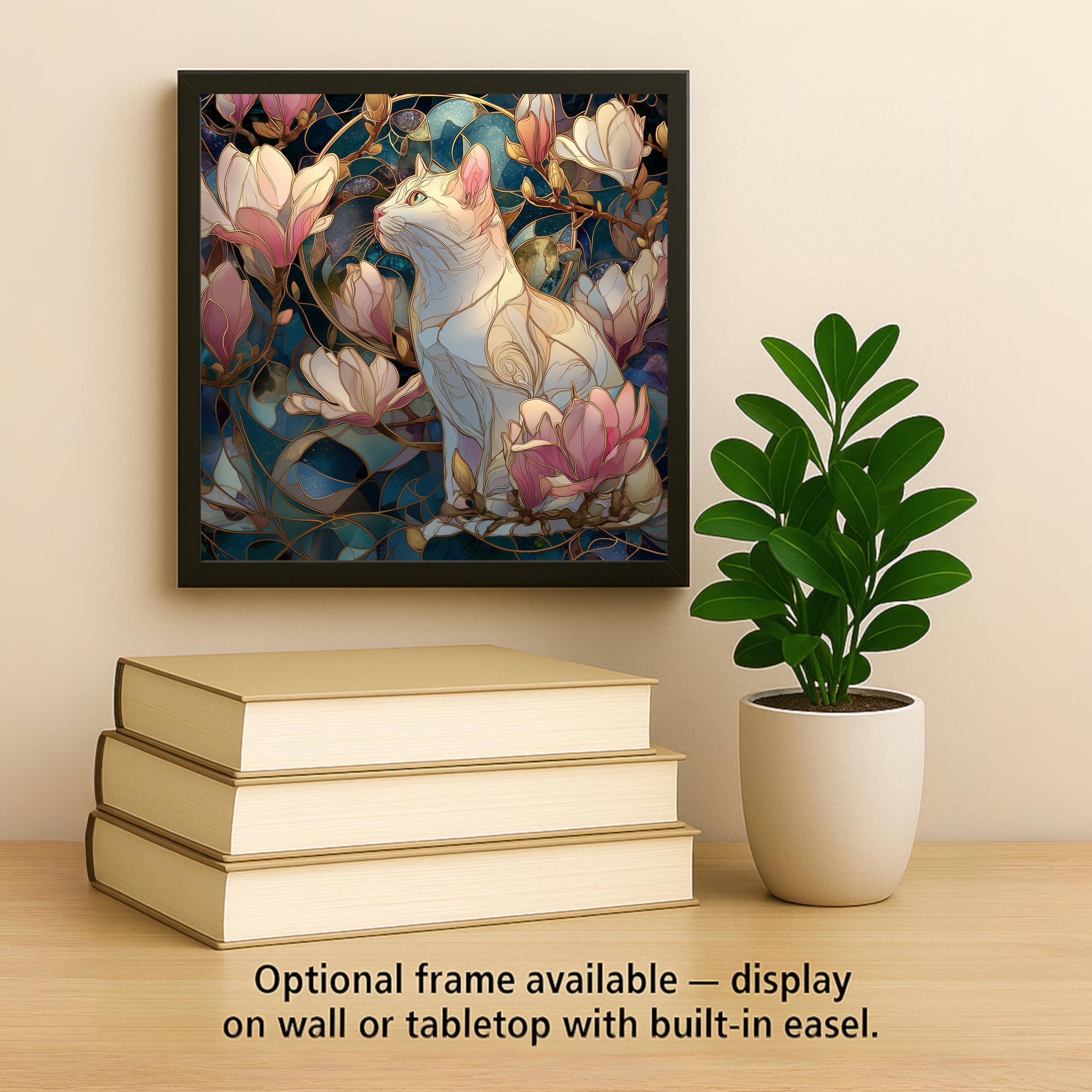 Perfect for cat lovers and flower enthusiasts, this artwork combines two timeless themes—feline charm and floral beauty. The magnolia symbolizes renewal and strength, while the cat embodies curiosity and calm. Together, they create a design that is both meaningful and inspiring.
