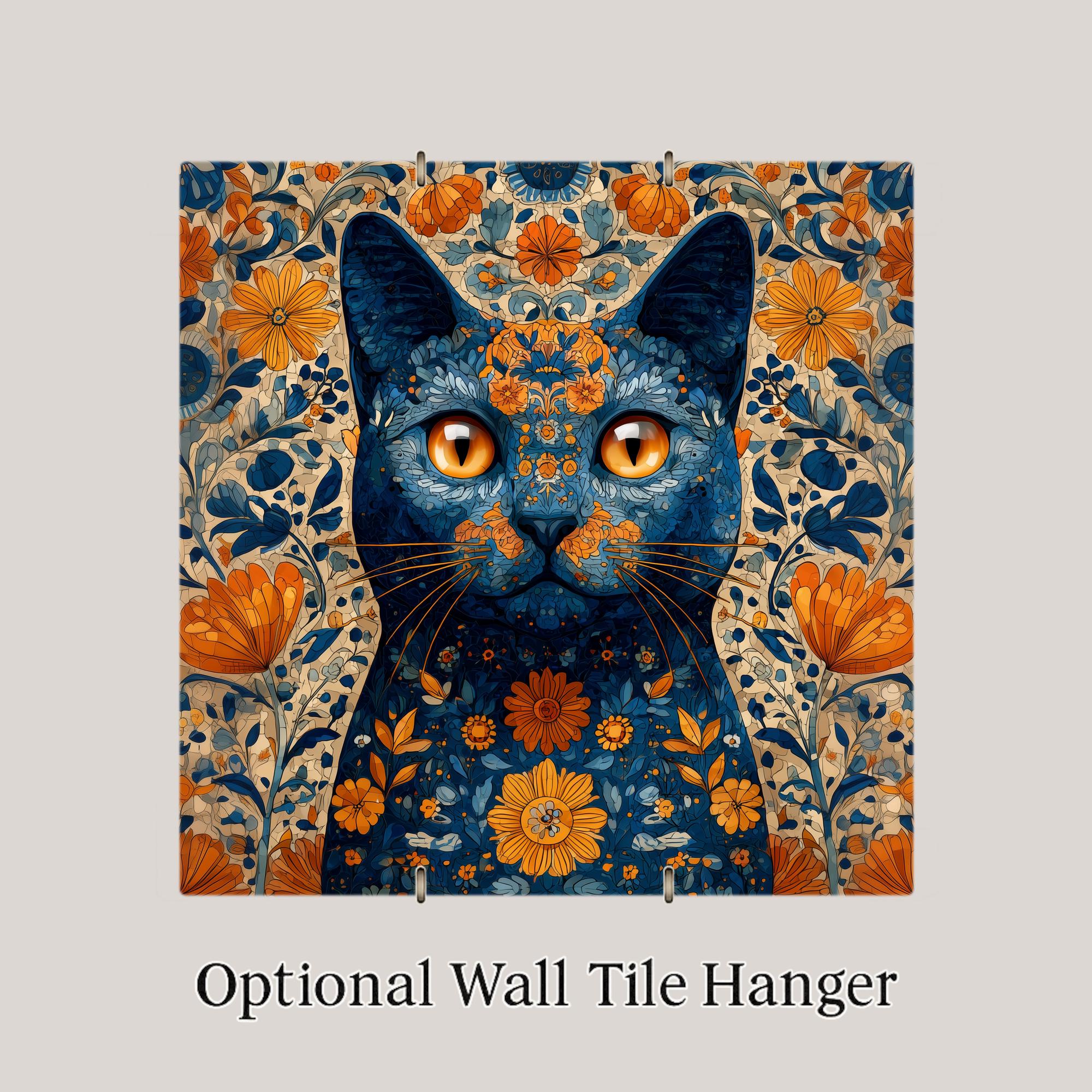 Bring a bold mix of color and charm into your home with this stained glass style floral cat ceramic tile wall art. The design features a cat covered in intricate floral patterns, blending deep blues with glowing orange blooms. Golden eyes shine with intensity, giving the cat an expressive and captivating look. The floral details transform the cat into a living mosaic of nature, making the artwork both whimsical and striking.