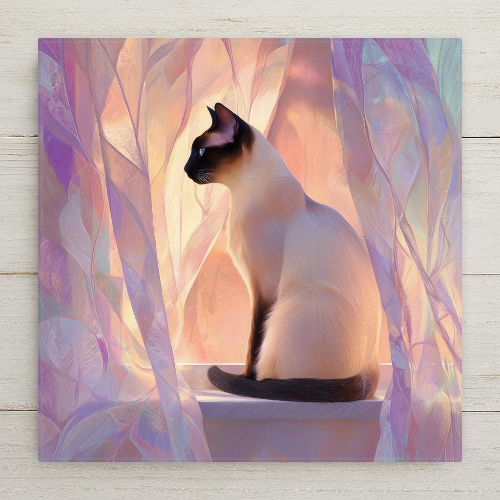 This Siamese cat wall art ceramic tile combines feline beauty with luminous stained glass style design. The cat sits proudly on a windowsill, framed by flowing pastel curtains that glow with shades of lavender, blush, and amber. The artwork captures a quiet, contemplative moment, making it ideal for adding warmth and tranquility to your home.