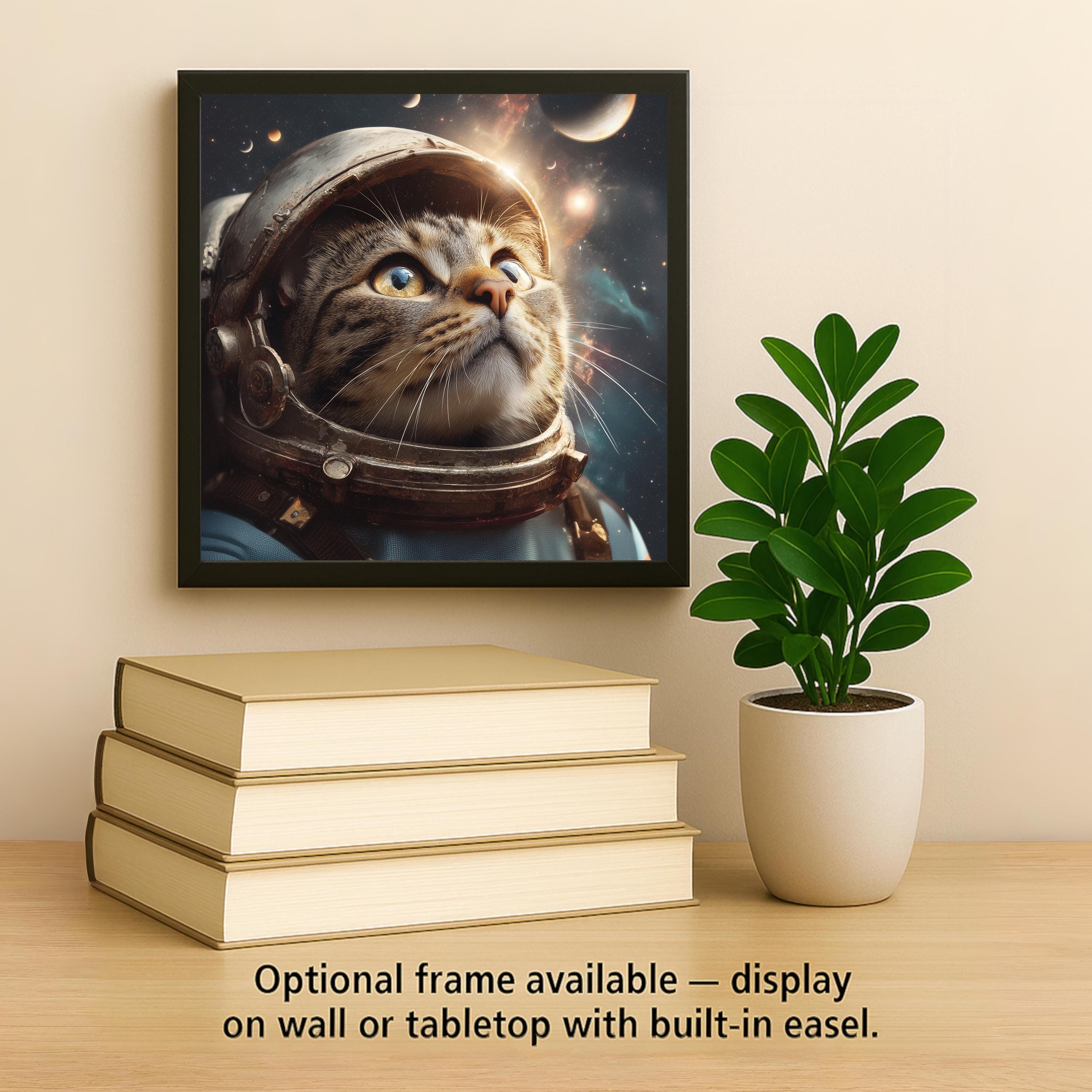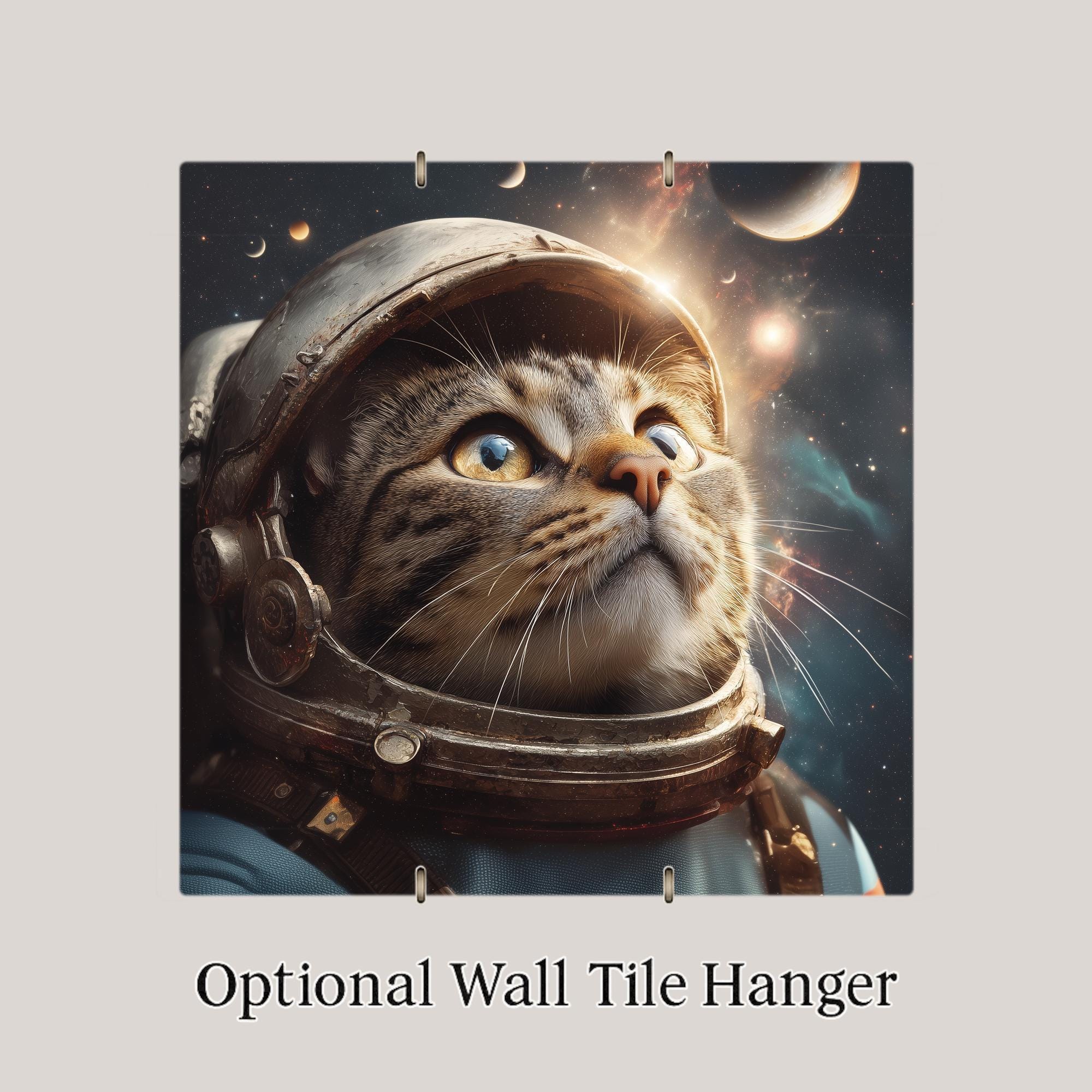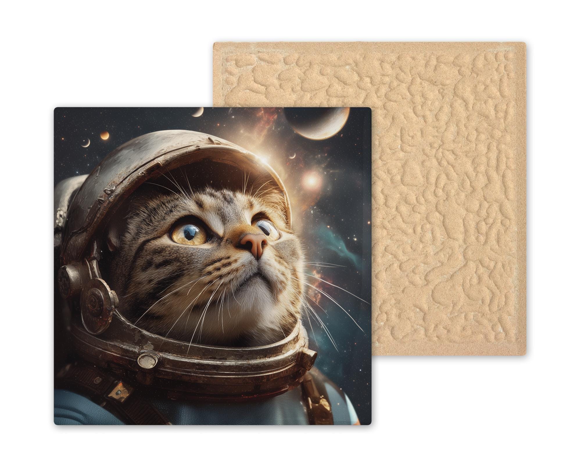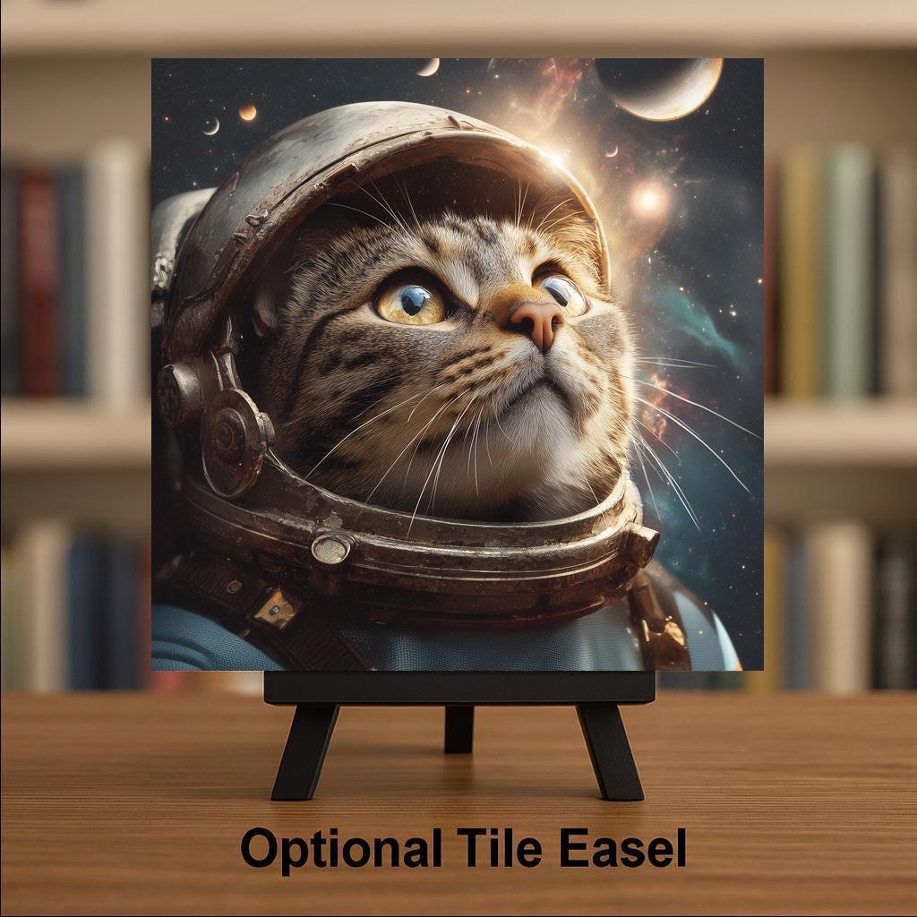 This astronaut cat ceramic tile was designed for the cat lover who also loves space — a buyer community larger than it sounds. The intersection of cat art collectors and science fiction/space enthusiasts is a passionate niche that wants cat art with genuine imagination rather than just another portrait. The cosmic palette and spacesuit design give this tile a visual drama that makes it a genuine conversation piece wherever it hangs.