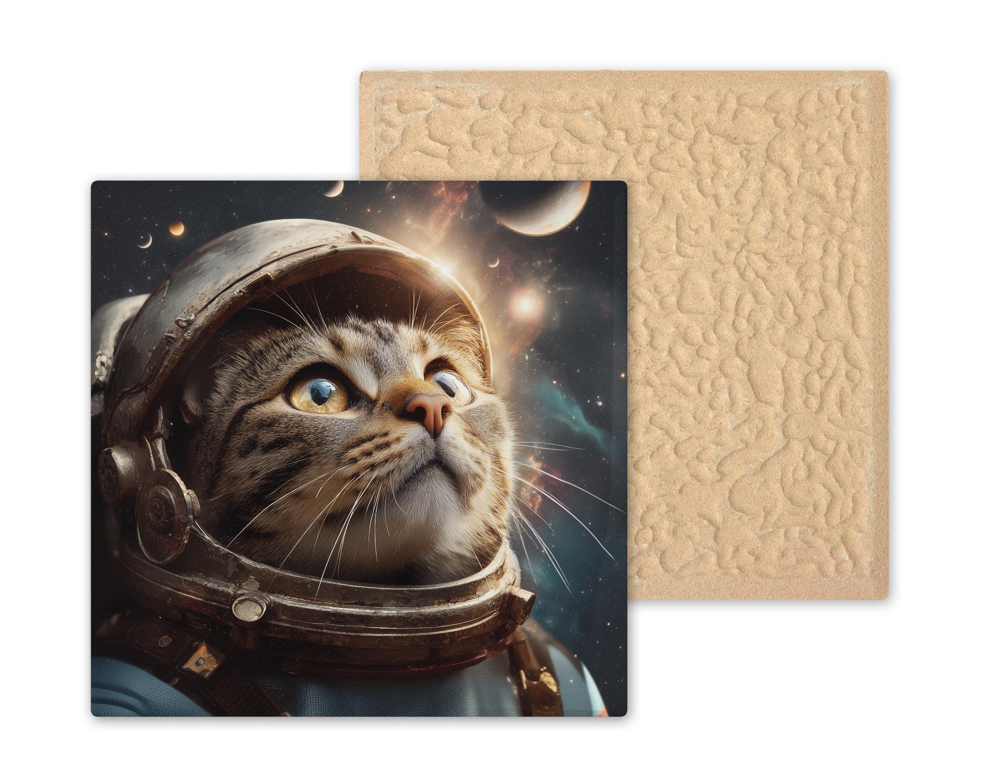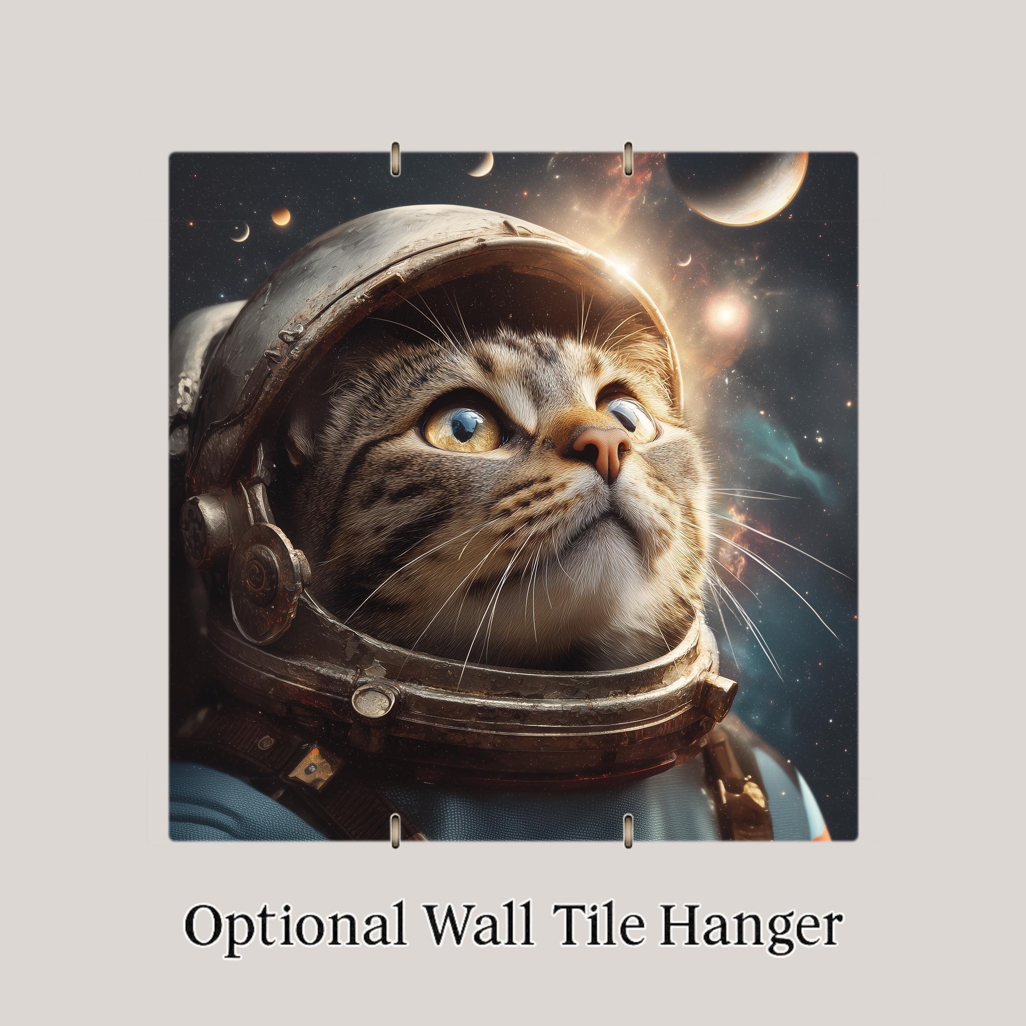 Celebrate your love for both cats and the cosmos with this glowing astronaut cat tile. Its imaginative design ensures it will remain a favorite in any home. Optional tile wall hanger, easel tile stand, or cork backing are available for flexible display options.