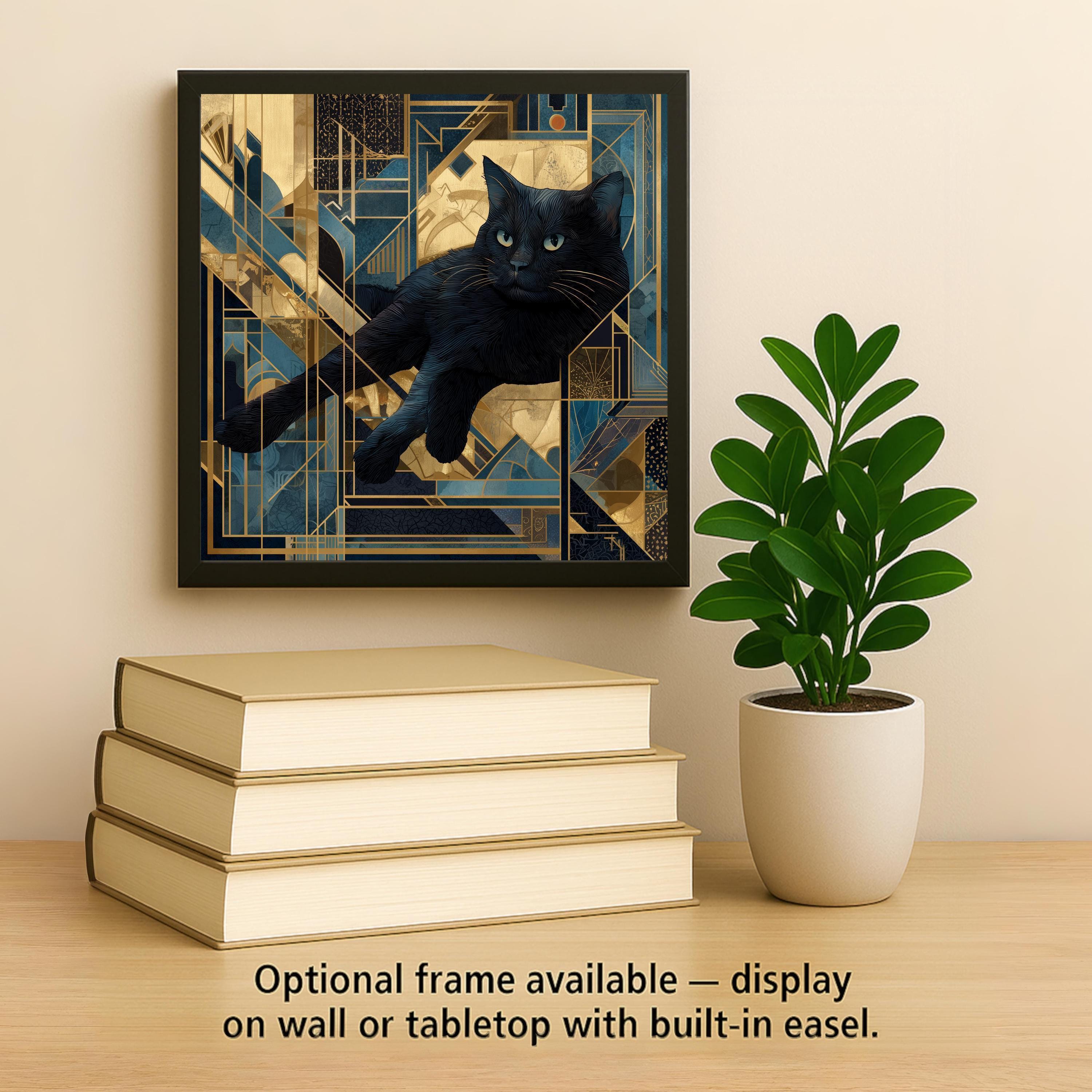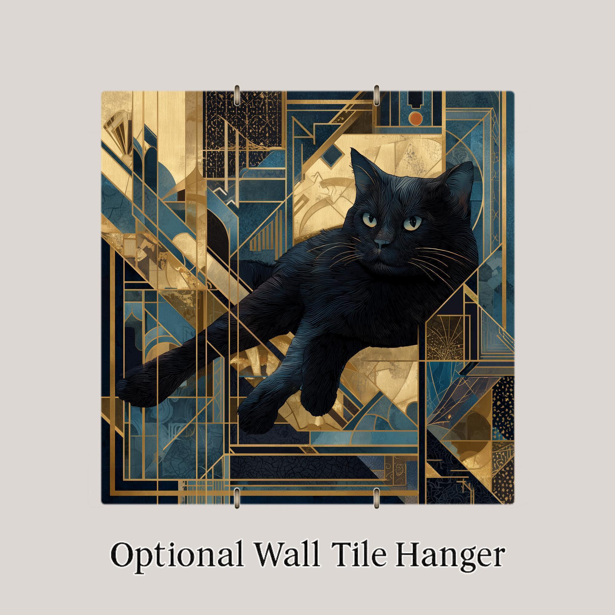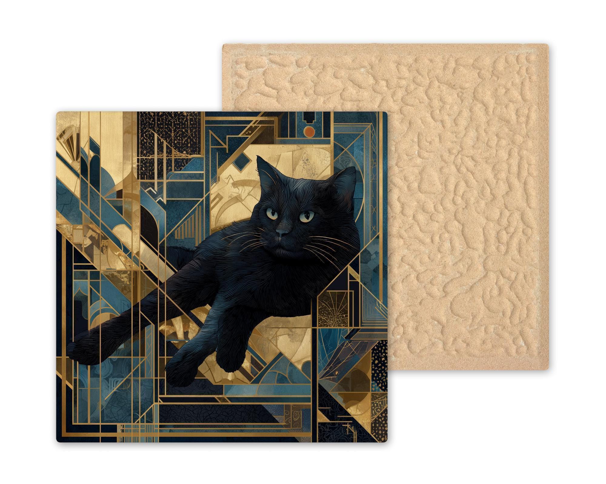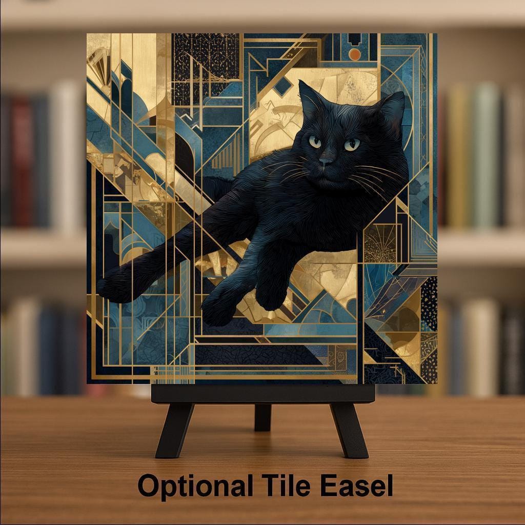 Ideal for lovers of cats, vintage design, and modern decor, this tile brings bold elegance into any home. The contrast between the dark feline form and the golden geometry creates a radiant effect, while the deep blues and metallic accents add richness and texture.