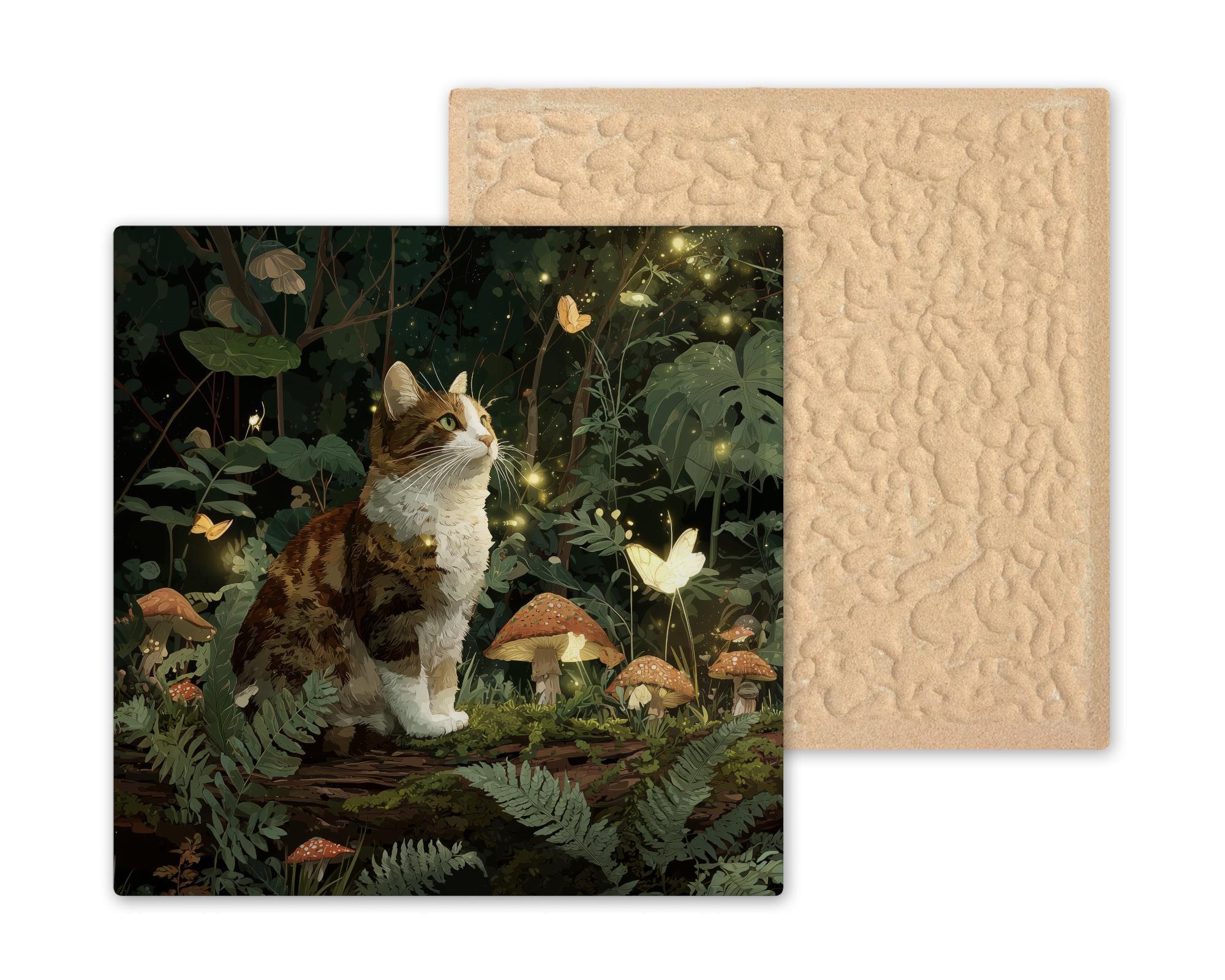 This tile is an excellent gift for cat owners, fairy-forest lovers, cottagecore fans, and anyone who appreciates peaceful fantasy scenes. The warm glow of the fireflies and the serene pose of the cat make it perfect for reading corners, craft rooms, bedrooms, and cozy living areas.