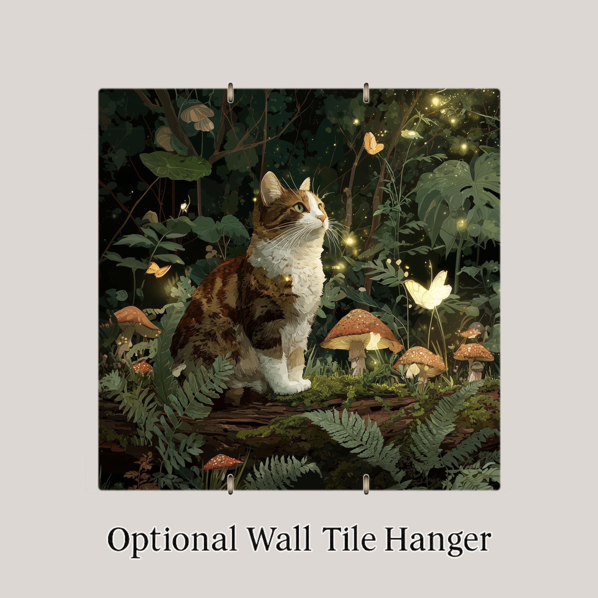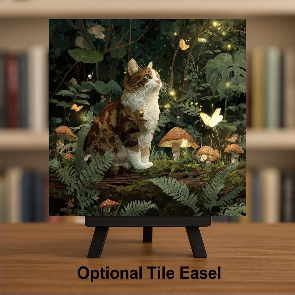 This woodland-themed ceramic tile captures a peaceful moment of a curious calico cat exploring an enchanted forest. Fireflies glow around her, butterflies float in the warm night air, and clusters of mushrooms illuminate the scene with soft golden light. The deep greens, rich browns, and gentle highlights create a cozy, magical setting perfect for anyone who loves cats, nature, or fantasy art.