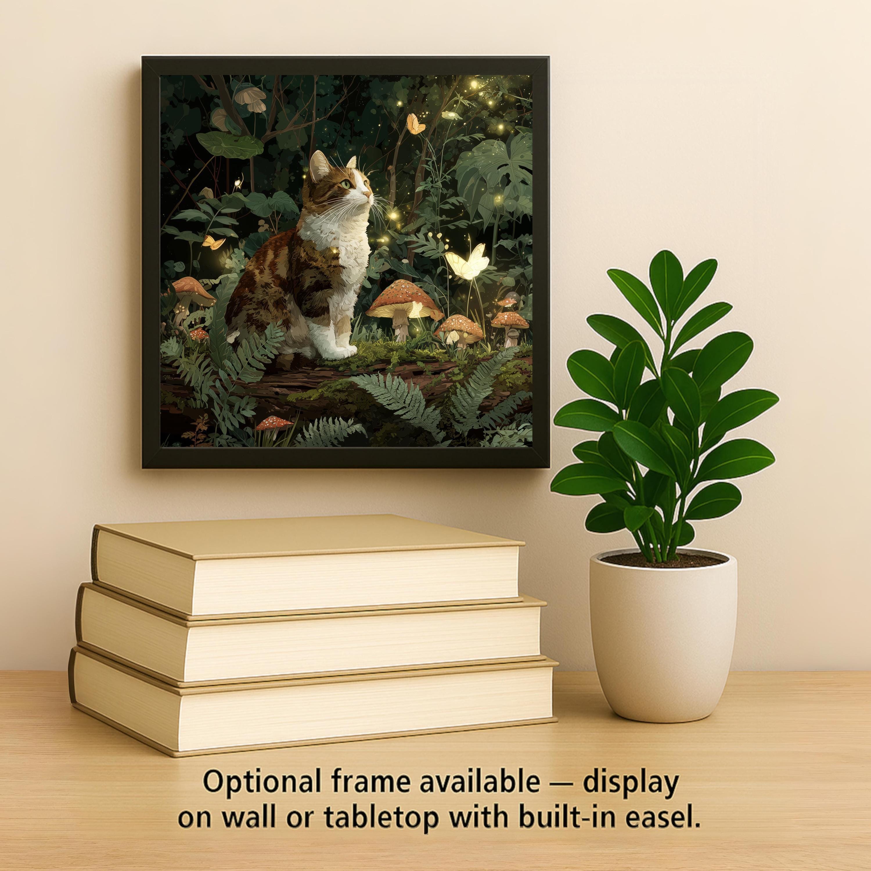 Bring a soft, magical atmosphere into your home with this enchanted forest cat artwork.