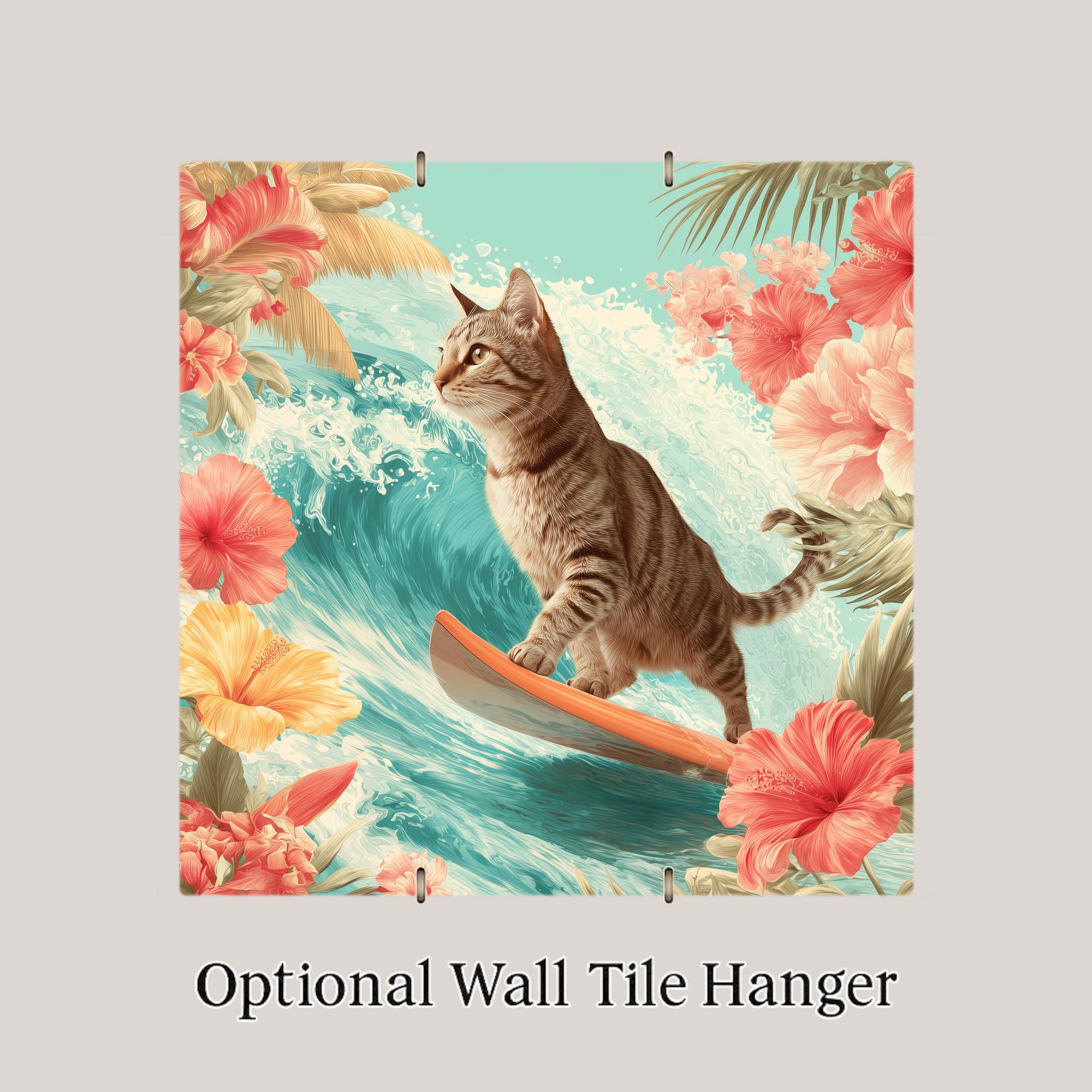 The design symbolizes fun, freedom, and playfulness, blending feline charm with a love for the ocean. It also makes a thoughtful gift for beachgoers, surfers, and cat owners who love unique decor. Whether displayed alone or as part of a themed wall, this tile captures the joy of summer and the spirit of adventure.