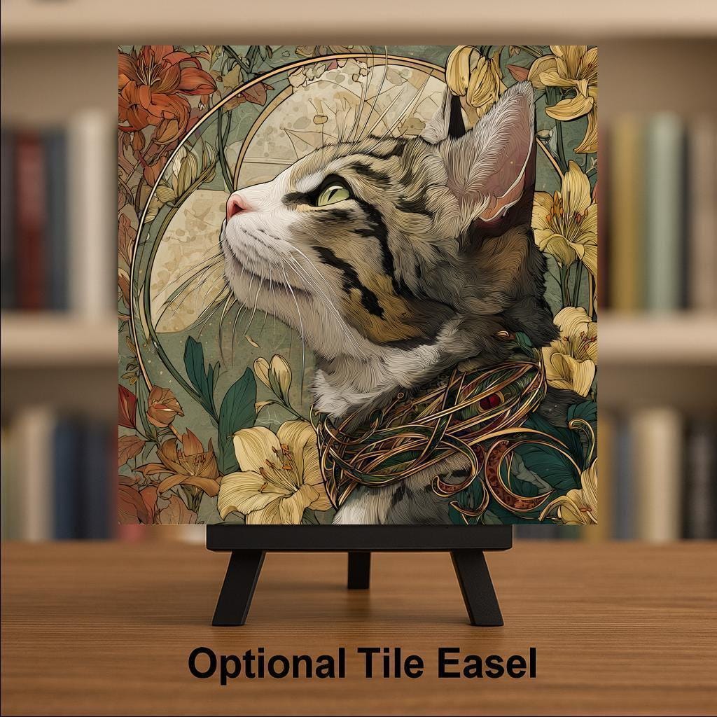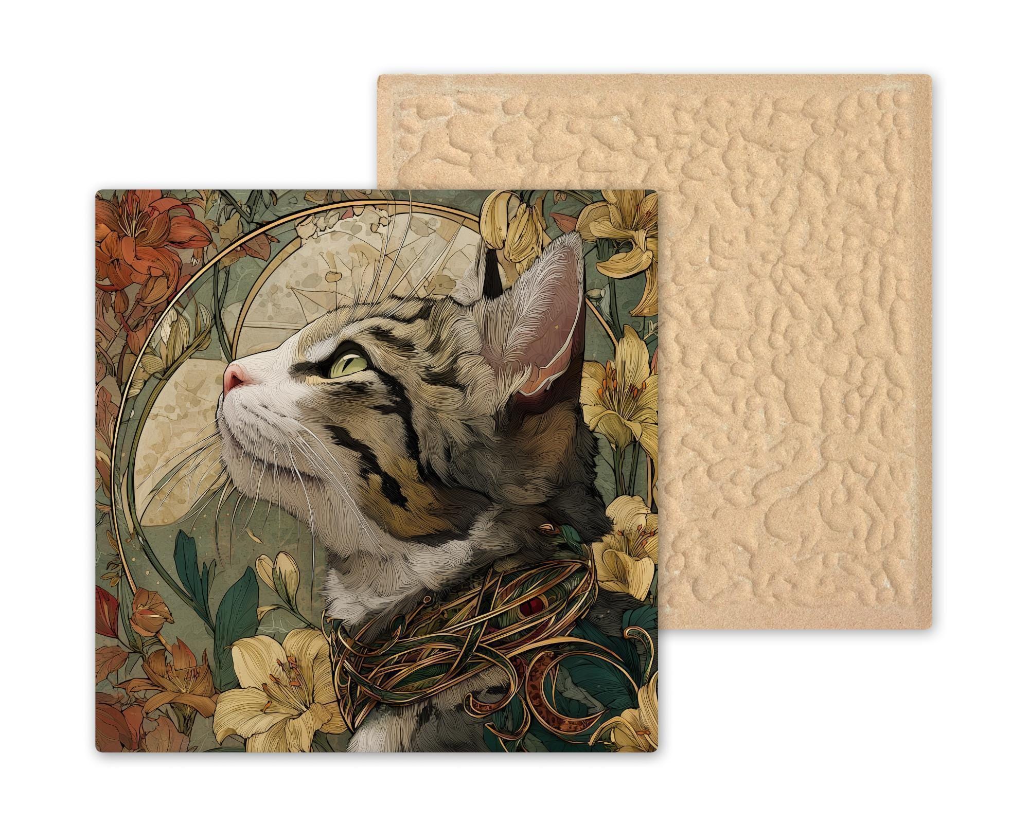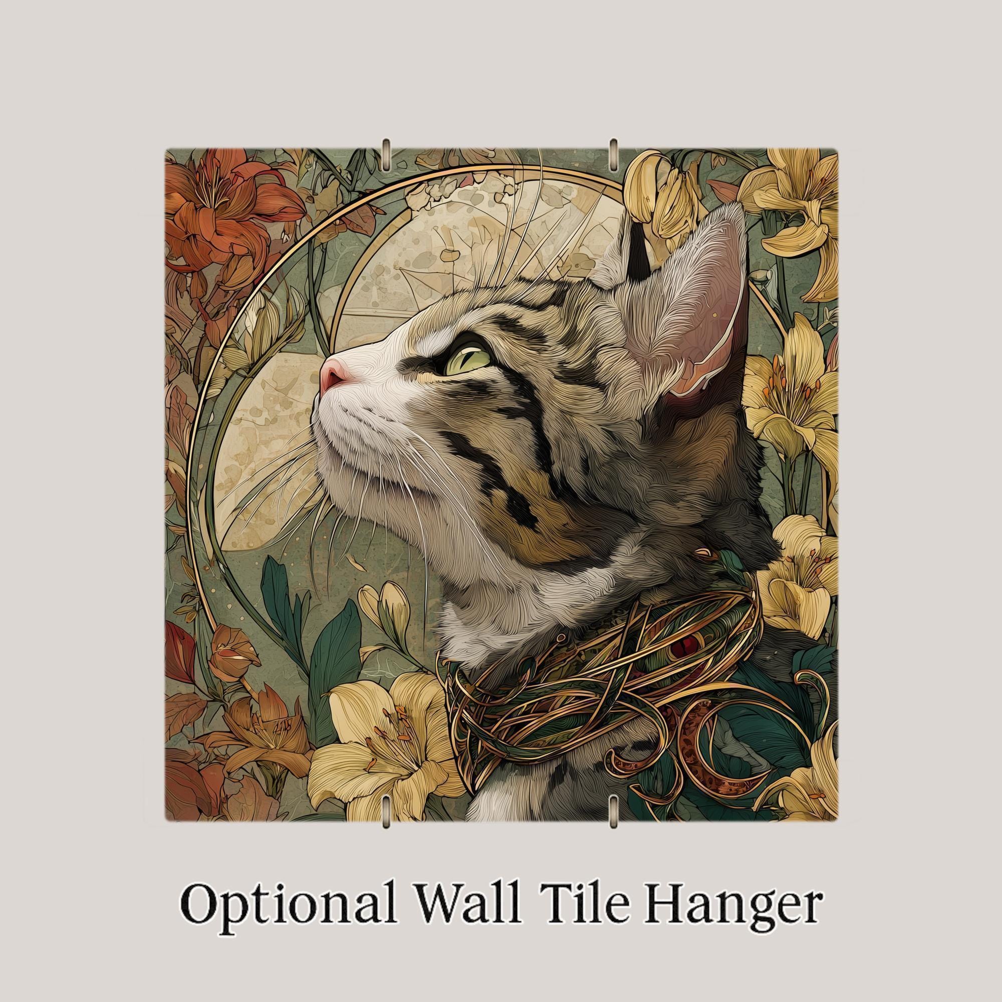 Bring vintage sophistication to your home with this Art Nouveau cat ceramic tile wall art. A striped feline gazes upward, framed by lilies, ornate golden flourishes, and natural earth tones. The stained glass style design glows with luminous beauty, blending detailed feline portraiture with floral elegance.
