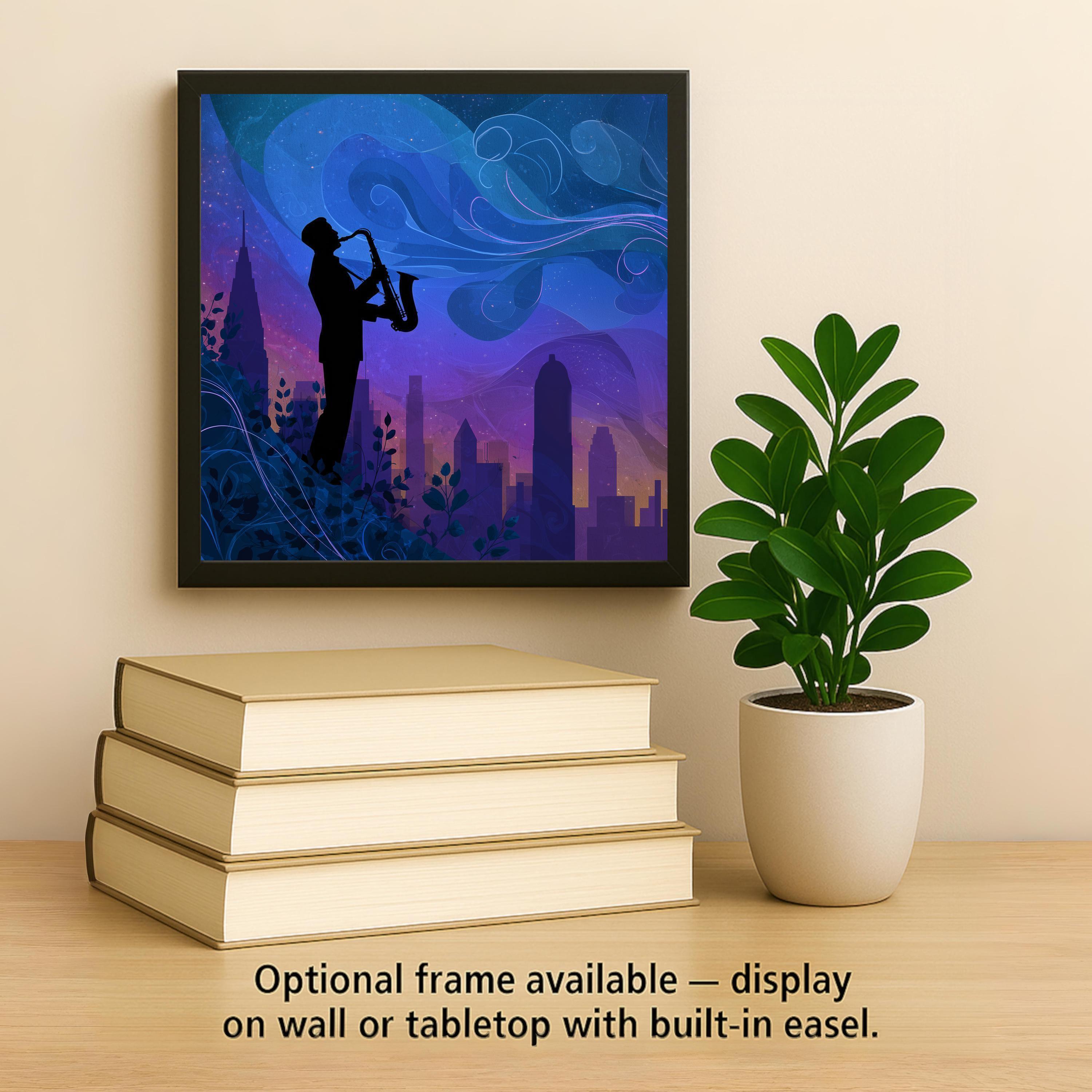 This artwork is perfect for modern, eclectic, or music-themed interiors. Place it in a jazz club-inspired space, a home studio, or a cozy living room to spark creativity and inspiration. The combination of bold cityscape lines and flowing celestial swirls creates a balanced design full of character.
