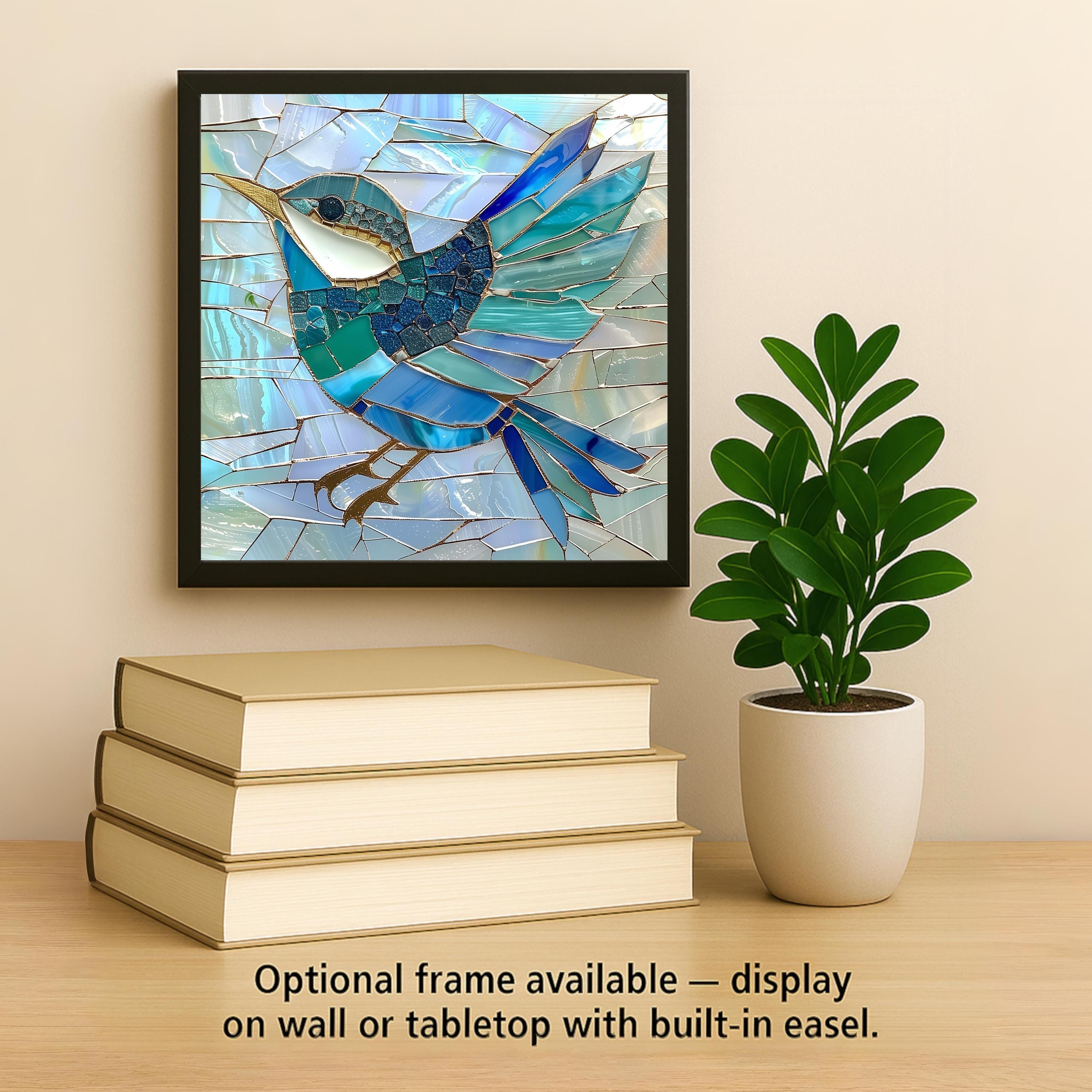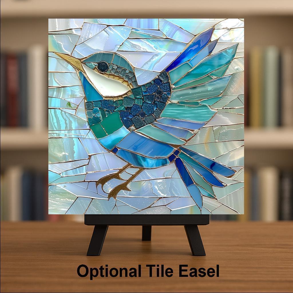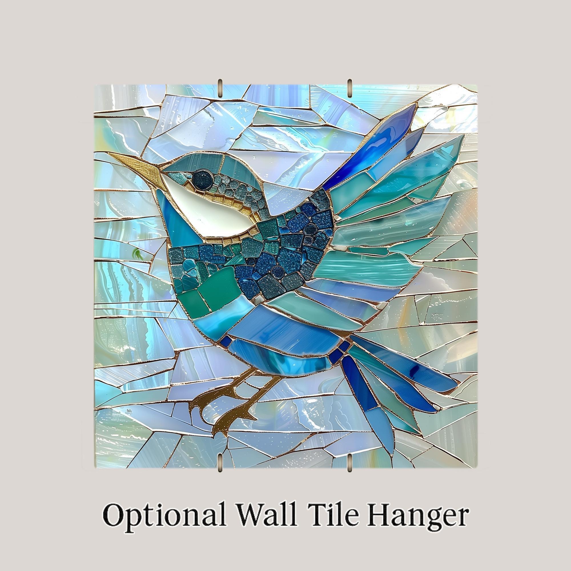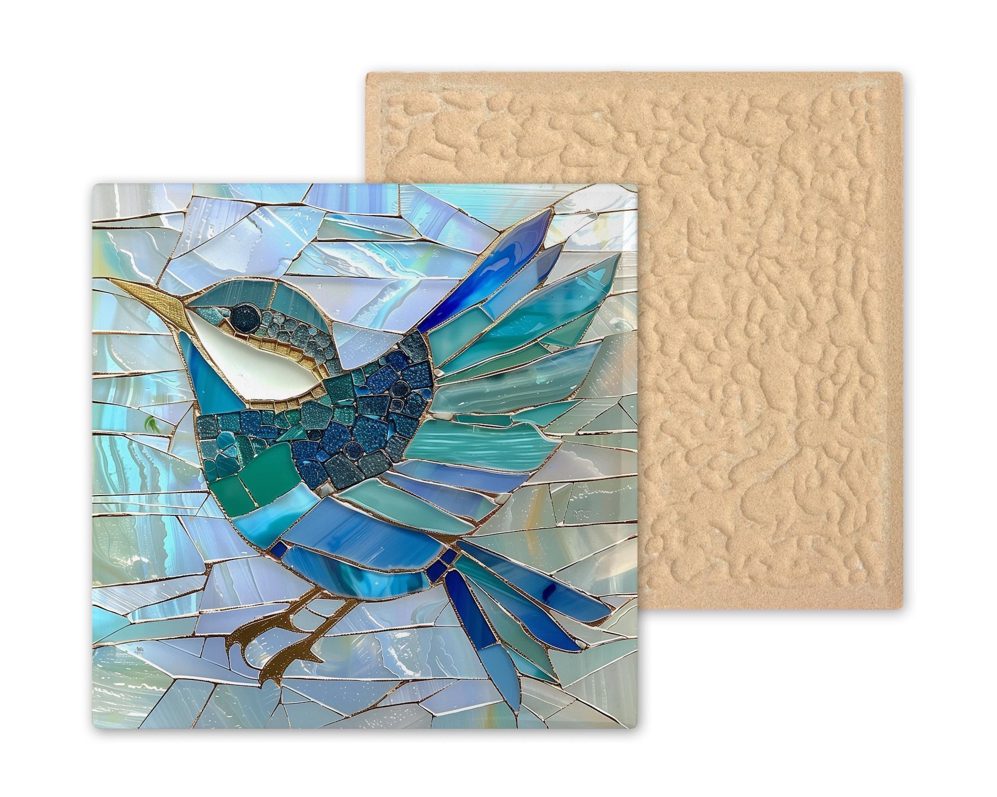 This sea glass bird art ceramic tile captures the vibrant spirit of the ocean with its luminous stained glass style. Shades of ocean blue, seafoam, and turquoise are carefully arranged in a bird mosaic, outlined in golden tones that give the design a glowing artisan finish. The result is a captivating piece of coastal décor that brings both color and elegance to any wall.