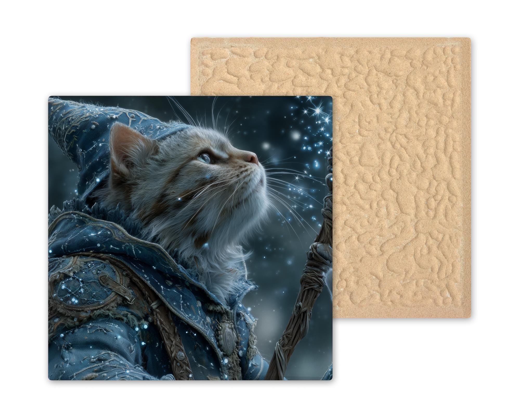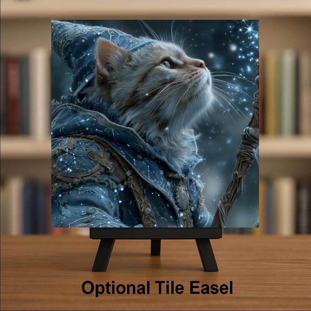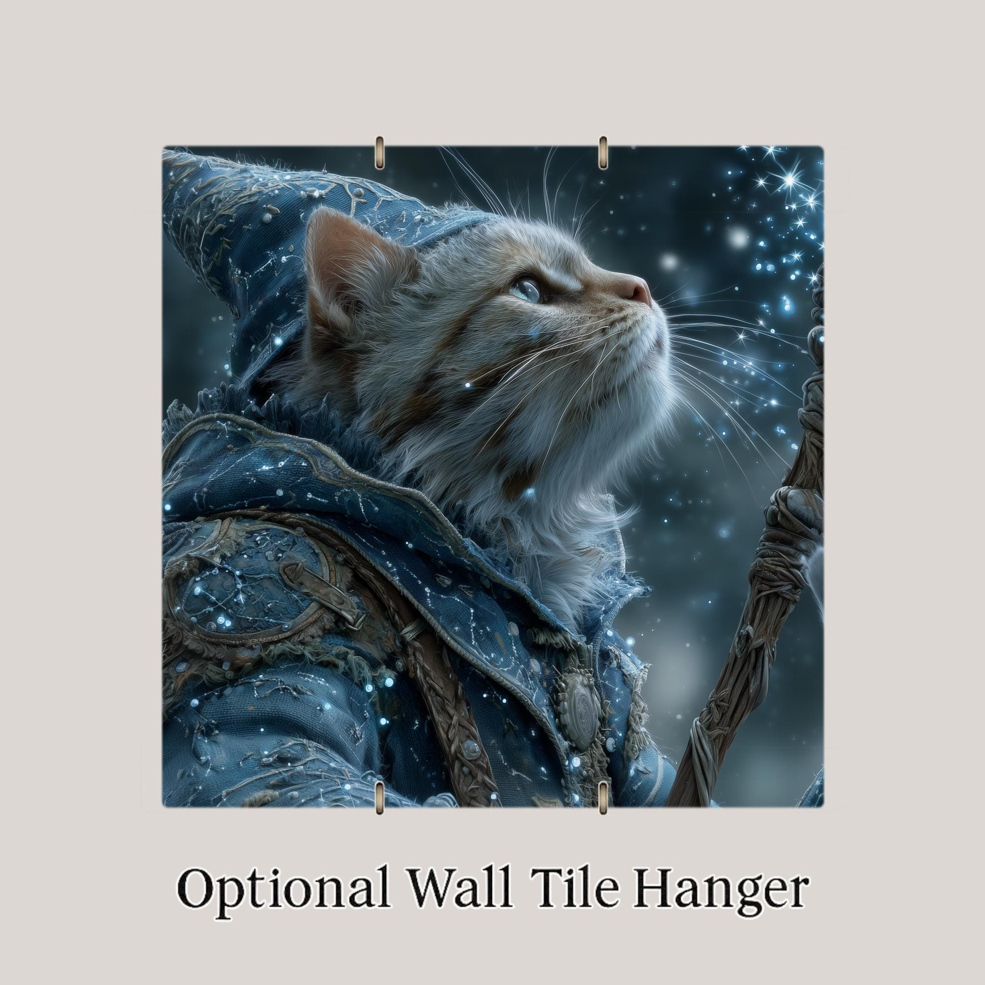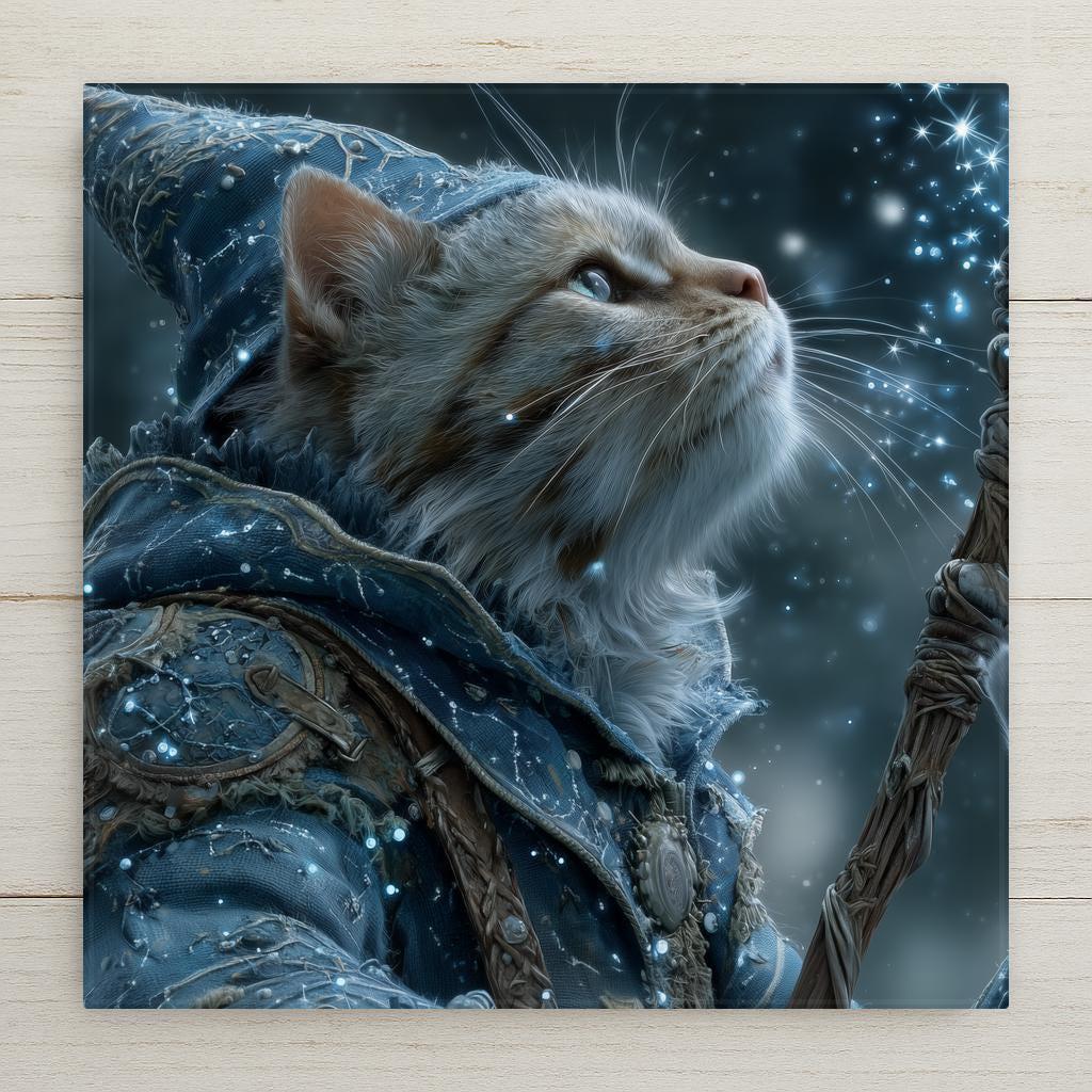 Transform your space into a realm of fantasy with this Wizard Cat fantasy artwork. Dressed in a richly detailed robe embroidered with celestial constellations, the cat gazes upward while holding a glowing staff that shimmers with starlight. The enchanting mix of textures, details, and glowing sparkles makes this a truly mesmerizing wall art piece.