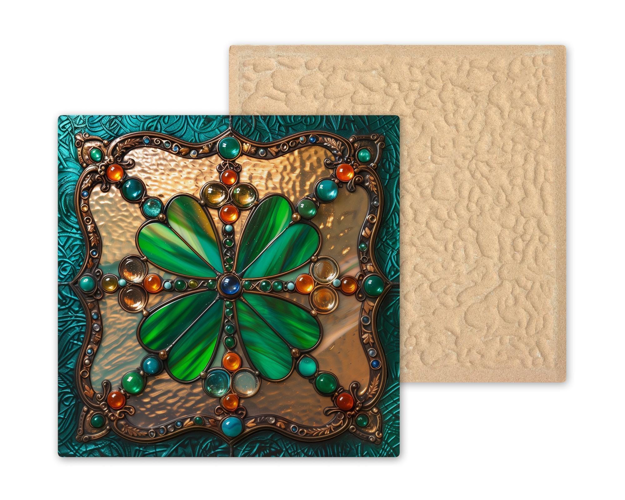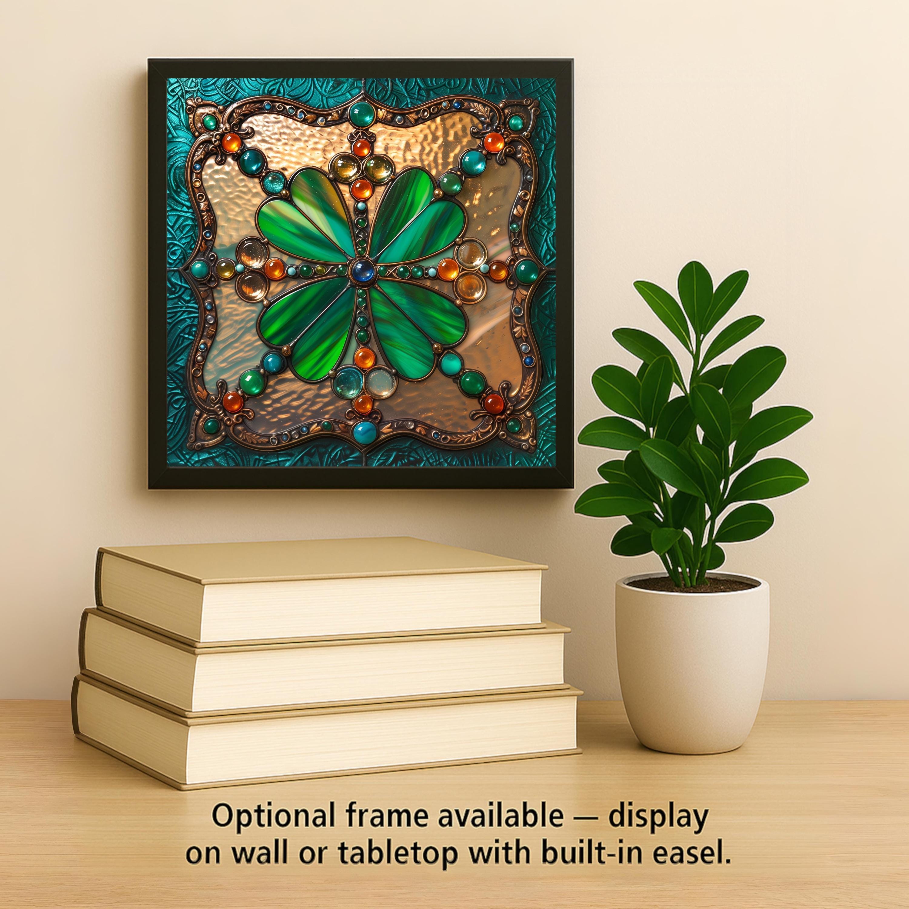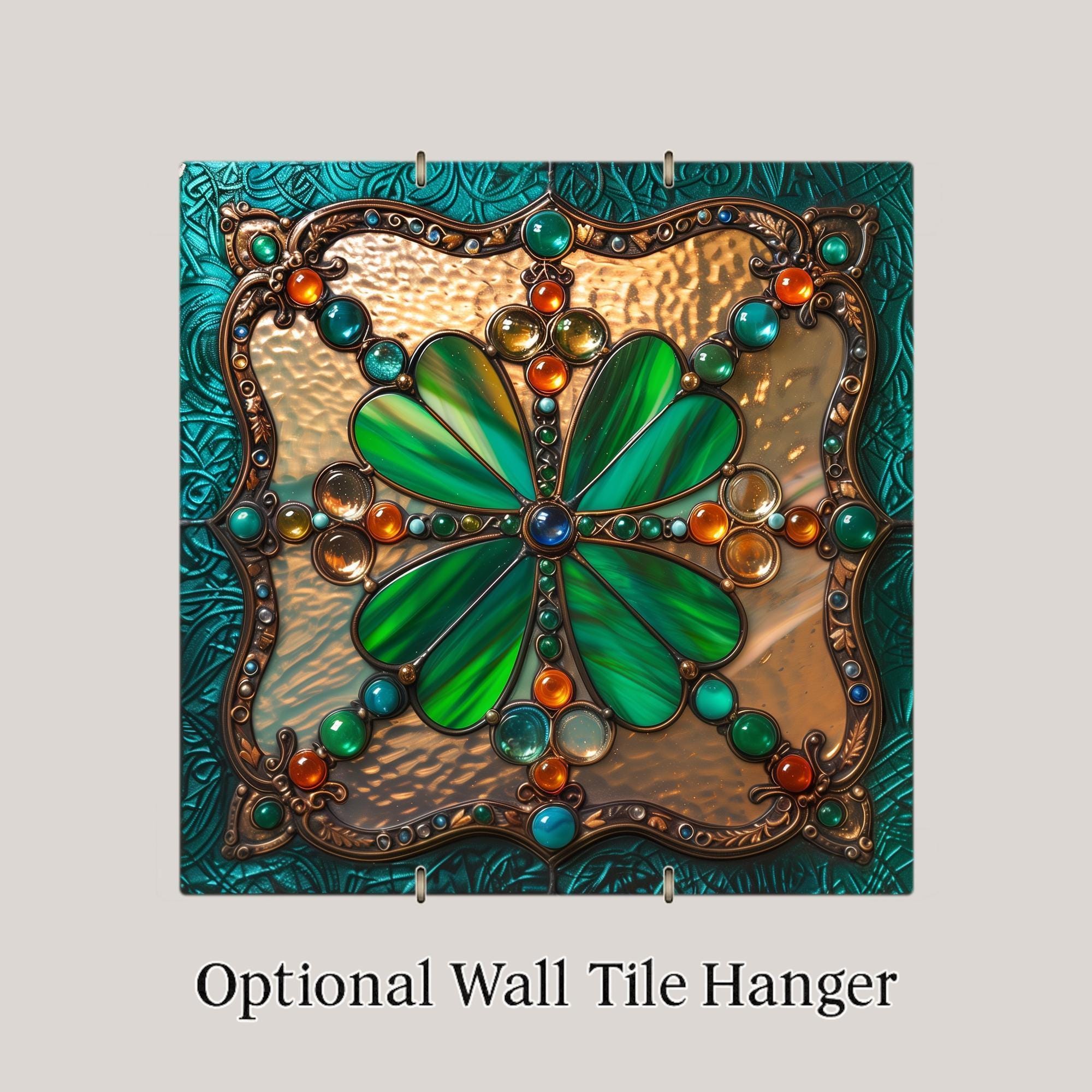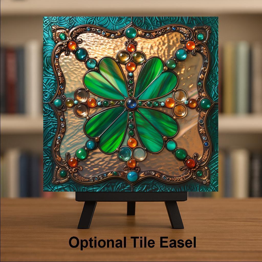 Bring Irish elegance into your space with this stained glass shamrock tile wall art. Designed with a luminous four-leaf clover centerpiece, the artwork glows with emerald greens and sparkling jewel tones of orange, amber, and turquoise. Outlined in intricate bronze details and framed in a Celtic-inspired border, it combines old-world craftsmanship with modern stained glass artistry.