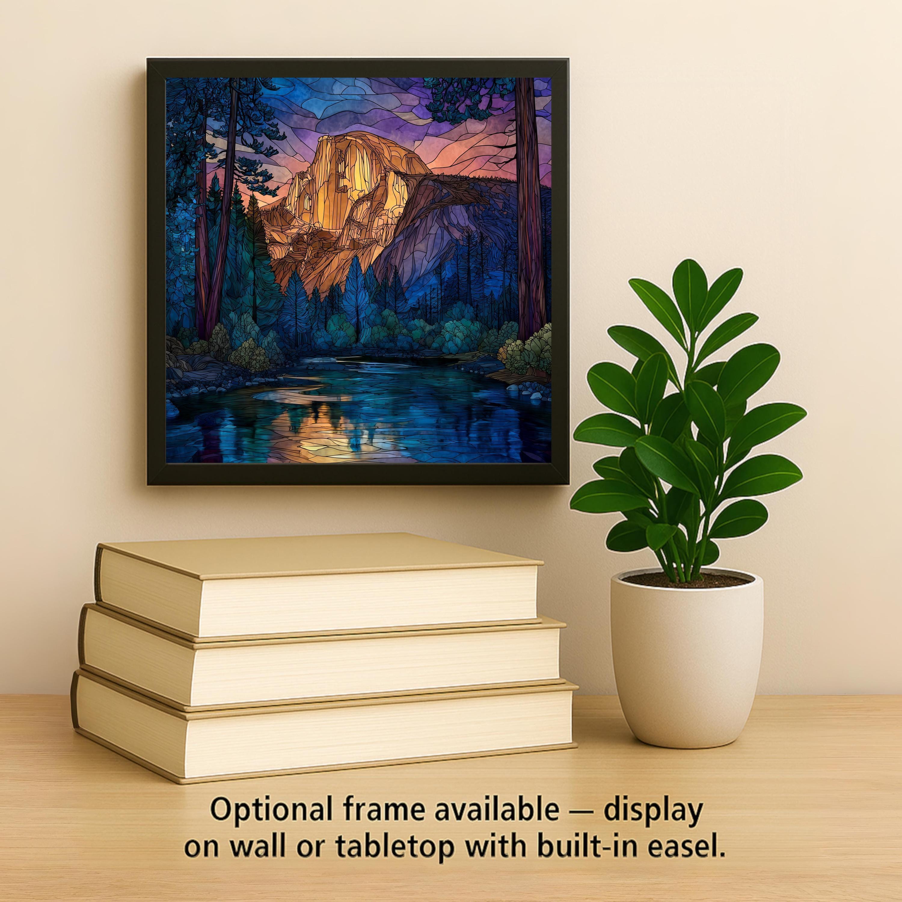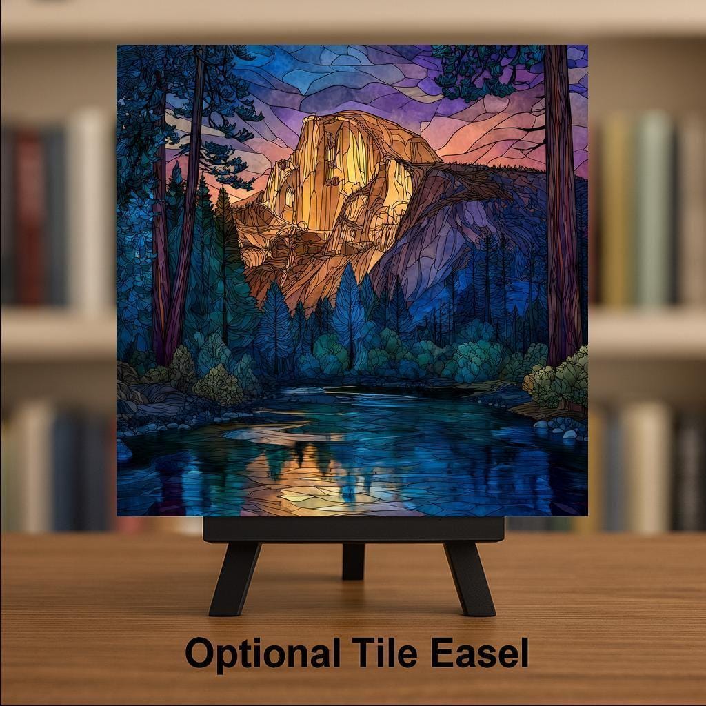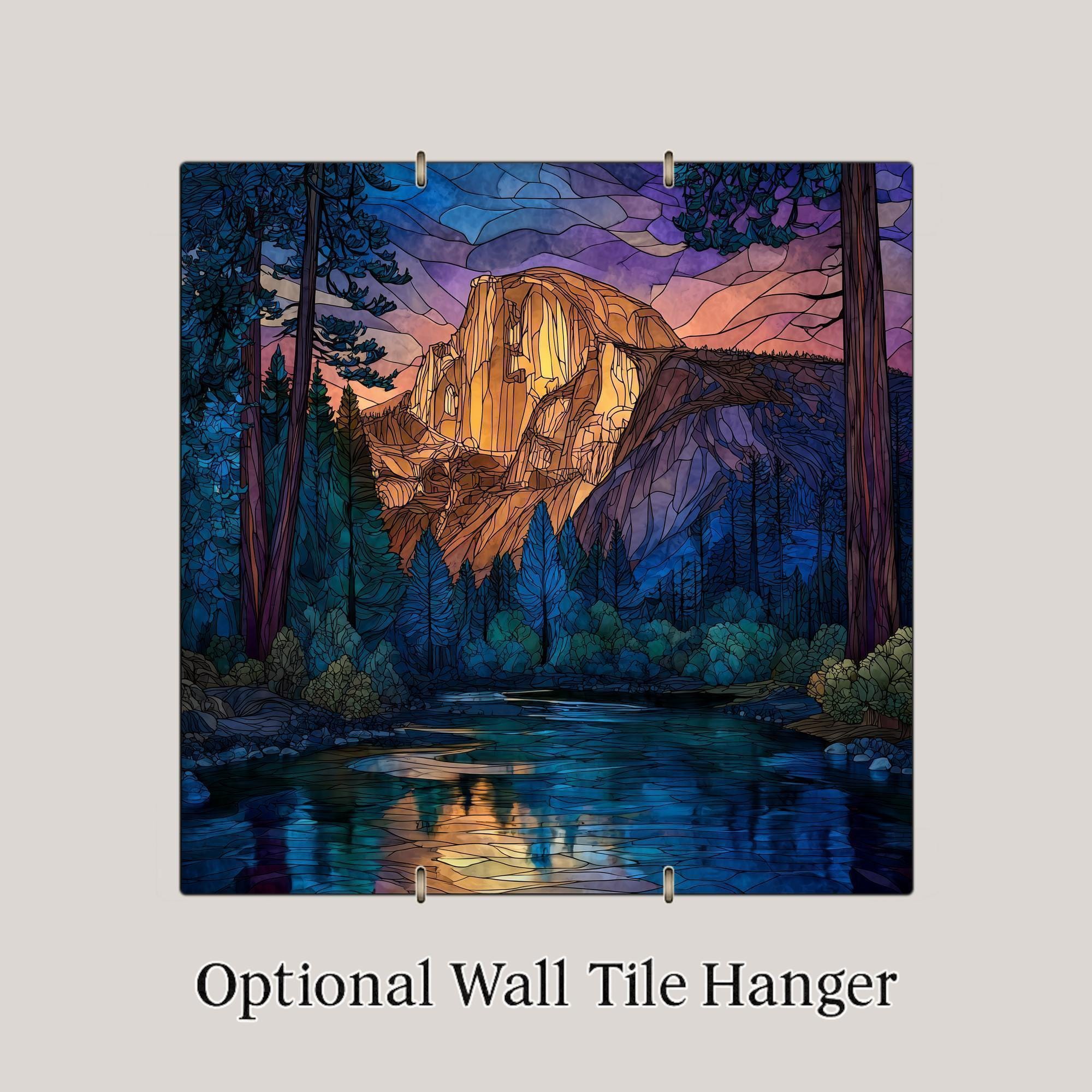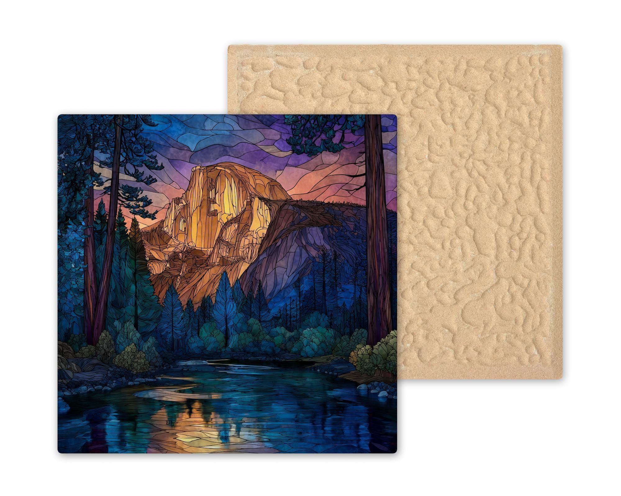 This stained glass style Yosemite Half Dome ceramic tile art brings together mountain beauty and luminous design. The glowing face of Half Dome is bathed in golden light, reflected perfectly in the water below. Shades of purple, blue, and green surround the scene, giving the tile a rich and captivating look. It is created to resemble the depth of stained glass, yet it is a permanent ceramic print that is both durable and easy to care for.