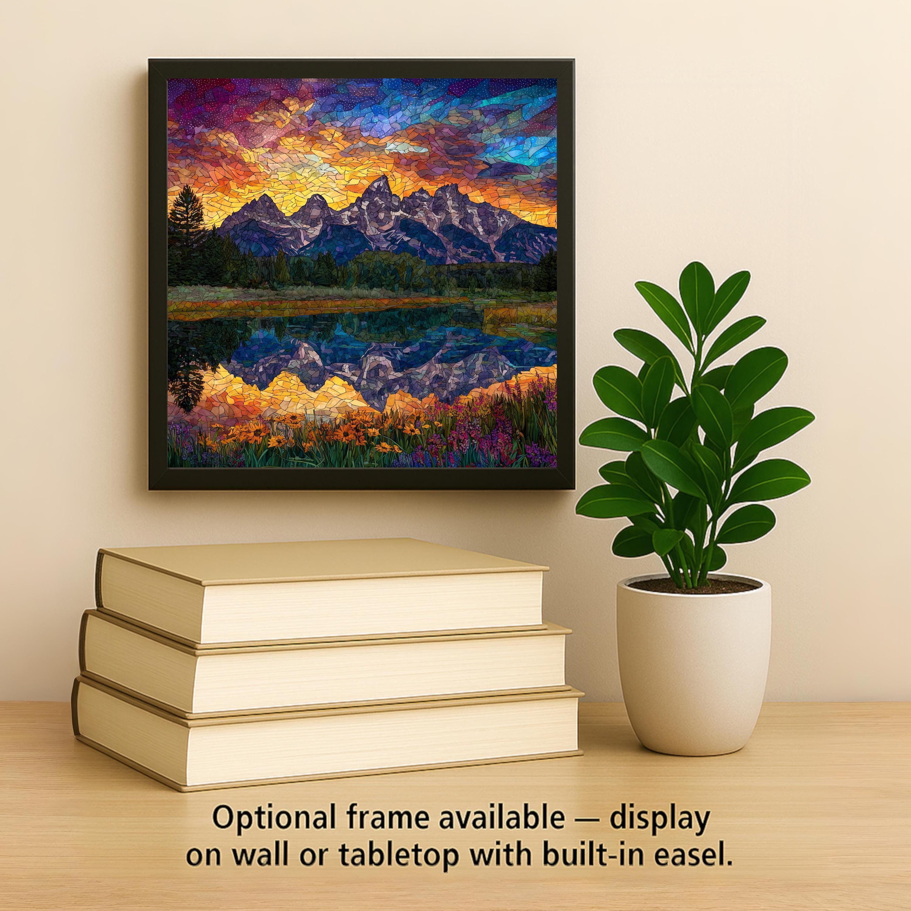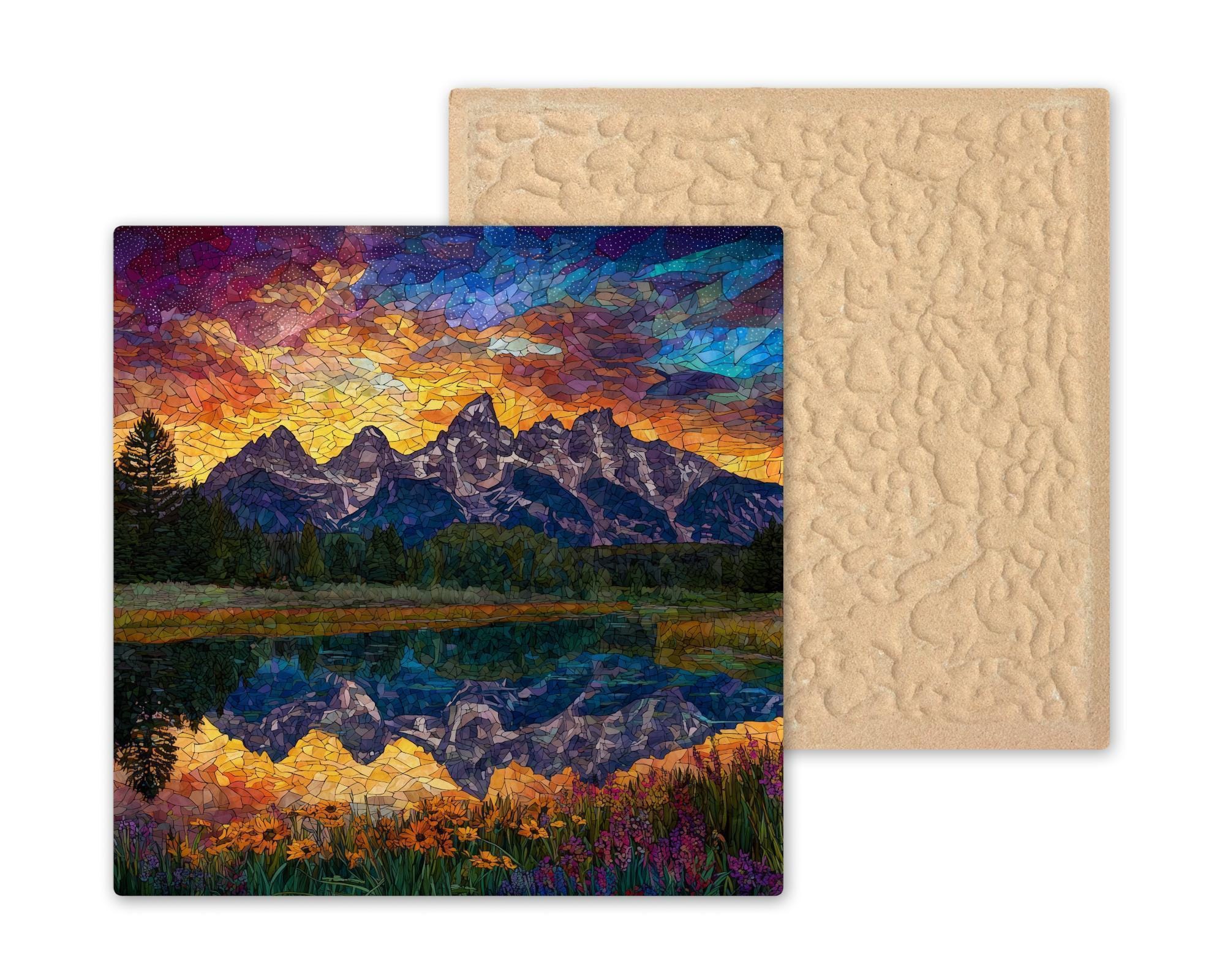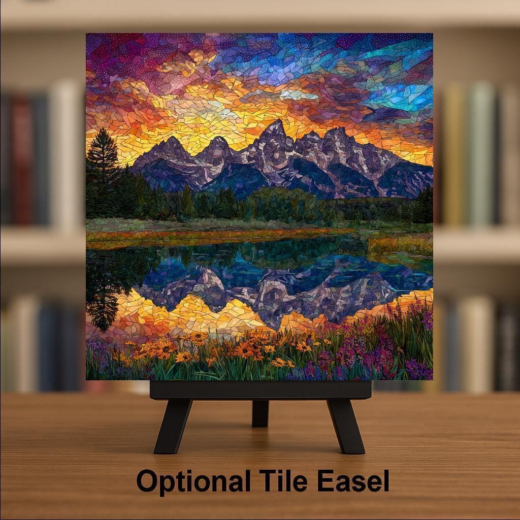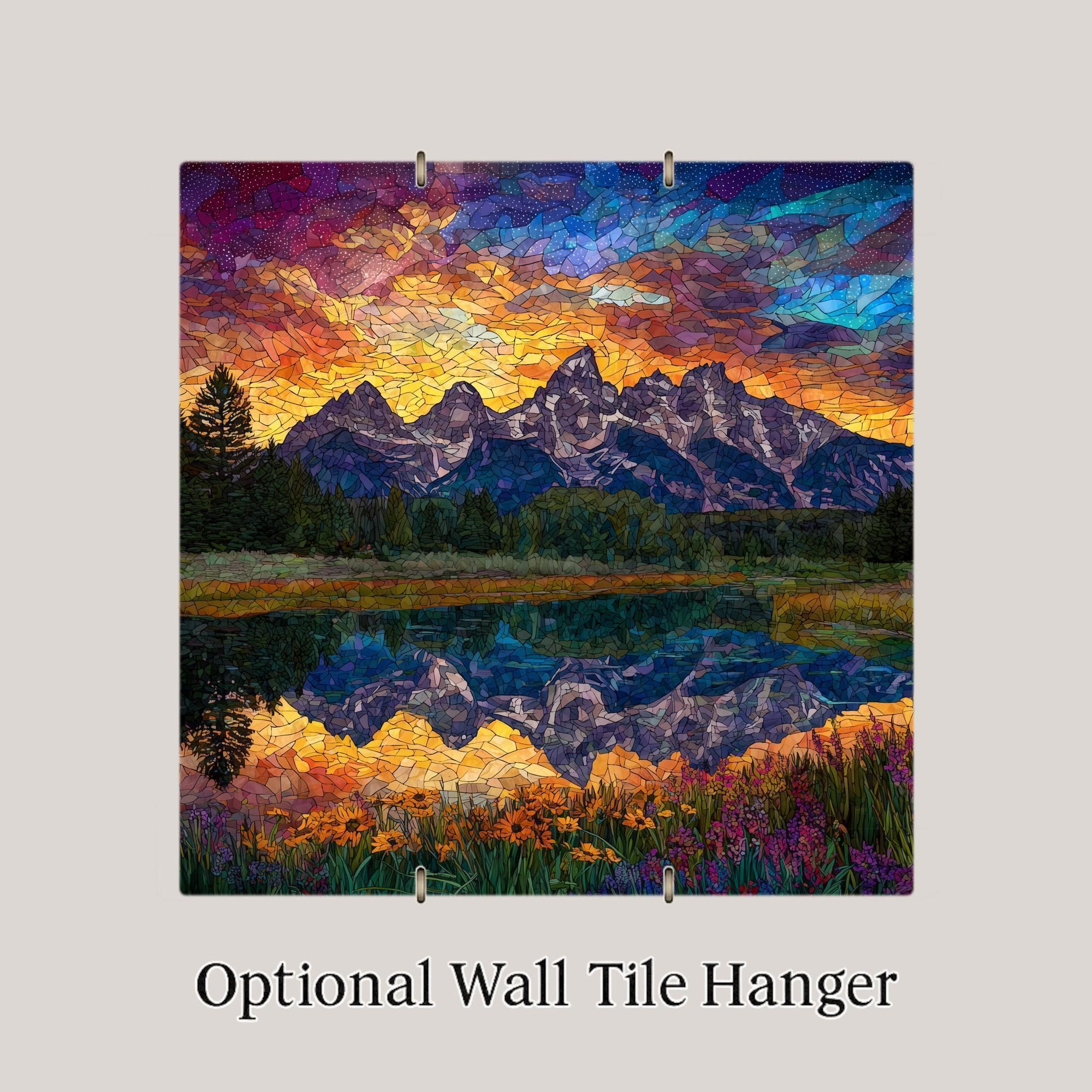 Bring the majesty of the Grand Teton Mountains into your home with this stained glass style ceramic tile art. The artwork showcases a vivid mountain sunset where golden skies transition into purple and blue tones. Below, the water reflects the mountains and sky, creating a glowing mirror image that enhances the scene. Wildflowers in the foreground add pops of red, orange, and yellow, making this design both vibrant and peaceful. Though it looks like stained glass, this piece is a permanent print on ceramic tile, ensuring it is durable, easy to clean, and lasting.