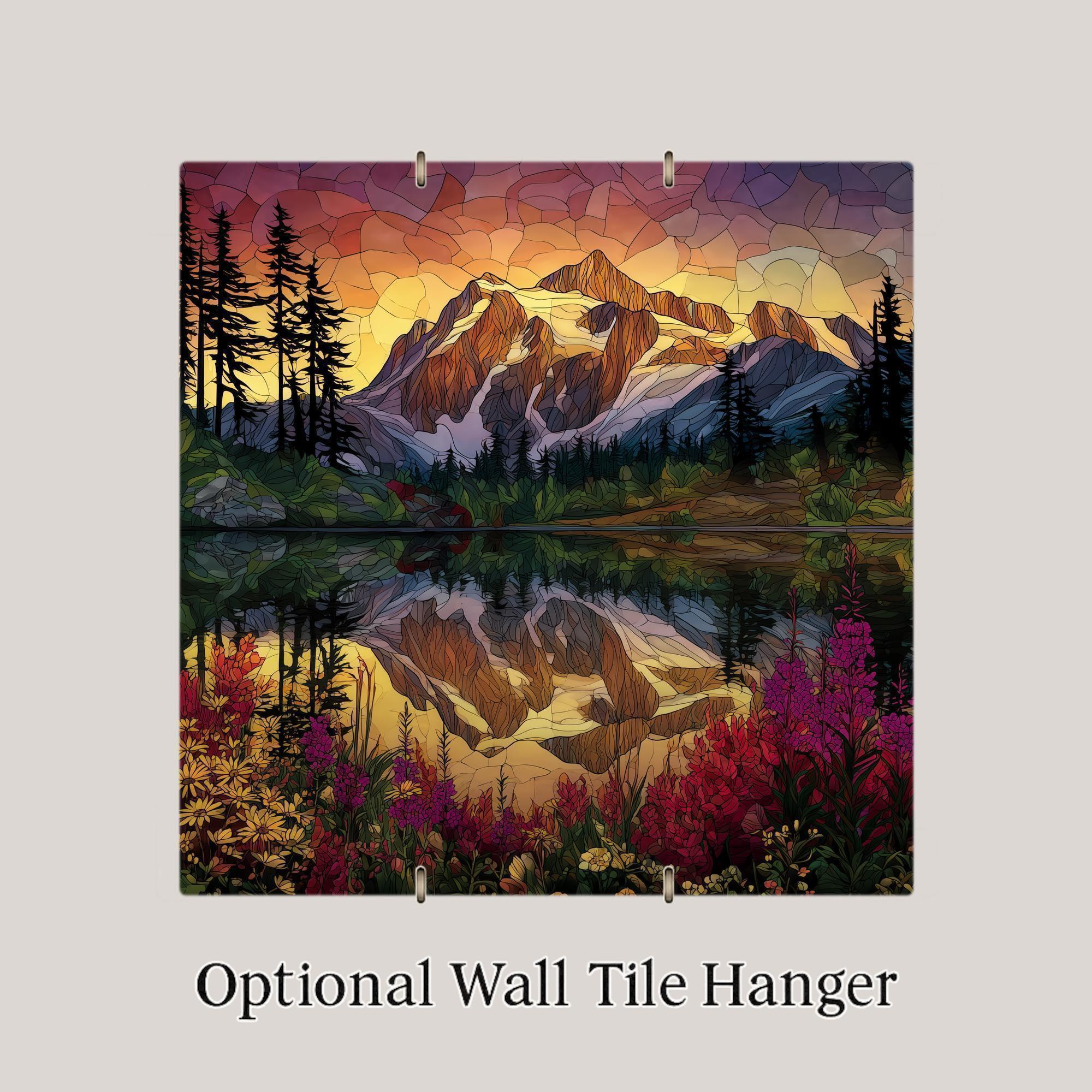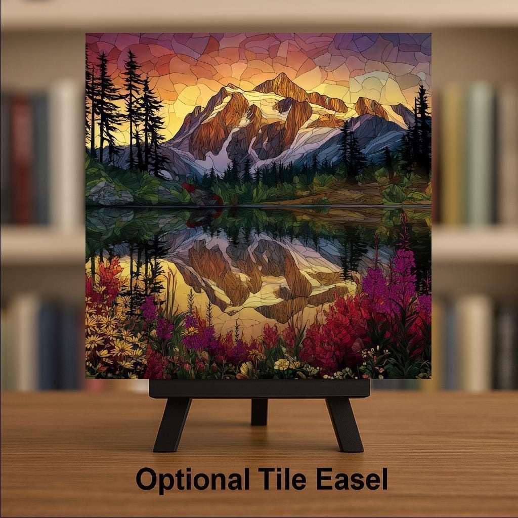 This Mt. Shuksan and Picture Lake ceramic tile art captures the unforgettable moment of morning glow over one of Washington’s most iconic peaks. The design highlights a reflection of the snow-capped mountain in the lake below, framed by tall evergreens and bursting wildflowers, with a brilliant stained glass style that makes the piece come alive.