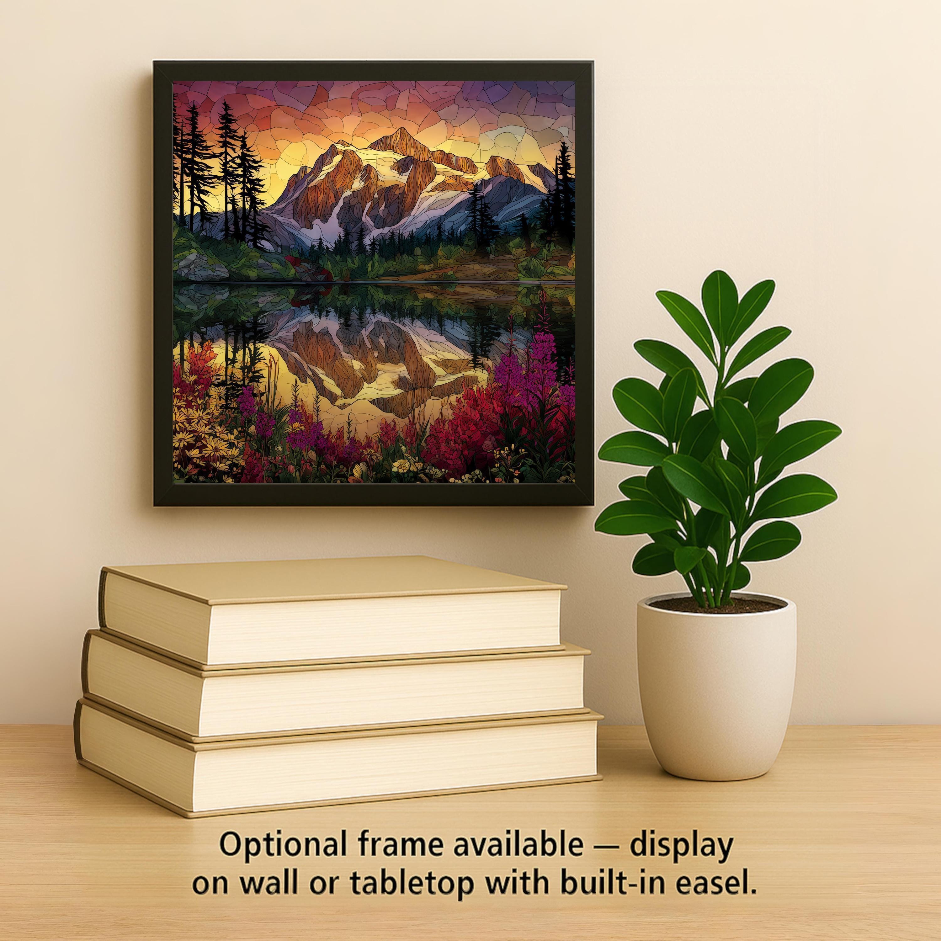Versatile display options make this tile easy to enjoy in any space. Use the optional tile wall hanger, easel stand, or cork backing—or choose the premium frame, which functions as both a stand for tabletop display and a hanger for wall mounting. Whether showcased in a living room, kitchen, or office, this mountain sunrise tile will inspire awe and admiration daily.