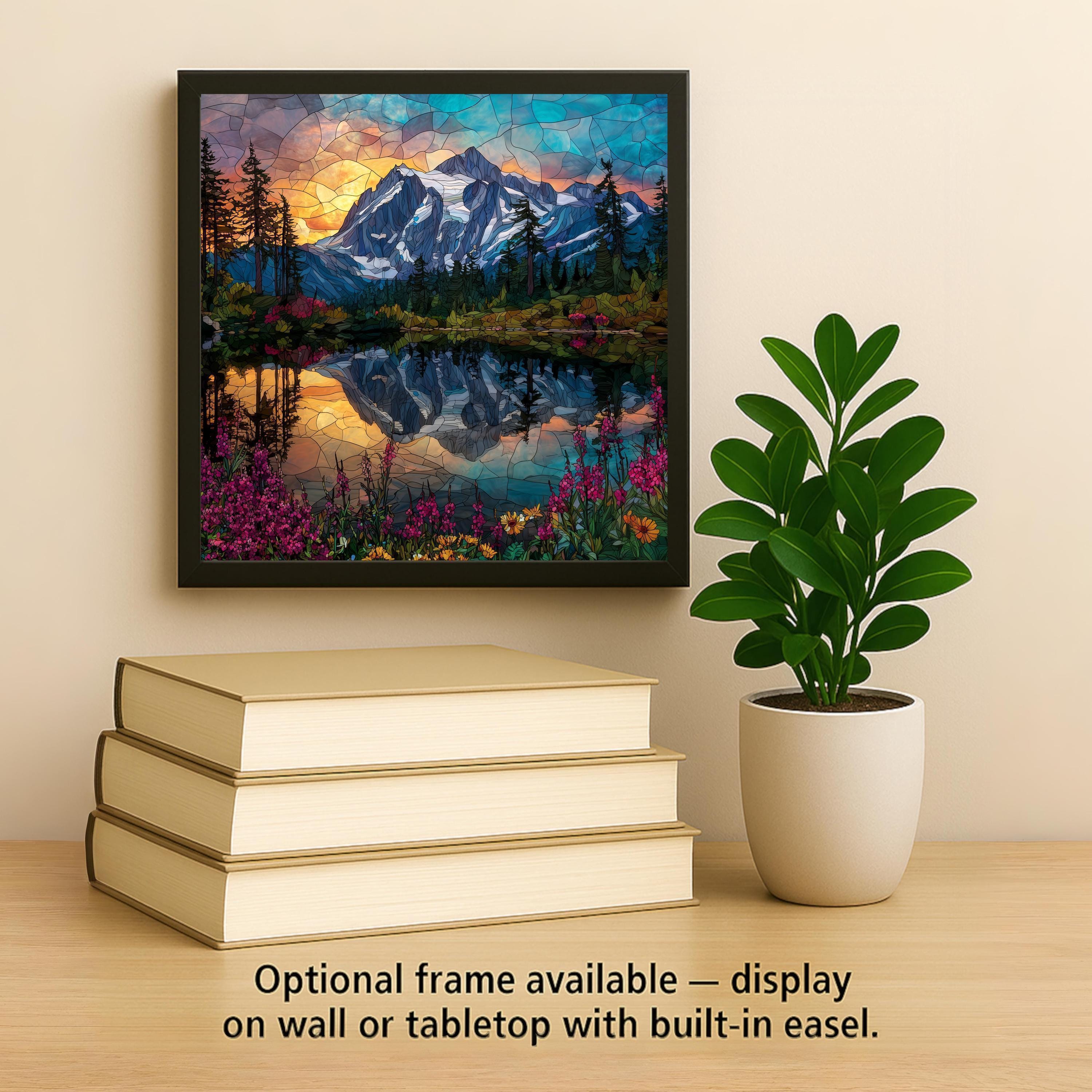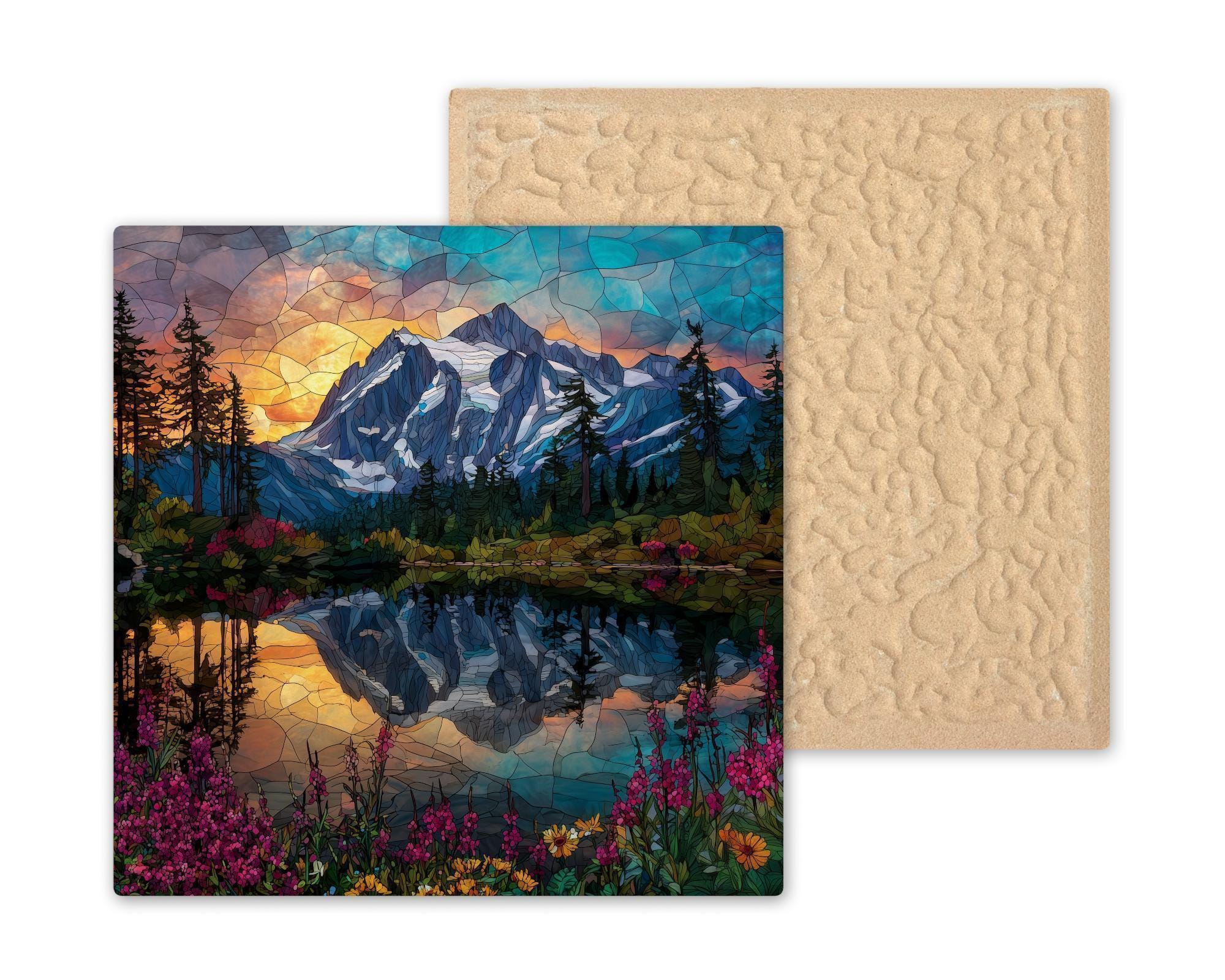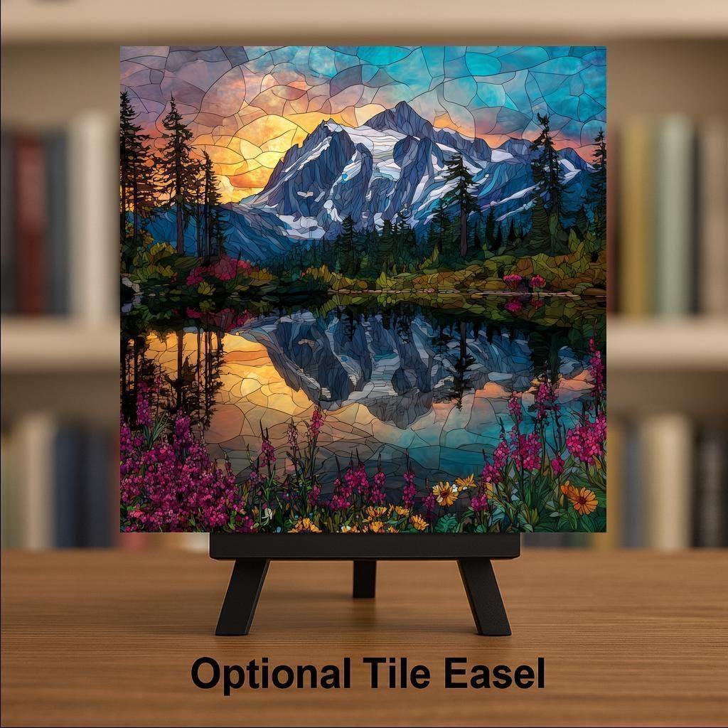 Capture the splendor of Mount Shuksan at sunrise with this artisan ceramic tile featuring Picture Lake and vibrant wildflowers in a stained glass style. The design radiates with bold colors of golden orange, sapphire blue, and emerald green, reflecting the enchanting glow of morning light. With its luminous jewel tones and intricate stained glass effect, this artwork transforms a simple tile into an unforgettable piece of wall décor.