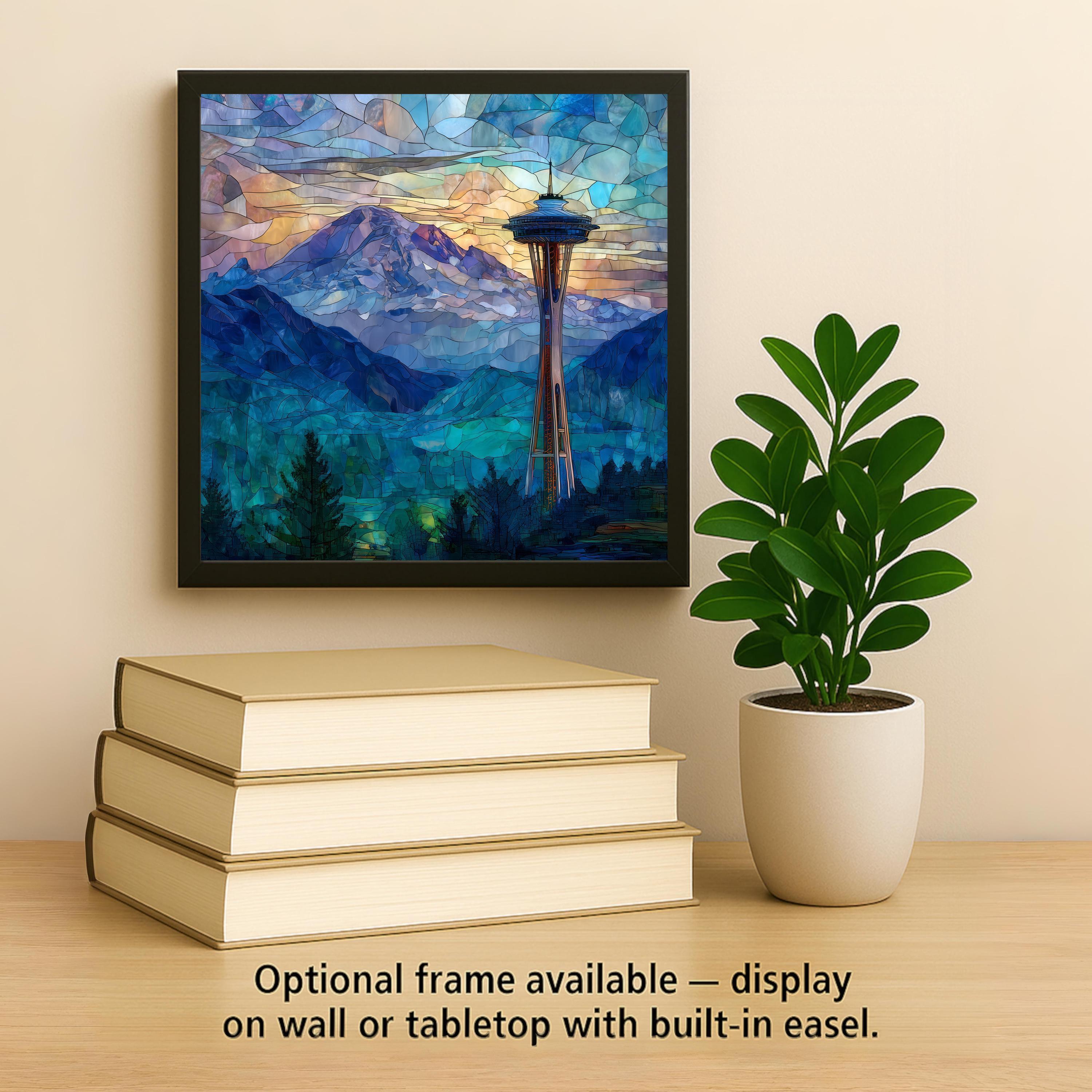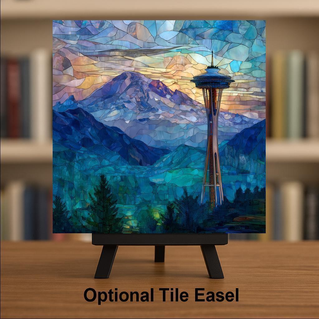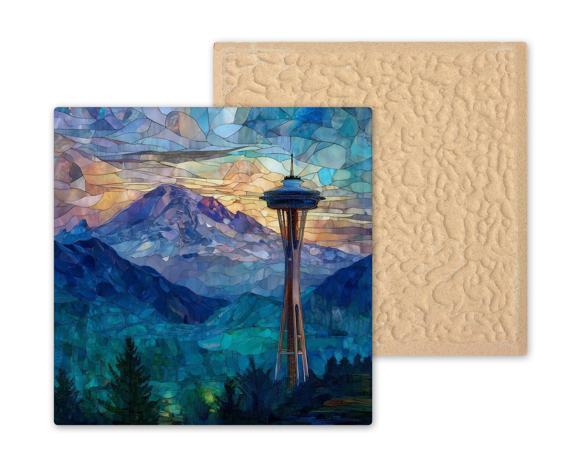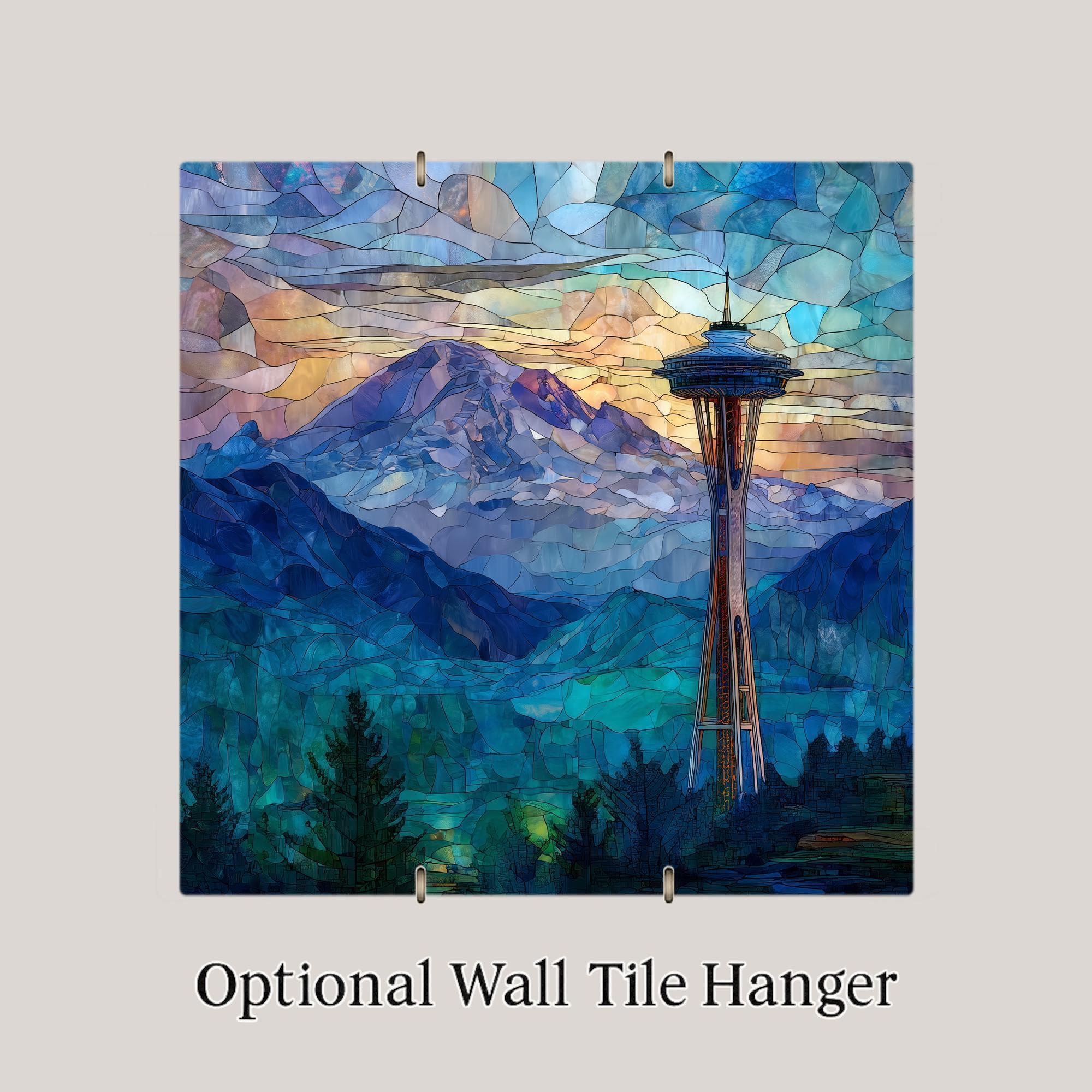 Celebrate the Seattle skyline with this Space Needle and Mt. Rainier ceramic tile wall art. Designed in a stained glass-inspired style, the piece combines vivid blues, turquoise skies, and glowing sunset light to create a breathtaking effect. It’s an artistic tribute to one of America’s most iconic landmarks.