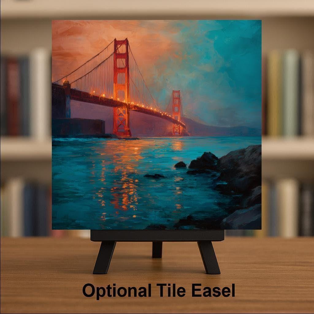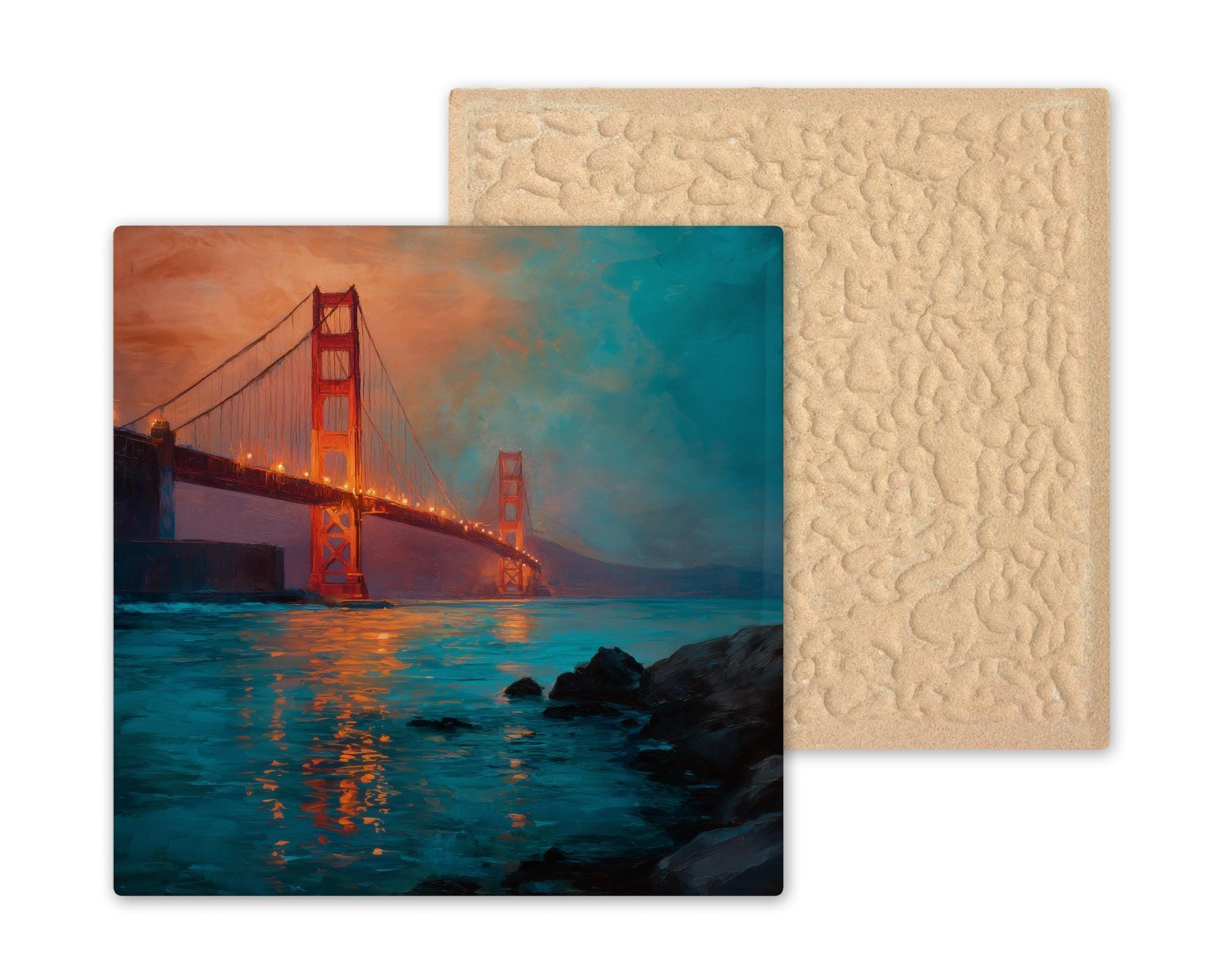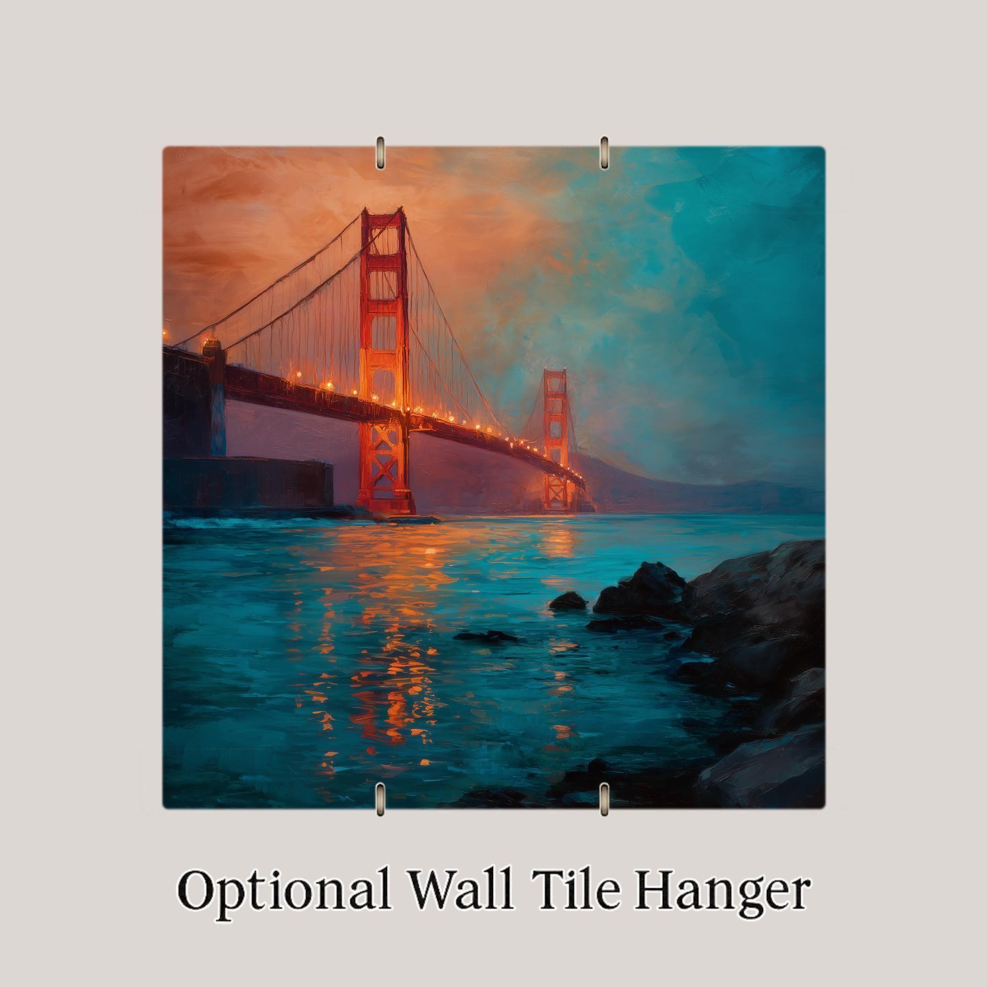 This Golden Gate Bridge ceramic tile wall art is the perfect blend of modern printing technology and timeless design. Inspired by the iconic San Francisco landmark, the artwork highlights glowing reds, oranges, and deep turquoise tones, creating a stained glass-style look that radiates warmth and sophistication.
