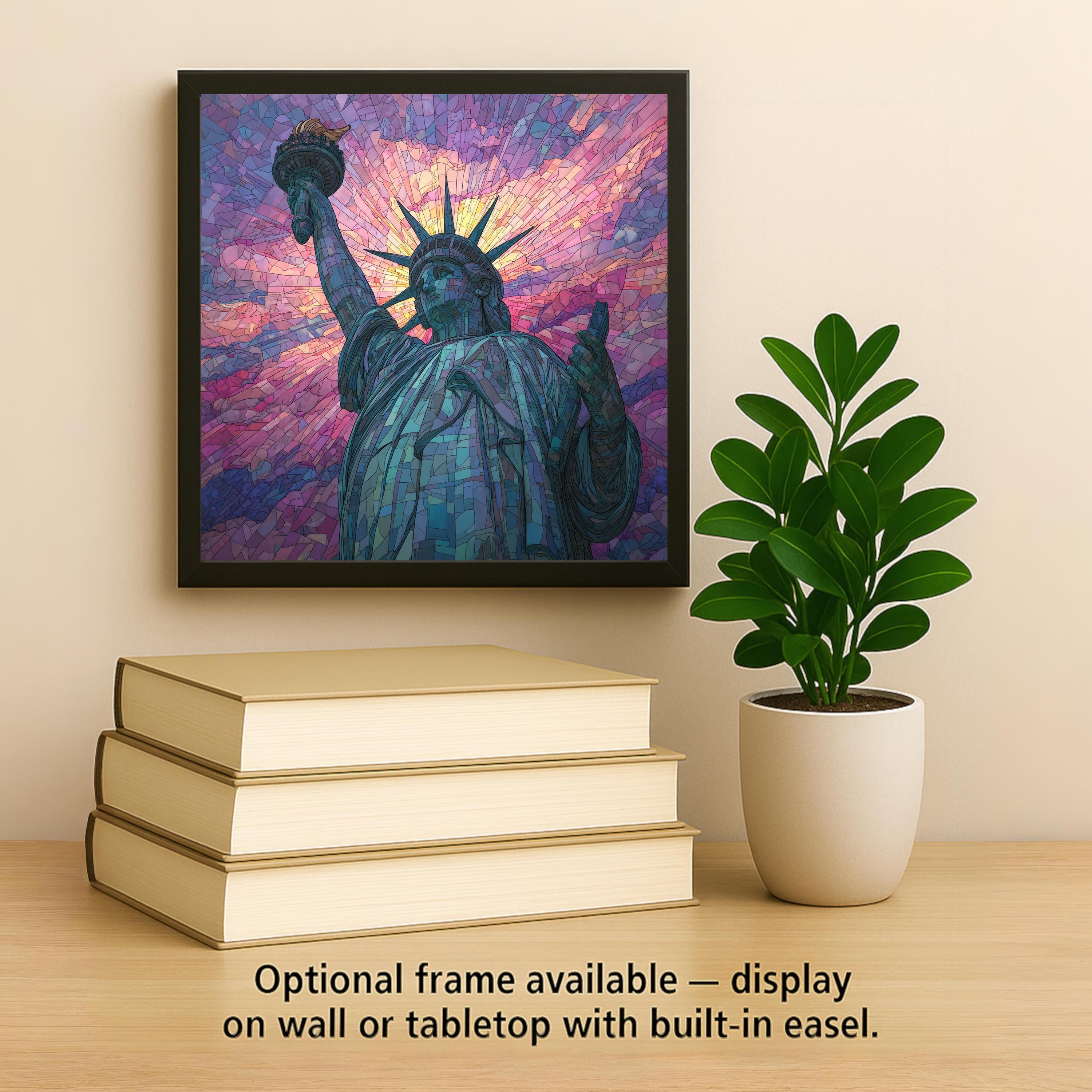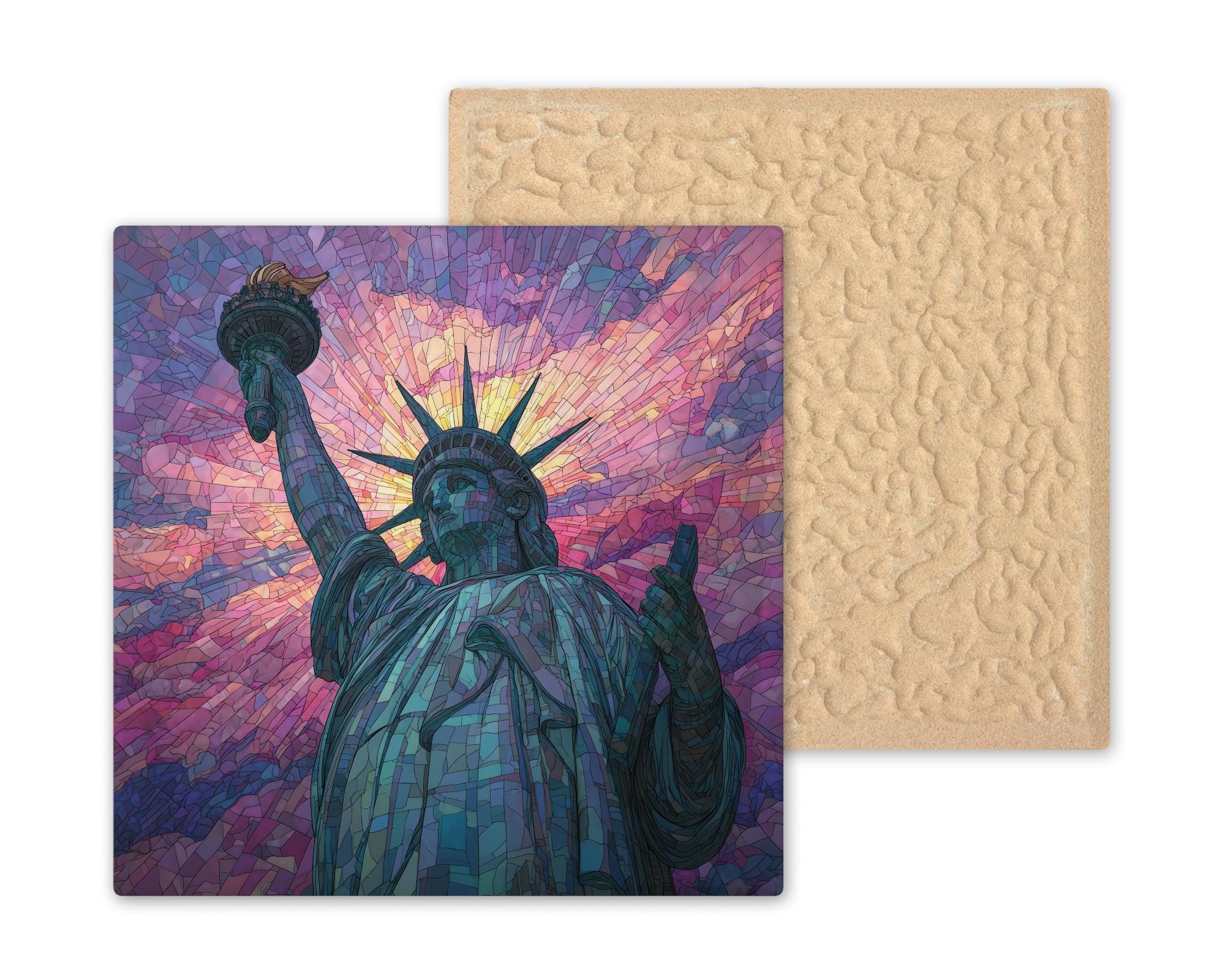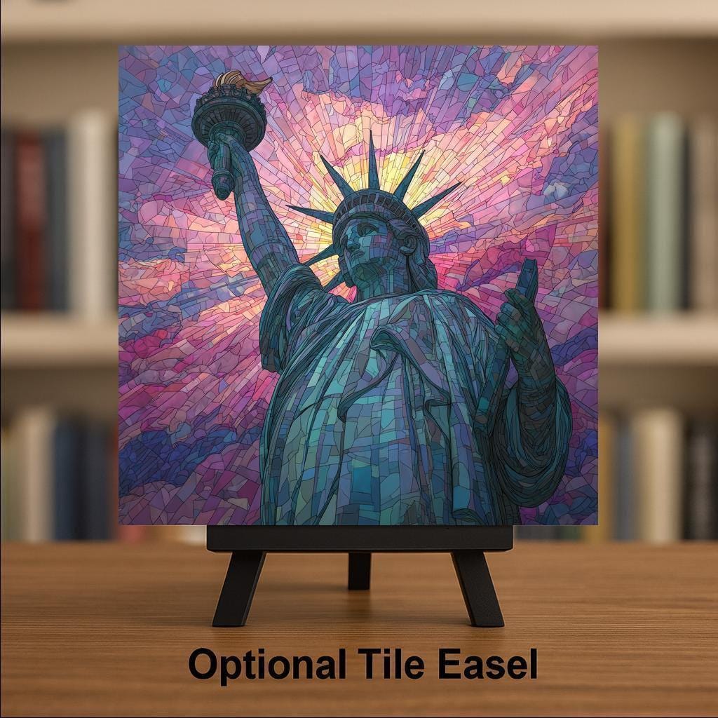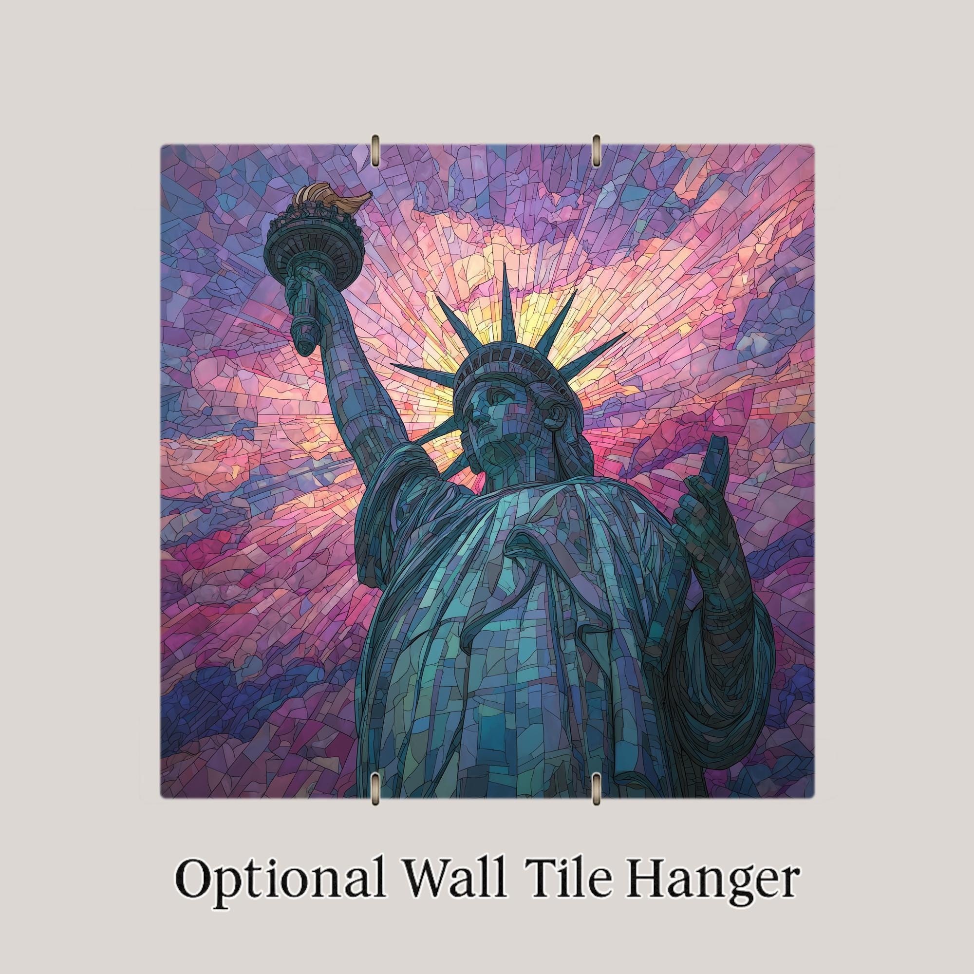 Bring the glow of freedom into your home with this Statue of Liberty stained glass ceramic tile. Featuring a close-up of Lady Liberty with radiant sunset hues bursting behind her crown, this art piece captures the enduring spirit of America in luminous color. The jewel-tone palette and stained glass mosaic style make it a striking addition to any décor.