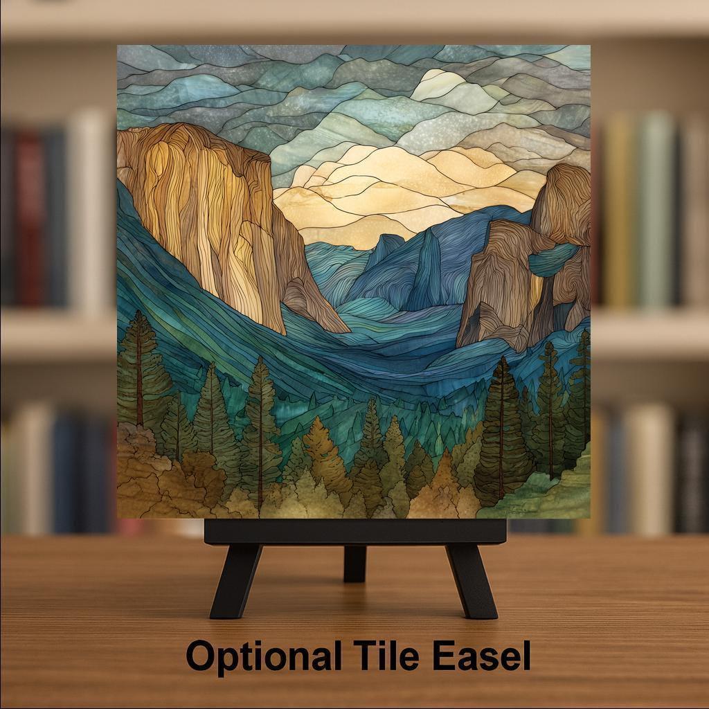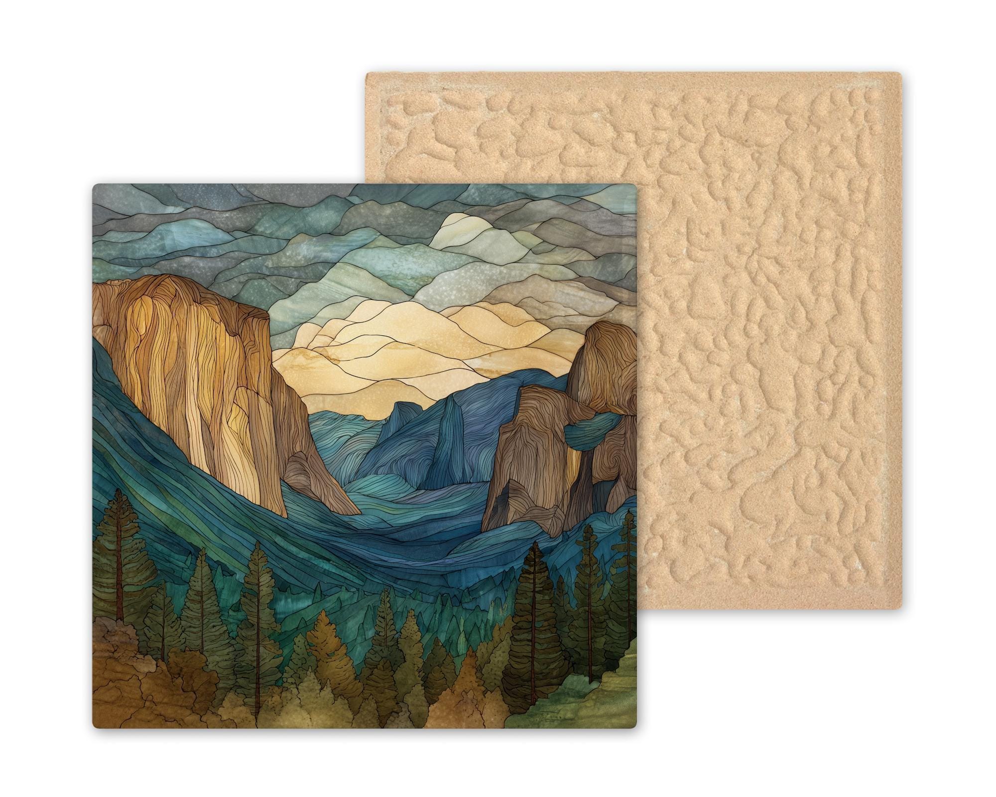 Capture the wonder of America’s natural treasures with this Yosemite Tunnel View stained glass ceramic tile. The sweeping design features El Capitan, Half Dome, and Bridalveil Fall in luminous jewel-tone colors, set against a glowing sunset sky. Styled to resemble a stained glass mosaic, this piece blends artistry with the grandeur of nature.