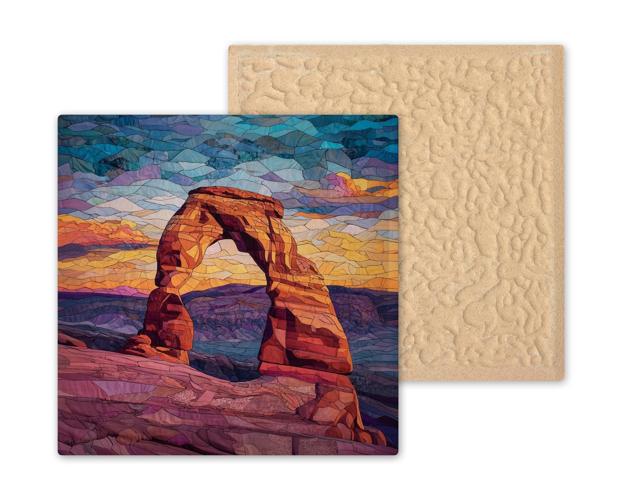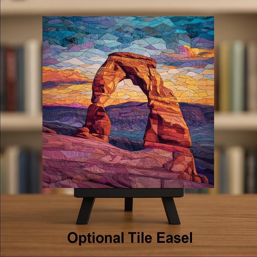 This Delicate Arch ceramic tile was designed for the national park collector — the buyer who visits parks, photographs landscapes, and wants the places that moved them permanently on their wall. Arches National Park draws over 1.5 million visitors a year. Delicate Arch is the image on Utah's license plate. The emotional connection buyers have to this specific landmark runs deep.