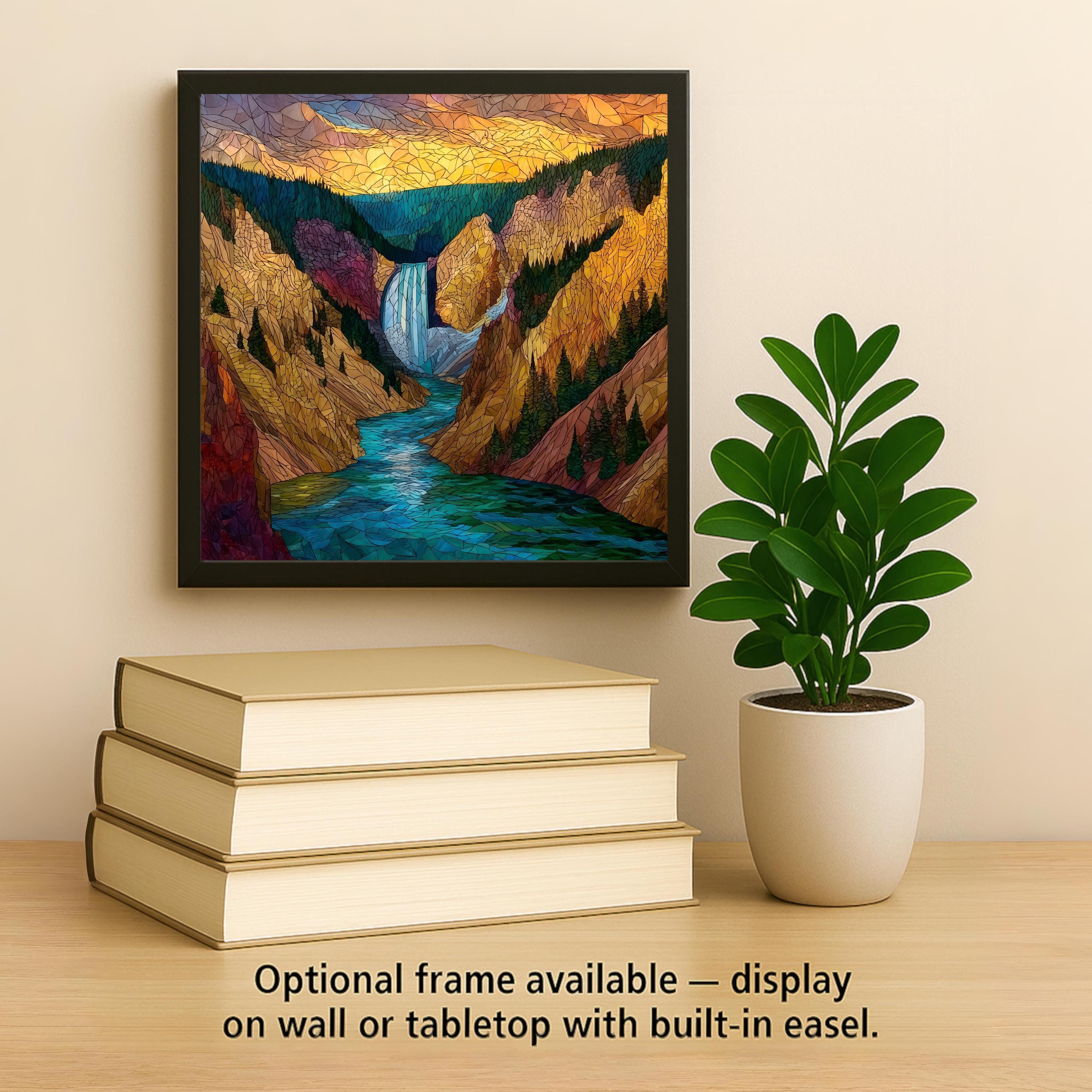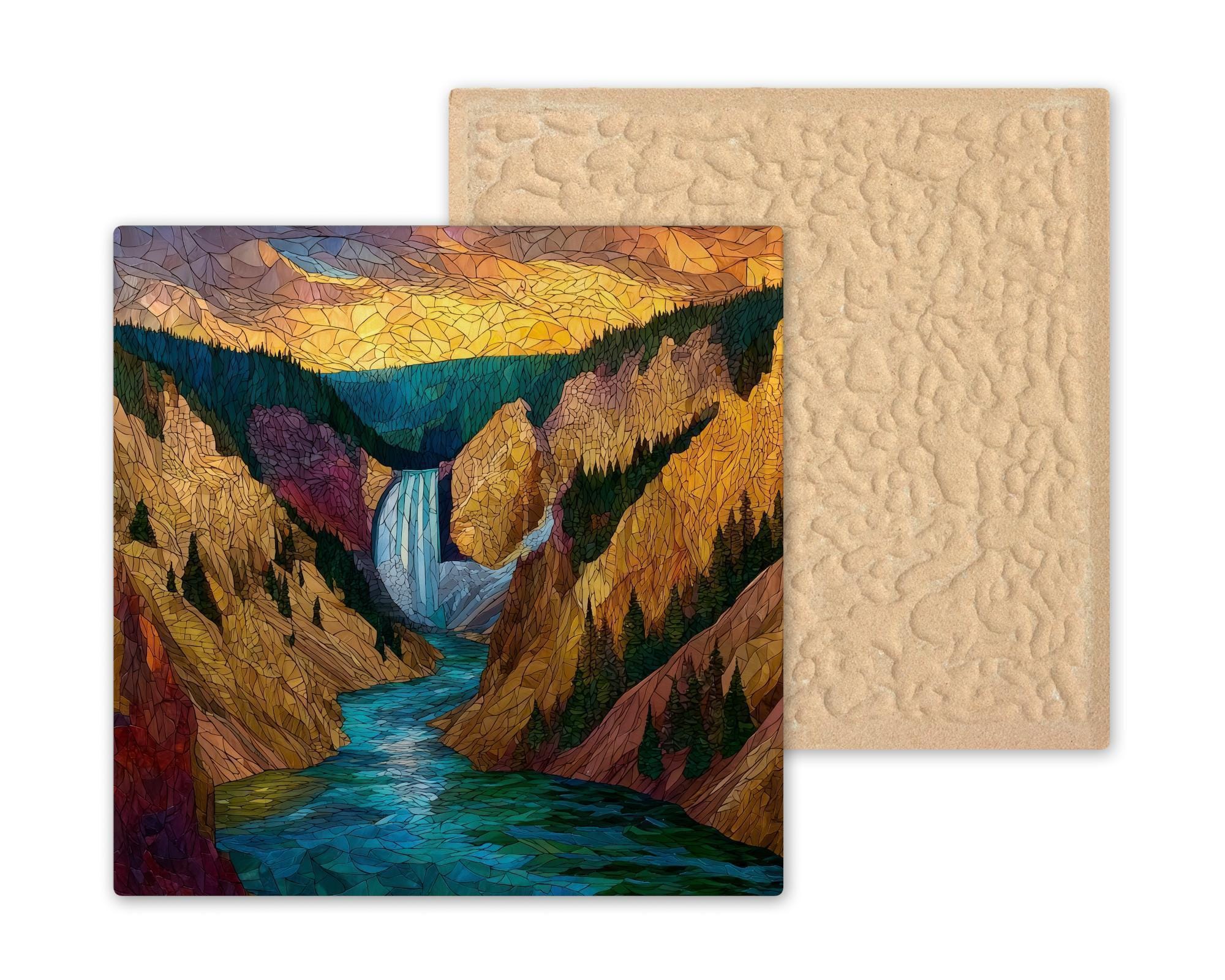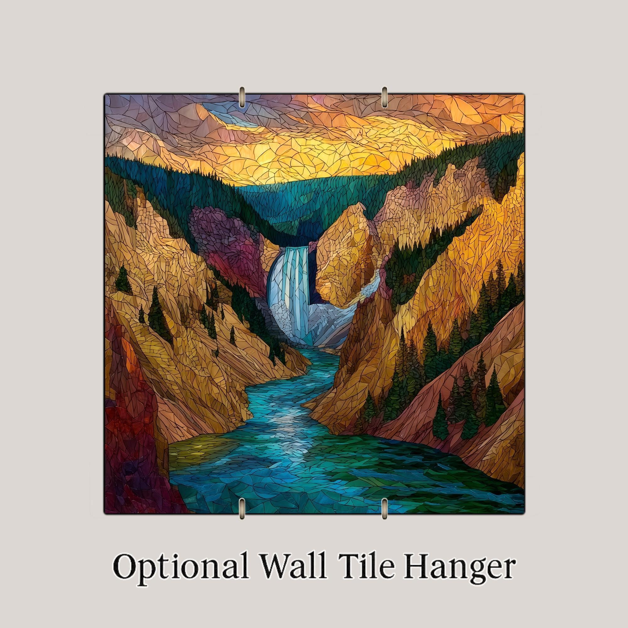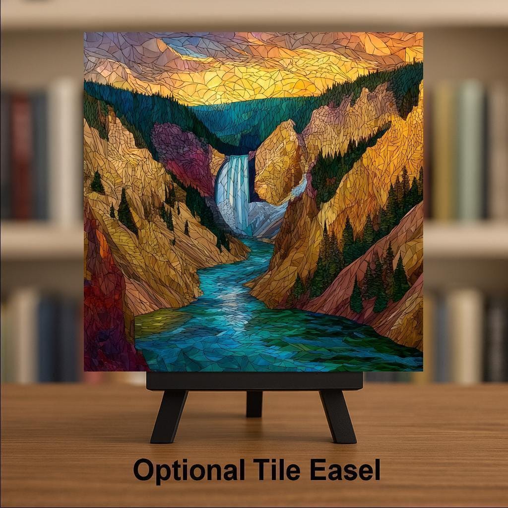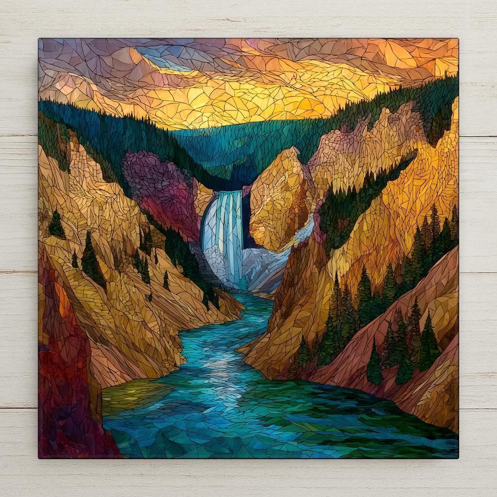 Capture the grandeur of Yellowstone with this stained glass style ceramic tile featuring the iconic Lower Falls of the Grand Canyon of Yellowstone. Rich jewel tones of turquoise, gold, and deep green highlight the rushing river, towering canyon walls, and dramatic sky, giving this piece a glowing, timeless look.