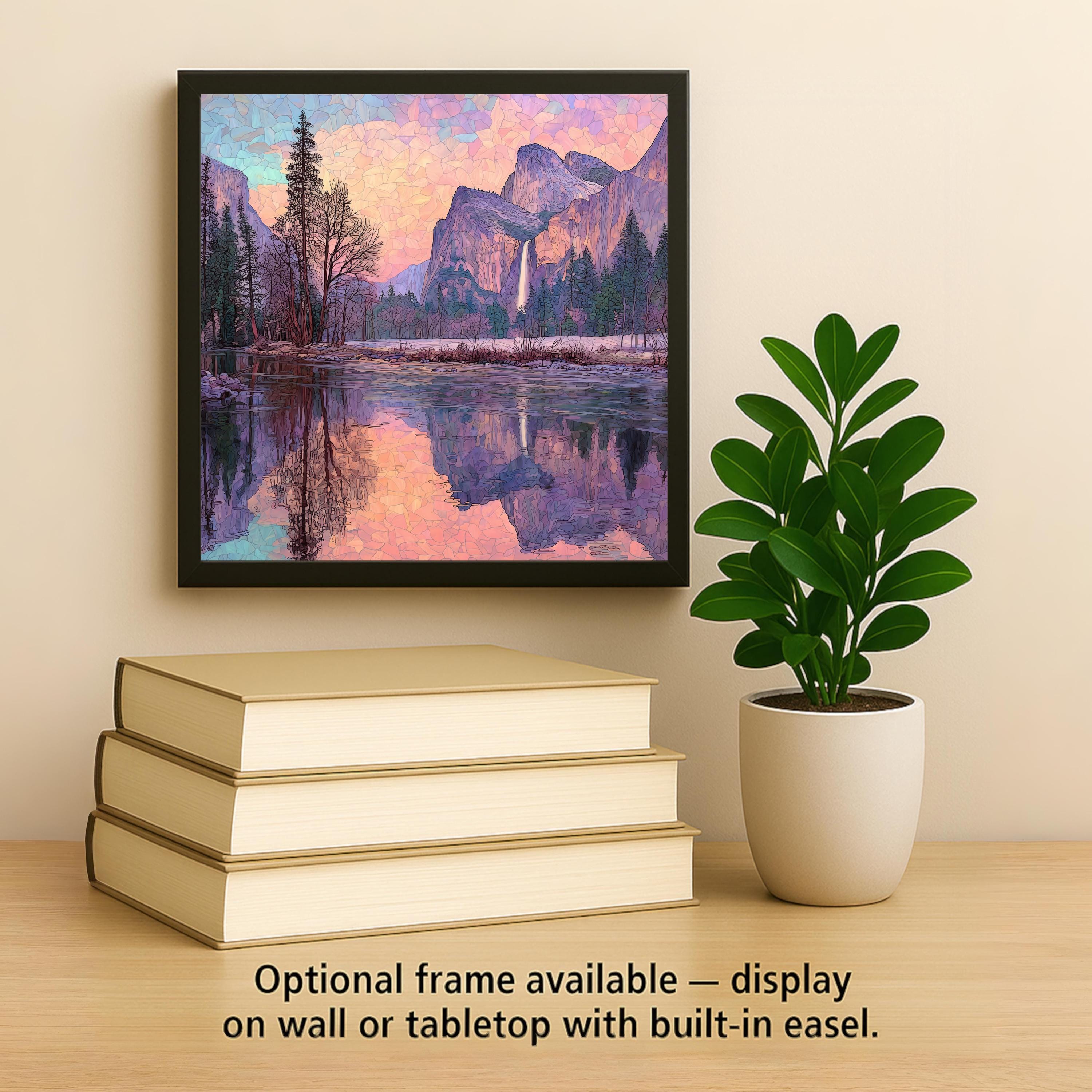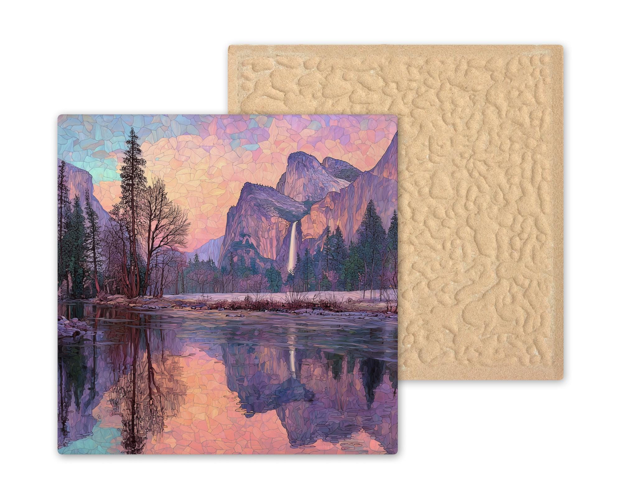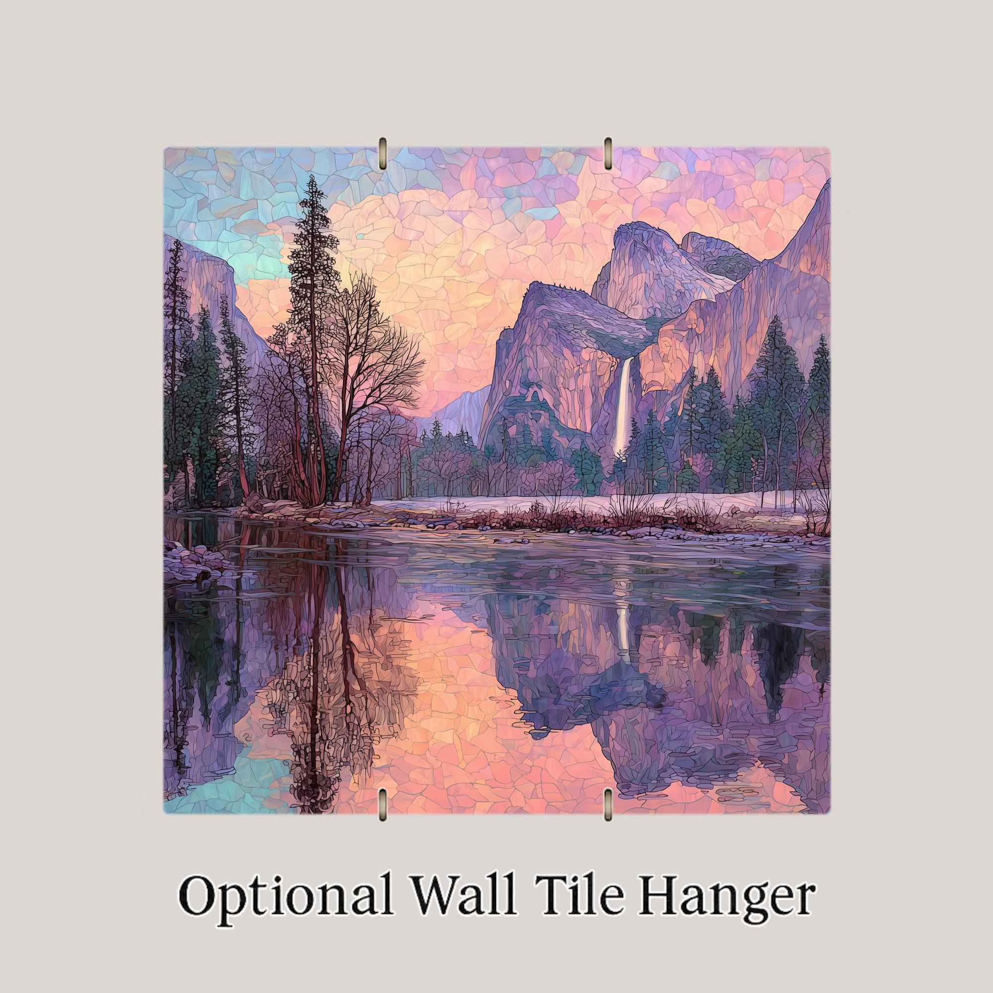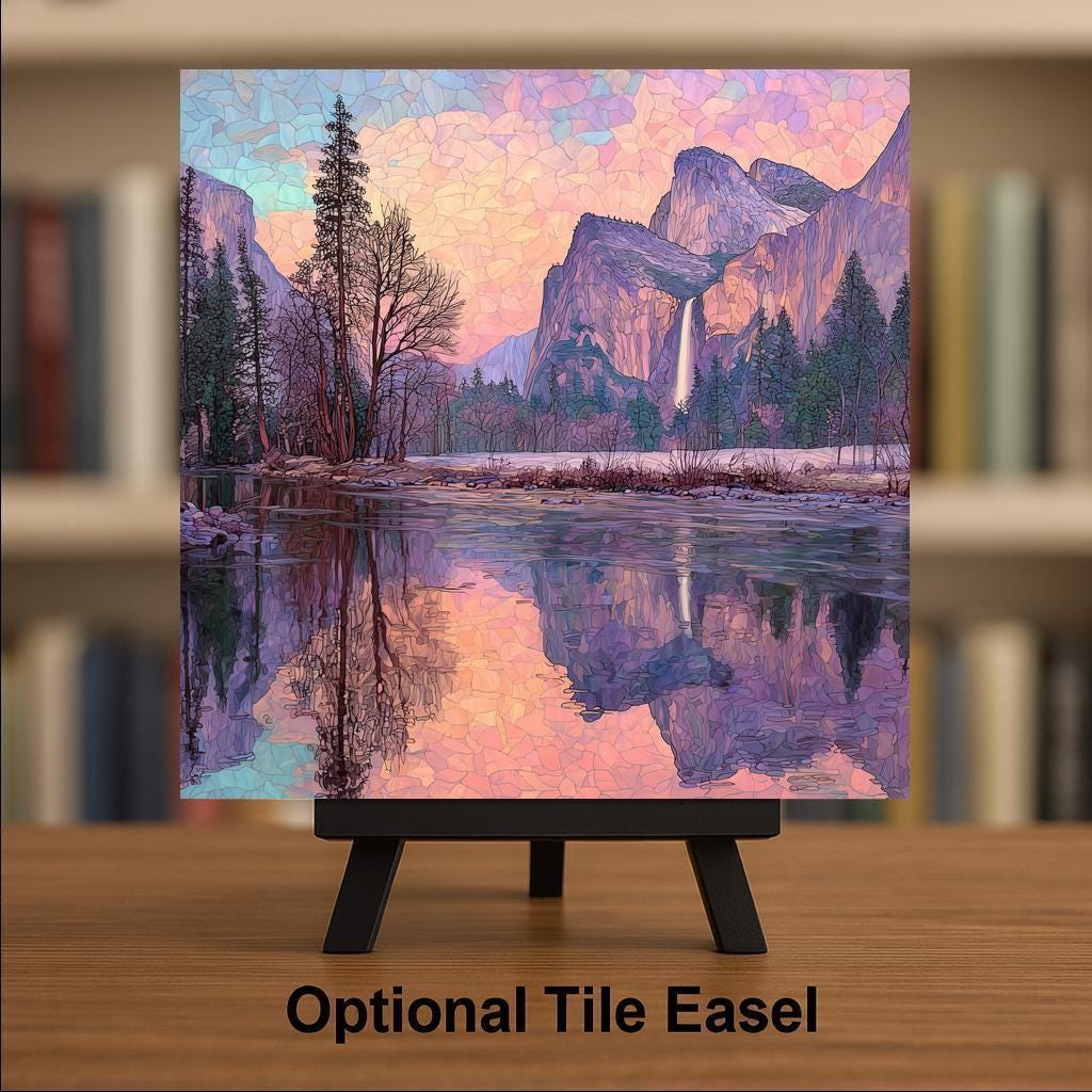 Bring the splendor of Yosemite National Park into your home with this Merced River and Yosemite Falls stained glass style ceramic tile. The design highlights the calm river reflecting the towering granite cliffs and cascading waterfall, all bathed in jewel-tone sunset colors. The stained glass mosaic style creates a luminous effect that blends artistry with natural beauty.