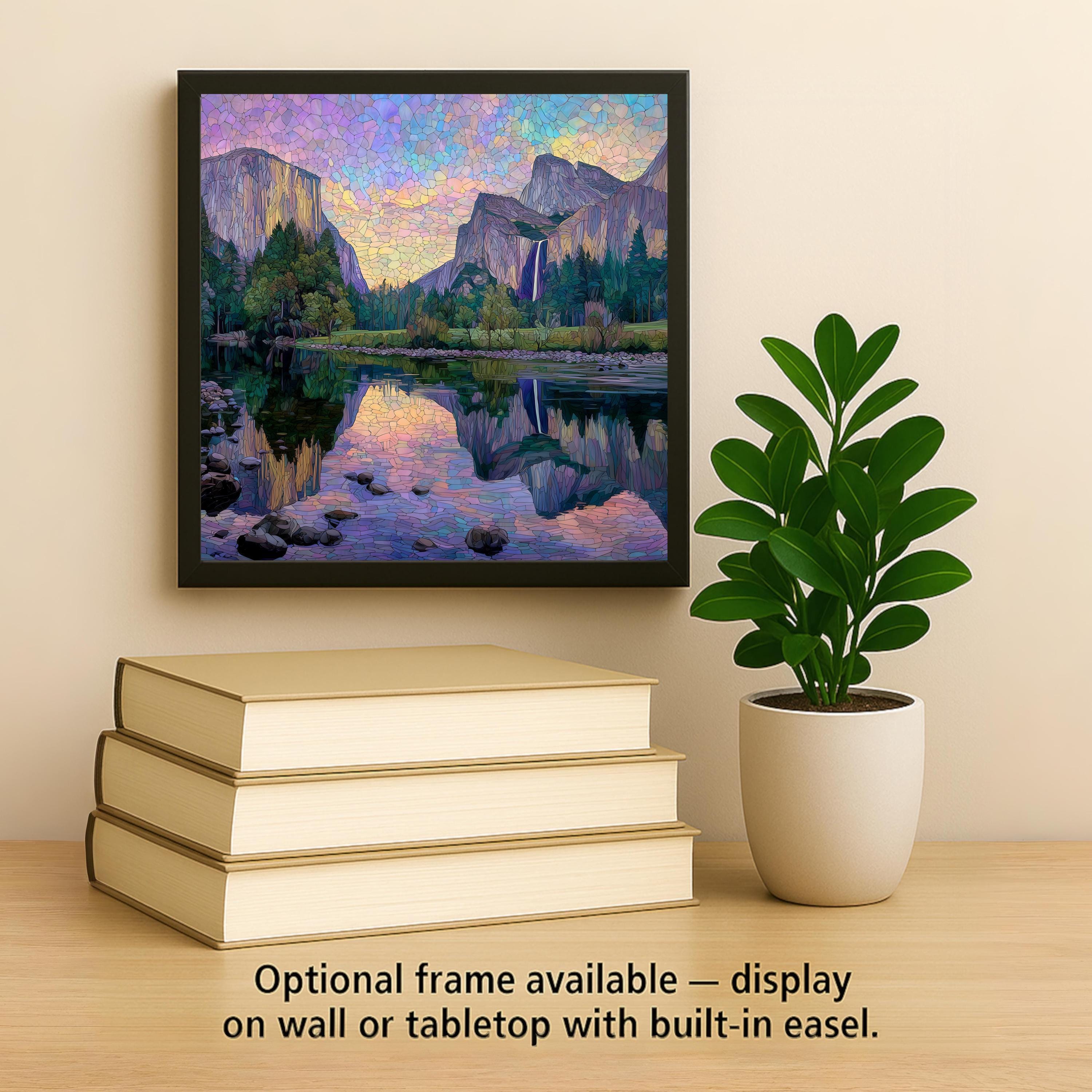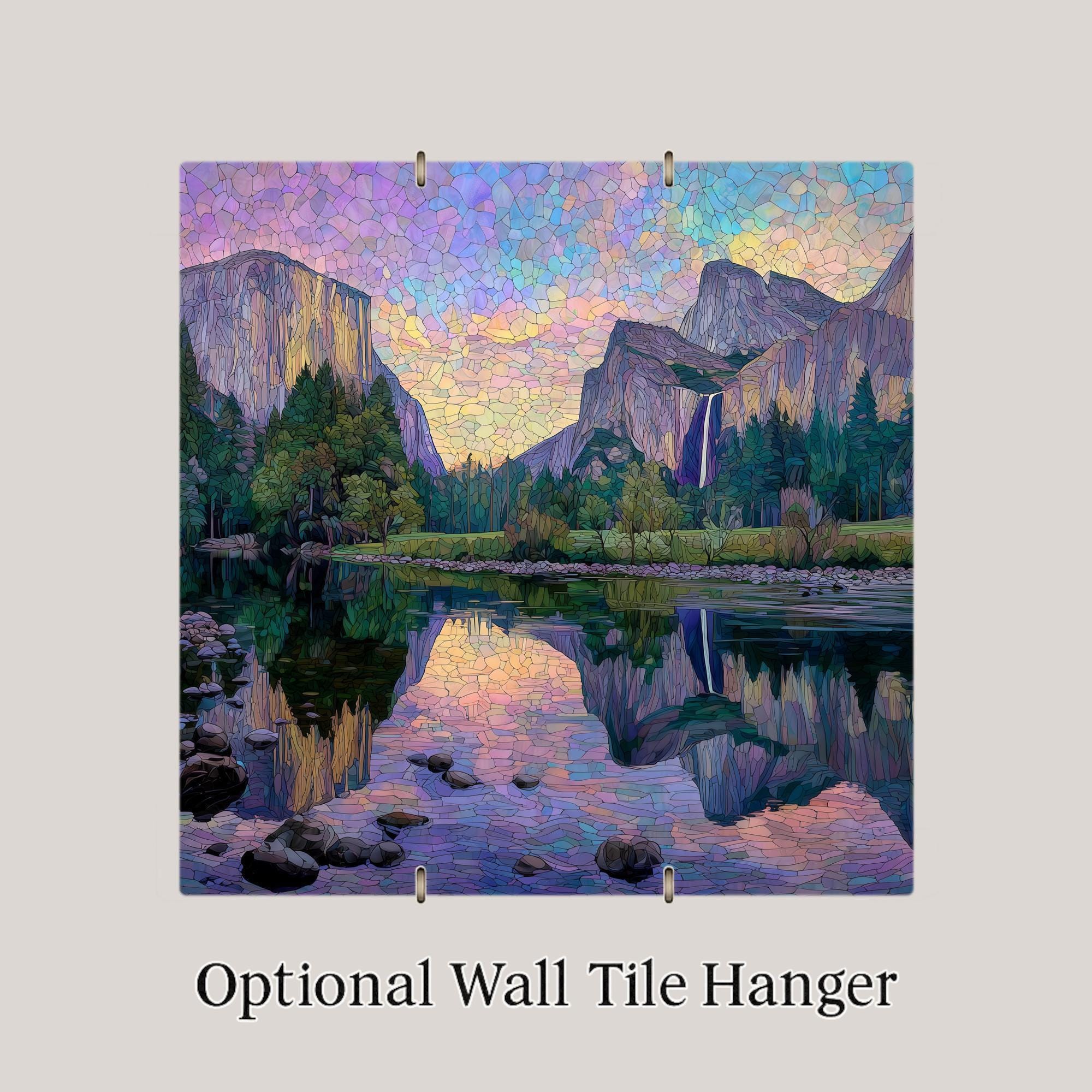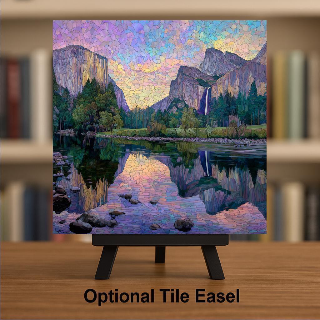 Celebrate the majesty of Yosemite with this stained glass style ceramic tile featuring Valley View at sunset. The design captures towering El Capitan on the left, Bridalveil Falls cascading on the right, and the Merced River flowing between them, reflecting the colorful sky. Jewel-tone hues of turquoise, violet, and golden amber bring the scene to life in radiant stained glass detail.