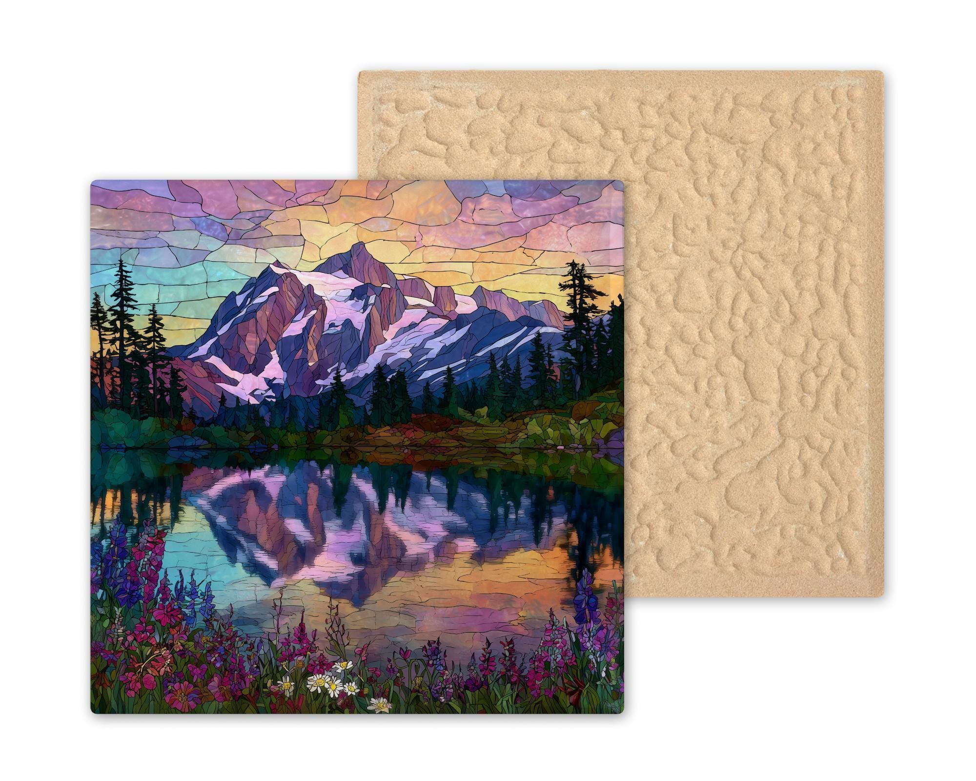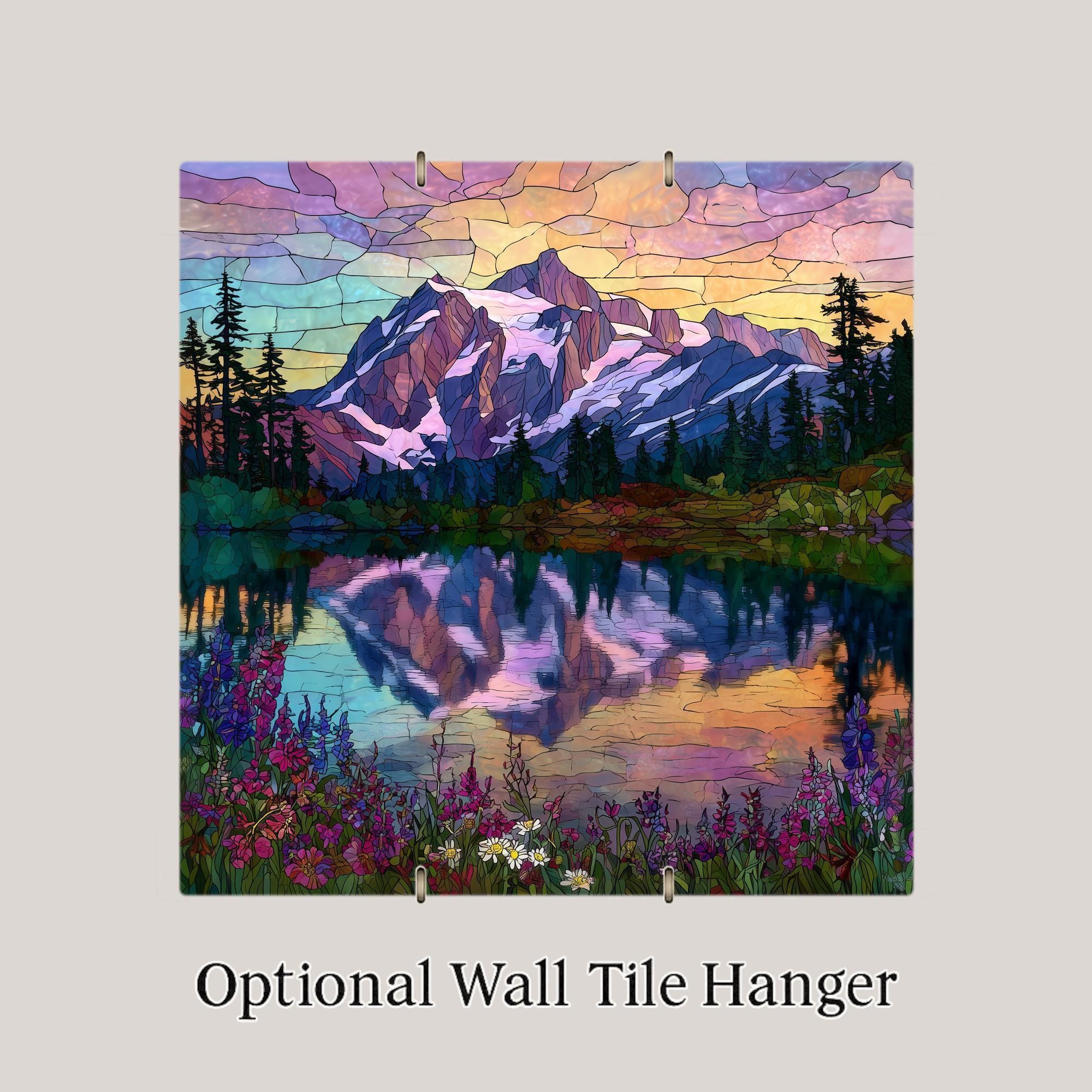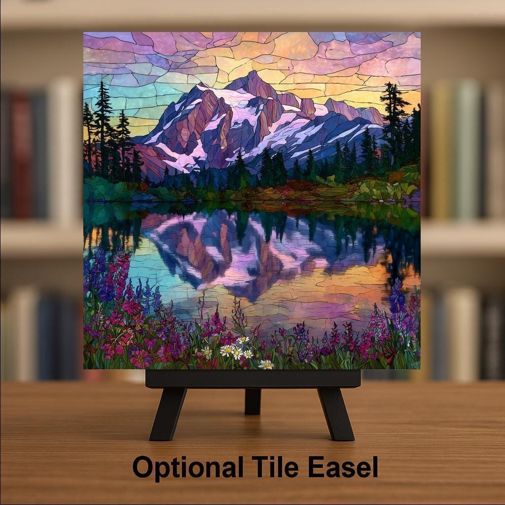 Bring the serene beauty of Washington’s North Cascades into your home with this stained glass style ceramic tile featuring Mt. Shuksan and Picture Lake. The design captures shimmering lake reflections, colorful wildflowers, and the grandeur of one of America’s most iconic mountain landscapes. Jewel-tone shades of violet, turquoise, and ruby glow across the design, making the tile shine like real stained glass.