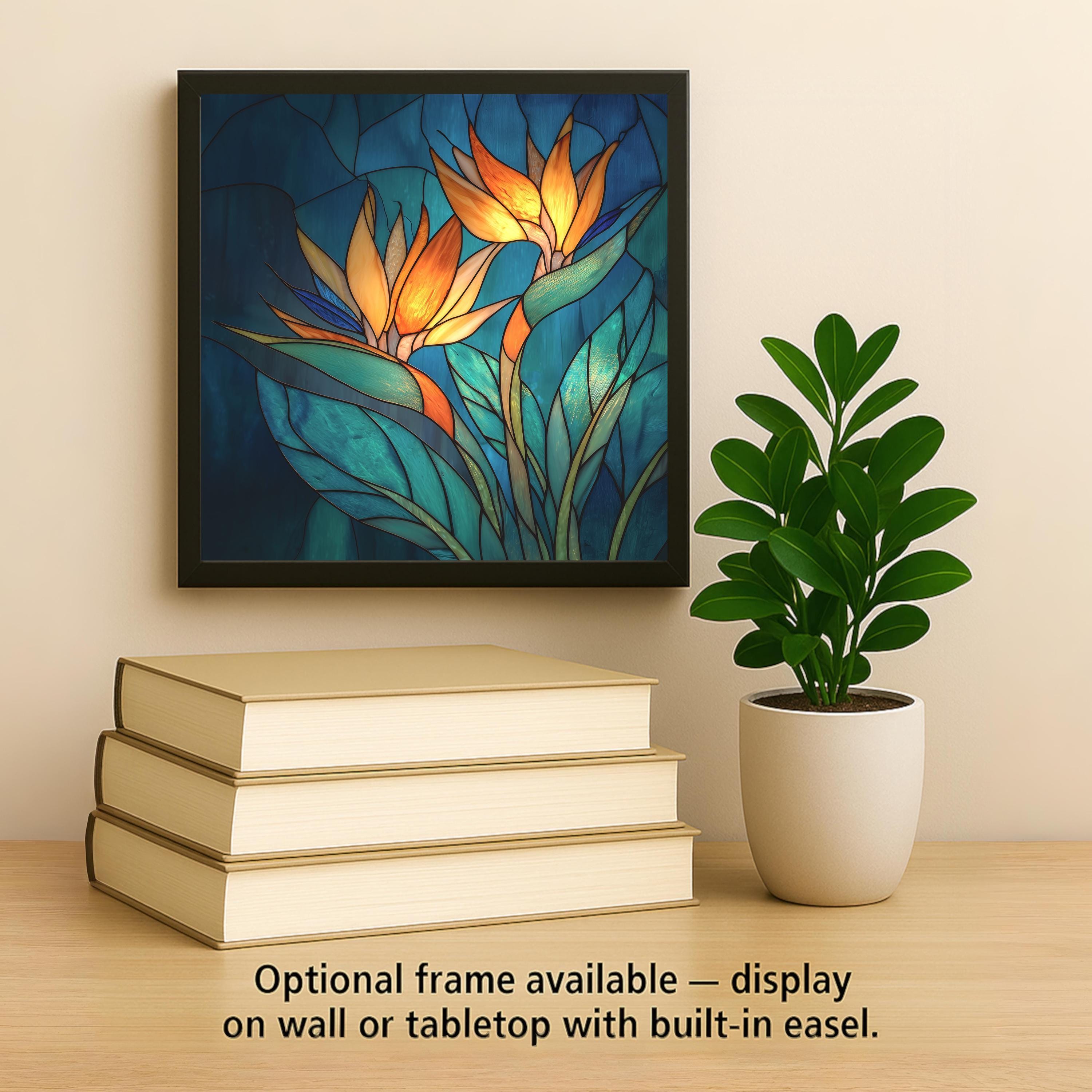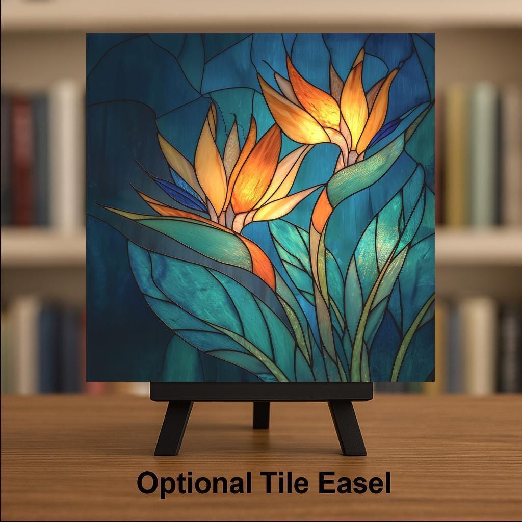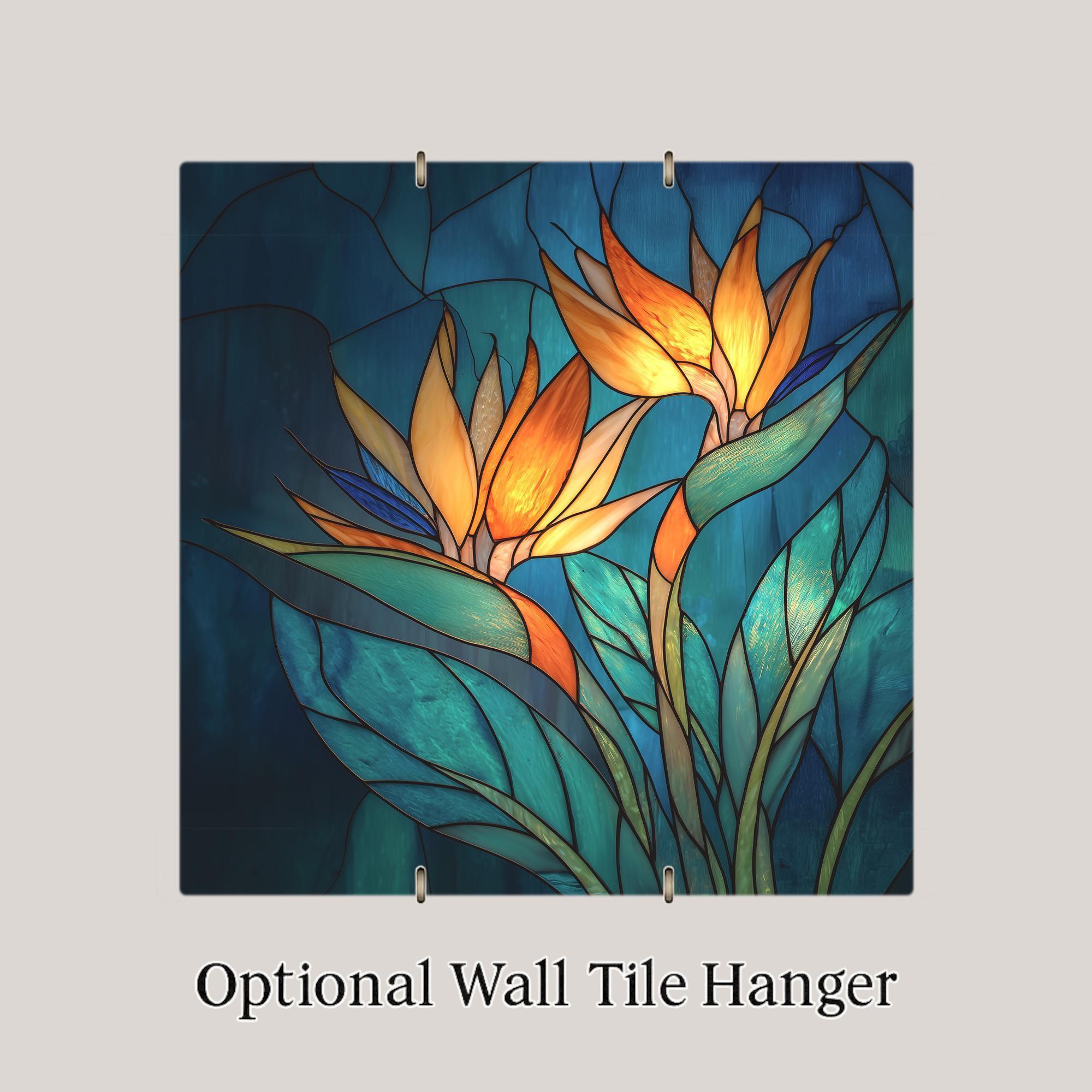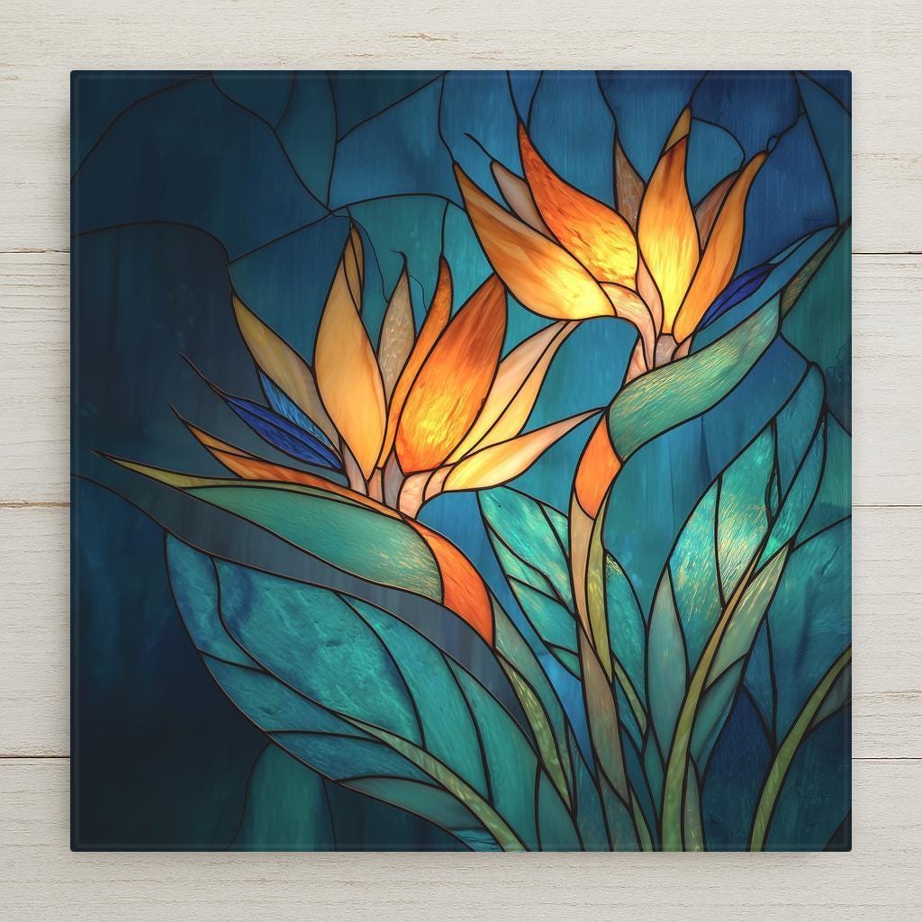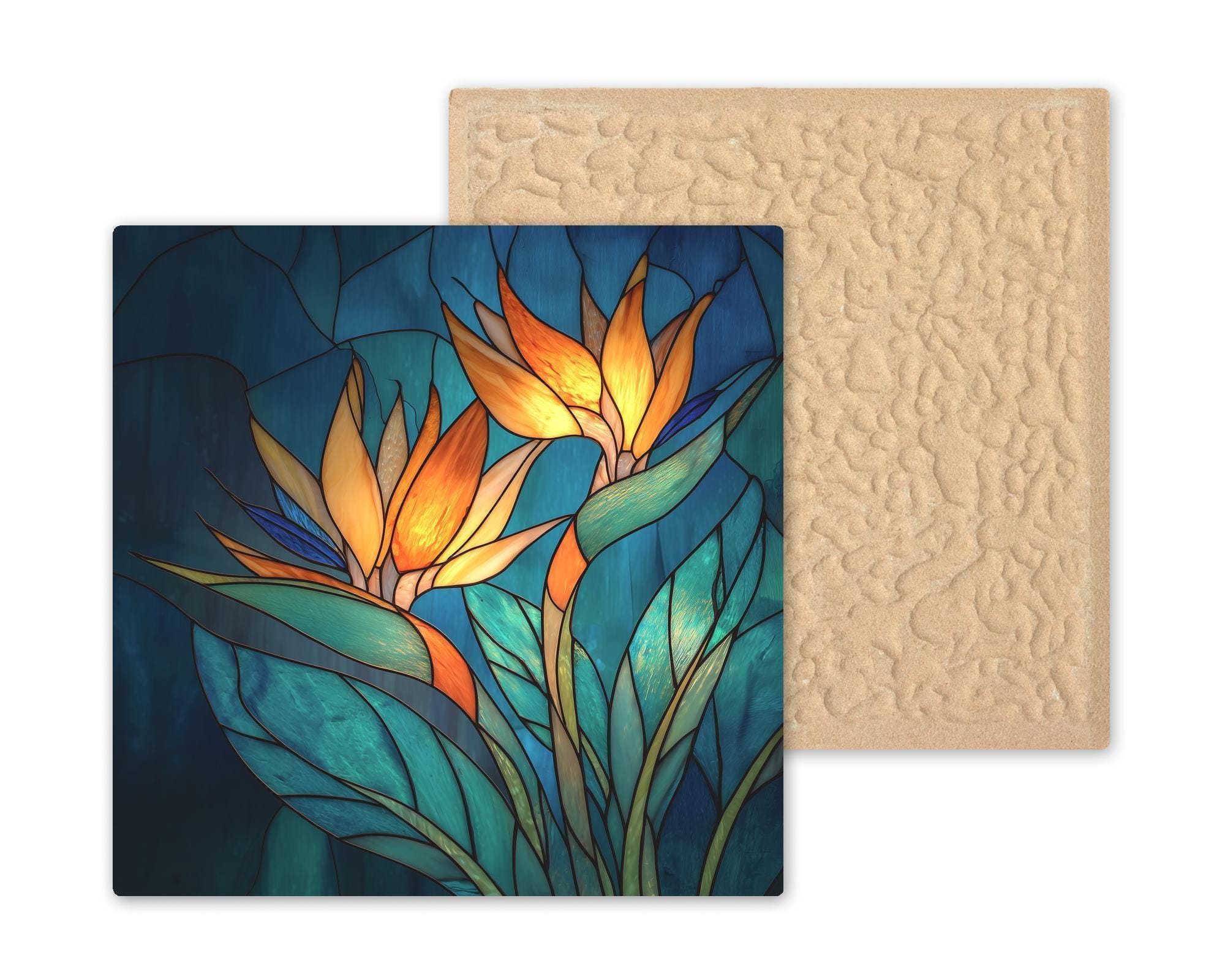 Celebrate tropical elegance with this Bird of Paradise stained-glass inspired art tile, a handcrafted piece designed for lasting brilliance. The artwork glows with layers of orange, gold, and turquoise tones, reflecting the drama of sunlight filtering through glass. Printed with high-temperature sublimation, each tile showcases exceptional detail, color depth, and luminosity.