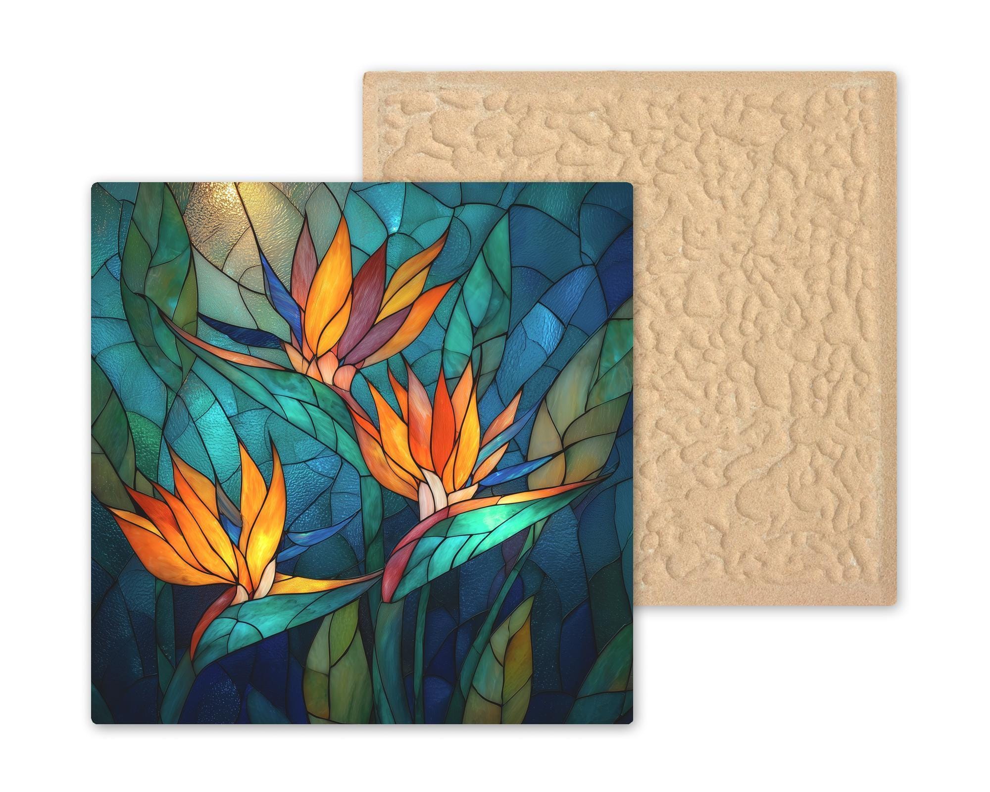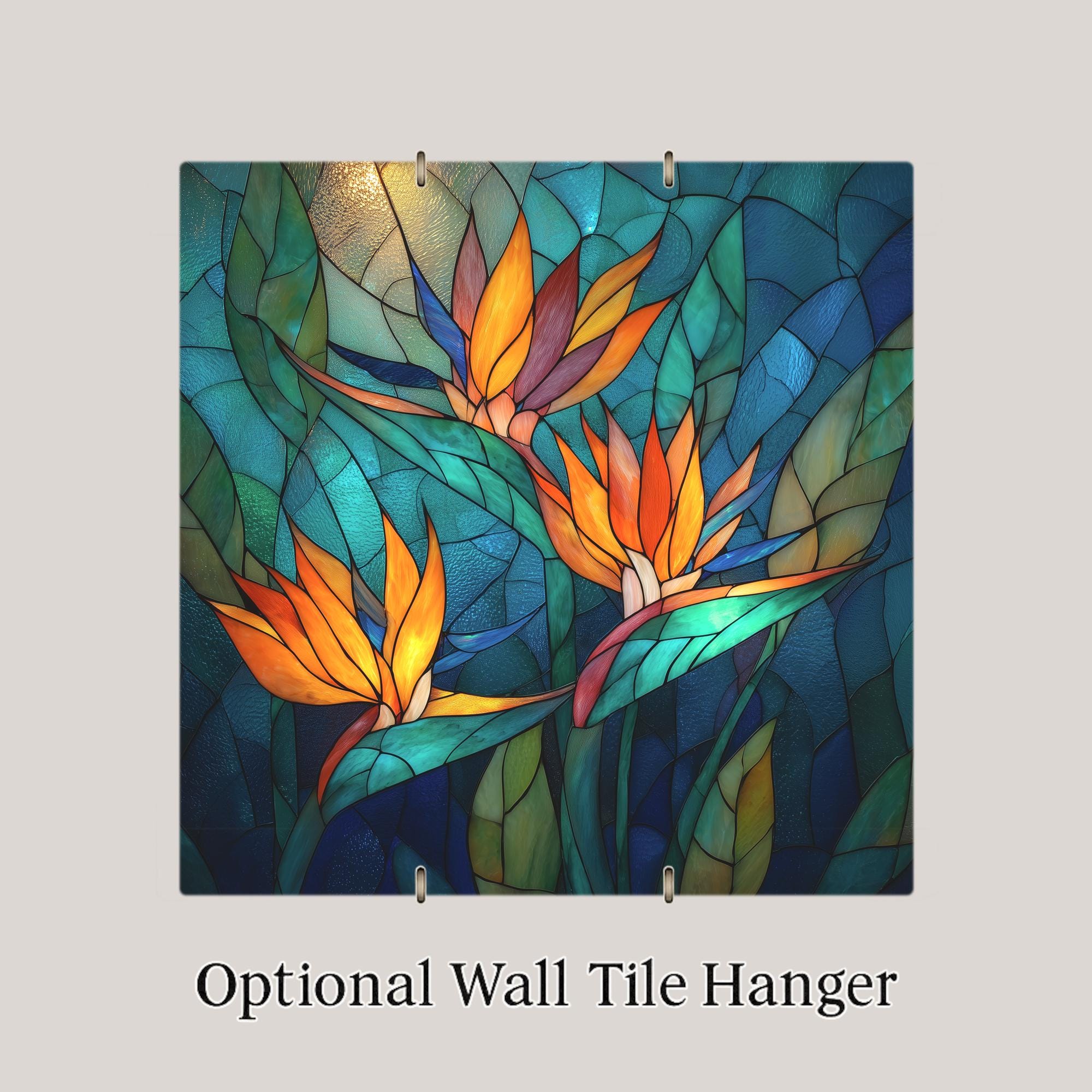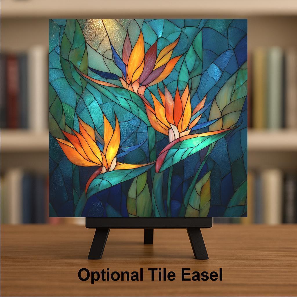 Celebrate nature’s artistry with this Bird of Paradise Trio stained-glass inspired ceramic art tile, a radiant fusion of tropical color and timeless design. Featuring vivid orange blossoms and layers of turquoise and jade leaves, this tile glows as if lit from within.