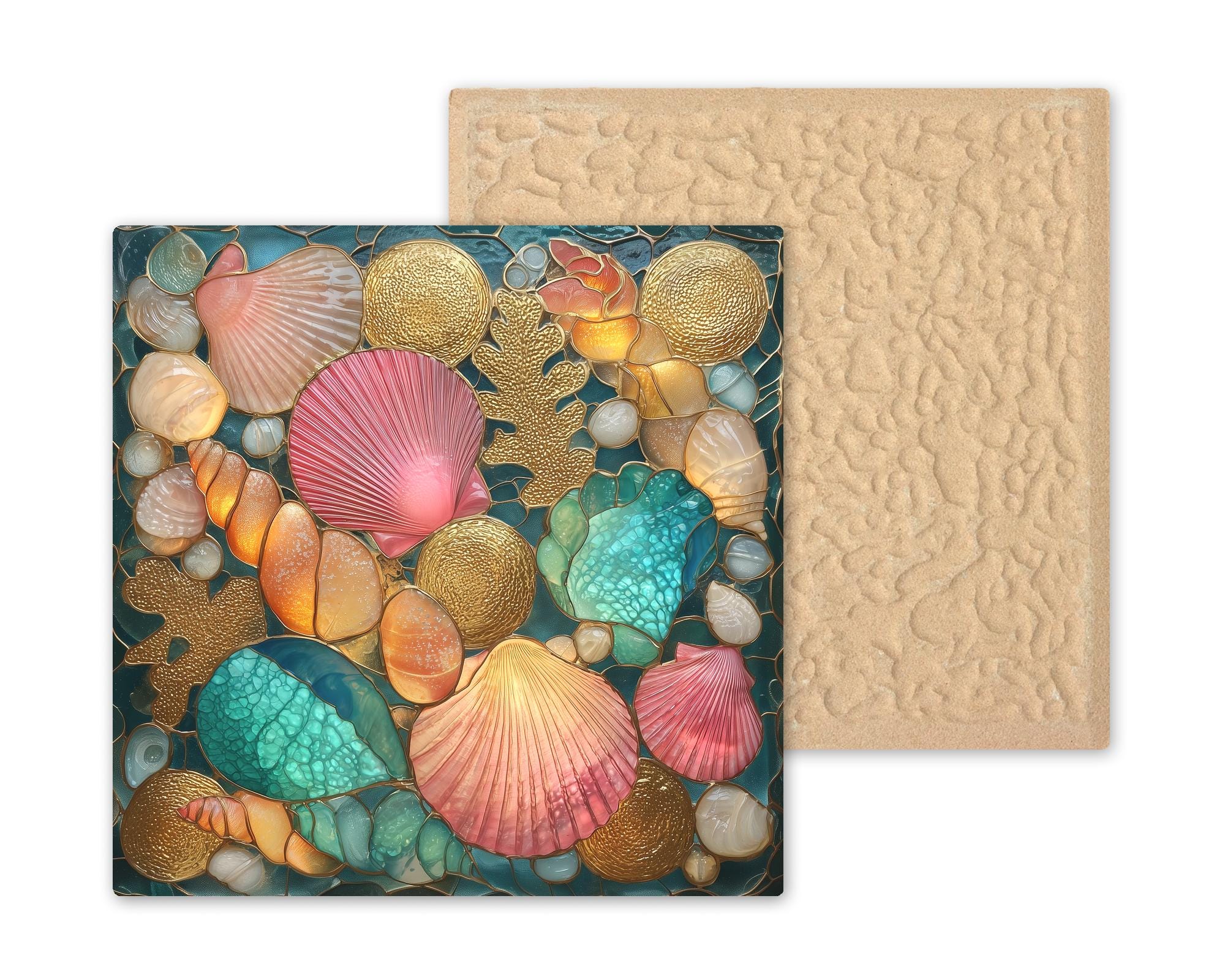 Celebrate coastal elegance with this Seashell Mosaic stained-glass inspired tile, a stunning piece of beach-style wall decor that captures the tranquil beauty of the ocean. The design showcases scallop shells, coral branches, and spiral sea shells arranged in a glowing mosaic of teal, gold, and peach tones.