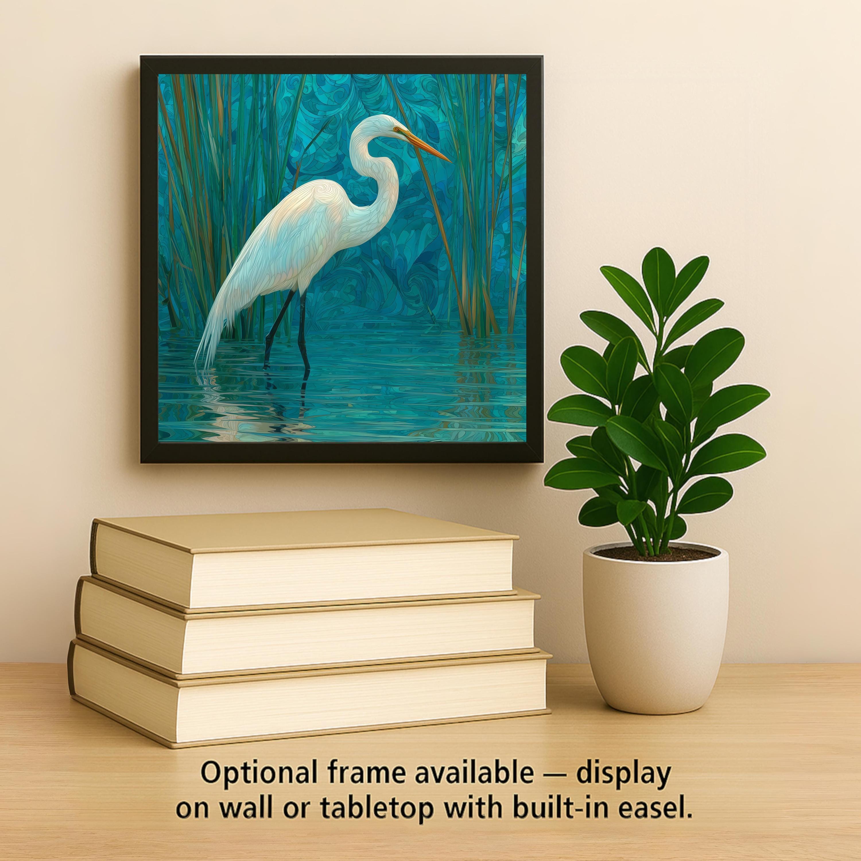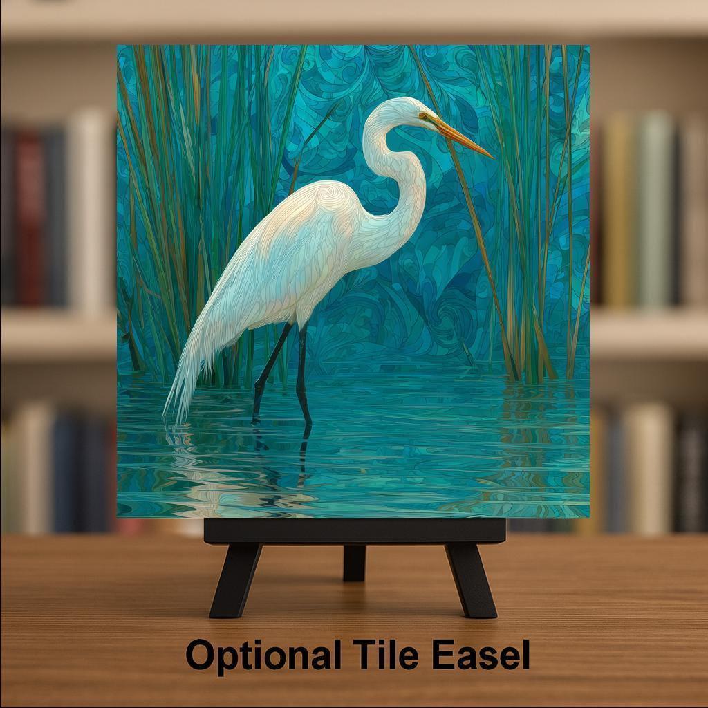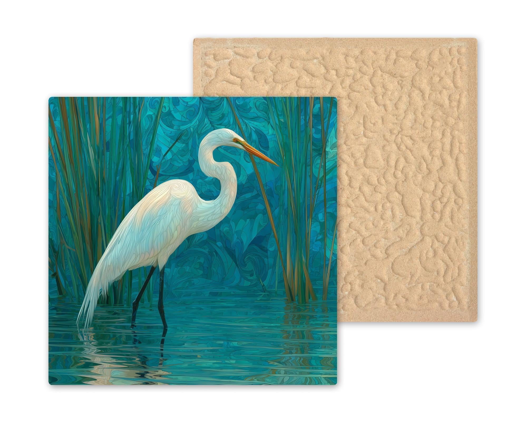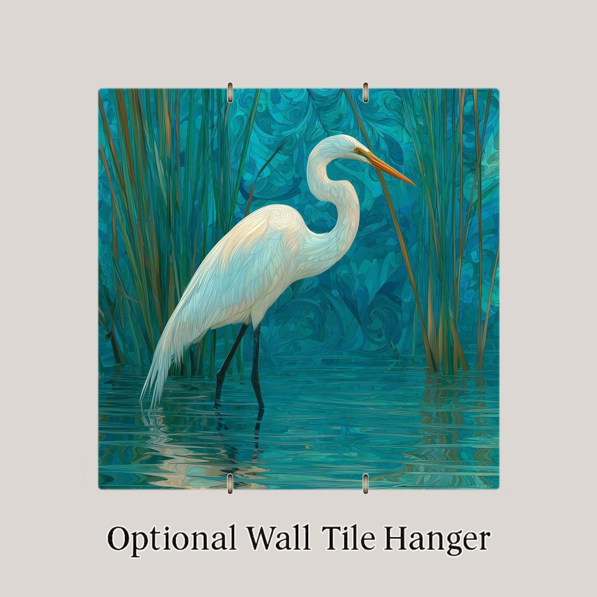Bring the calm of coastal wetlands indoors with this White Egret ceramic tile wall art, a detailed marsh-inspired composition that reflects the stillness and beauty of nature. The intricate linework and layered color tones in aqua, jade, and cream evoke the movement of water and reeds.