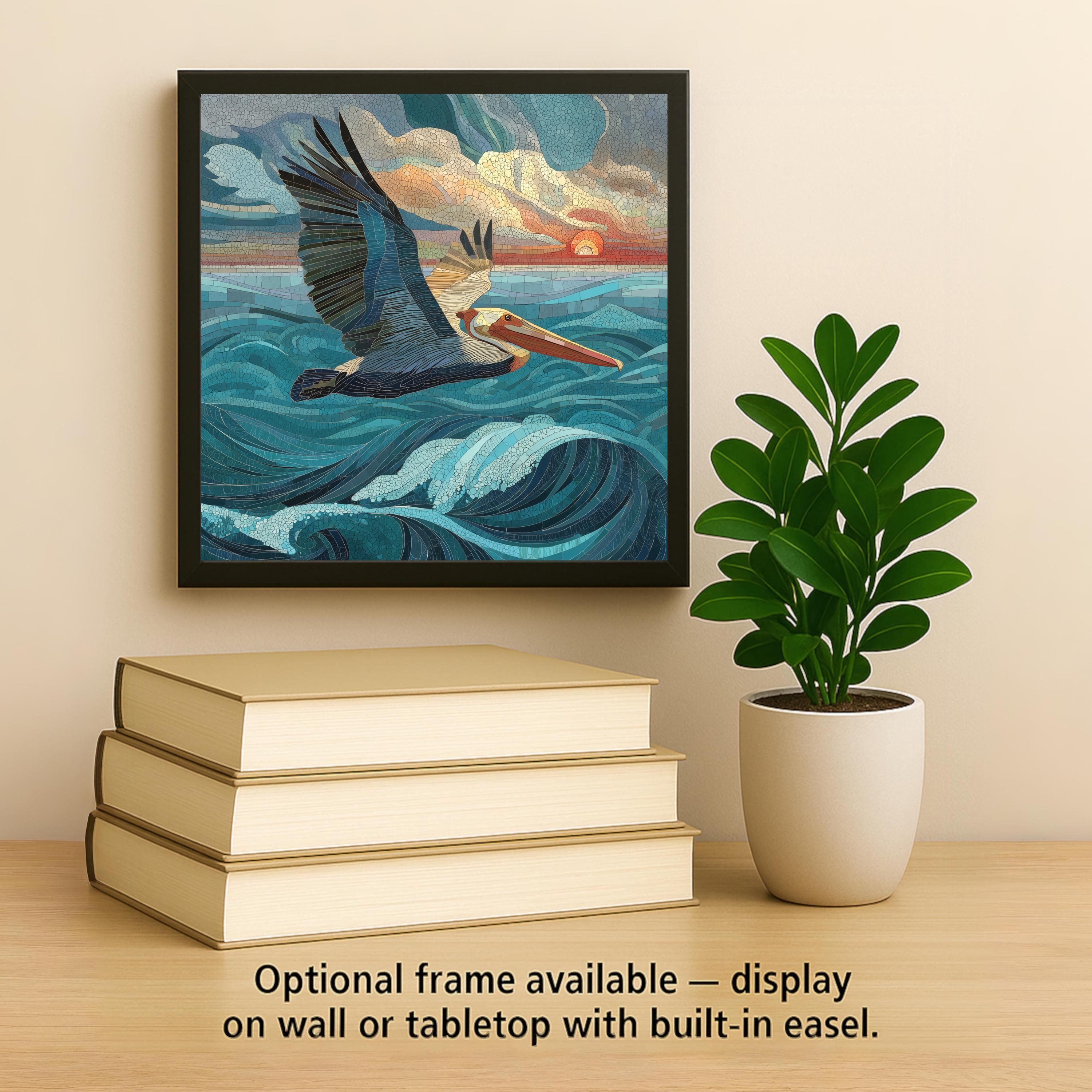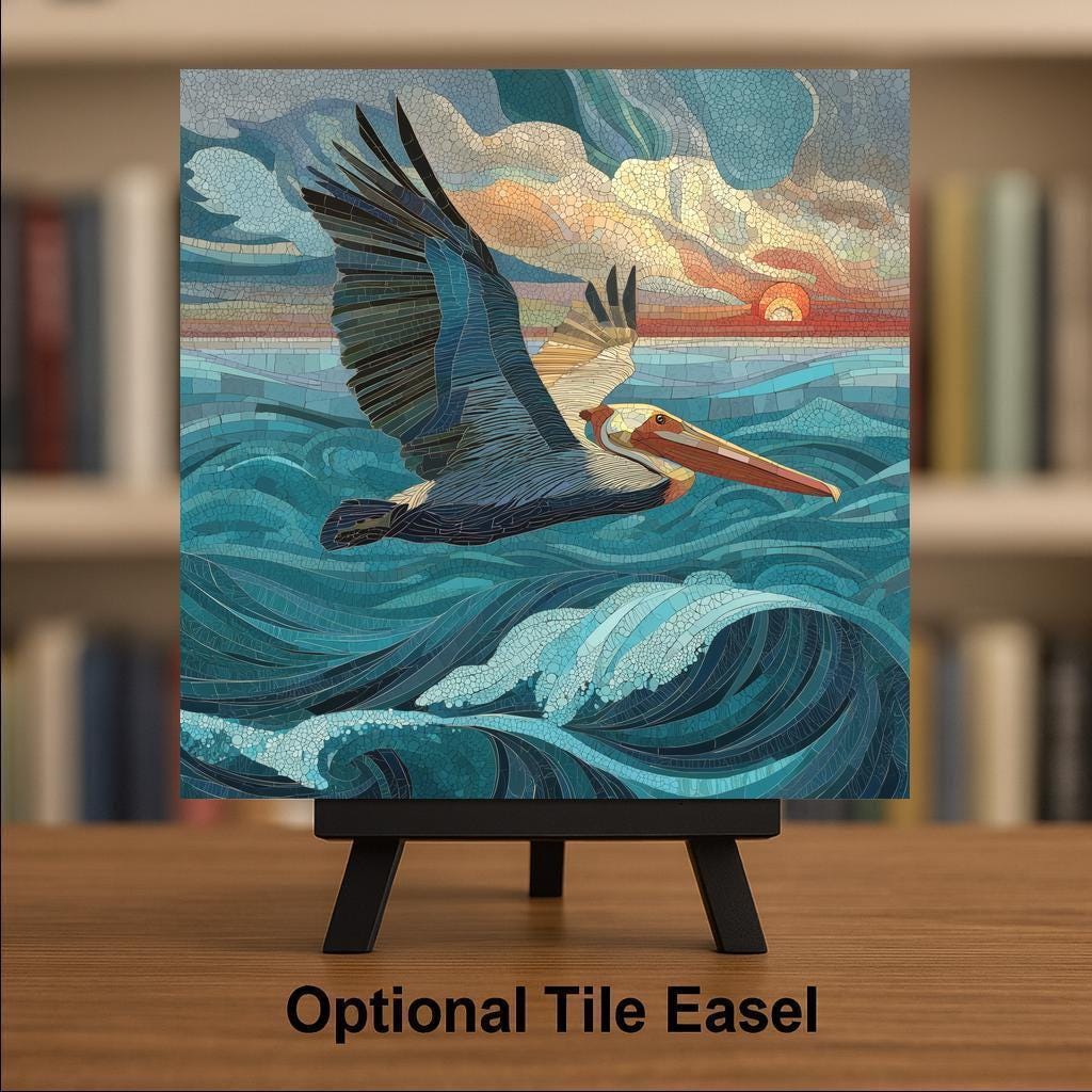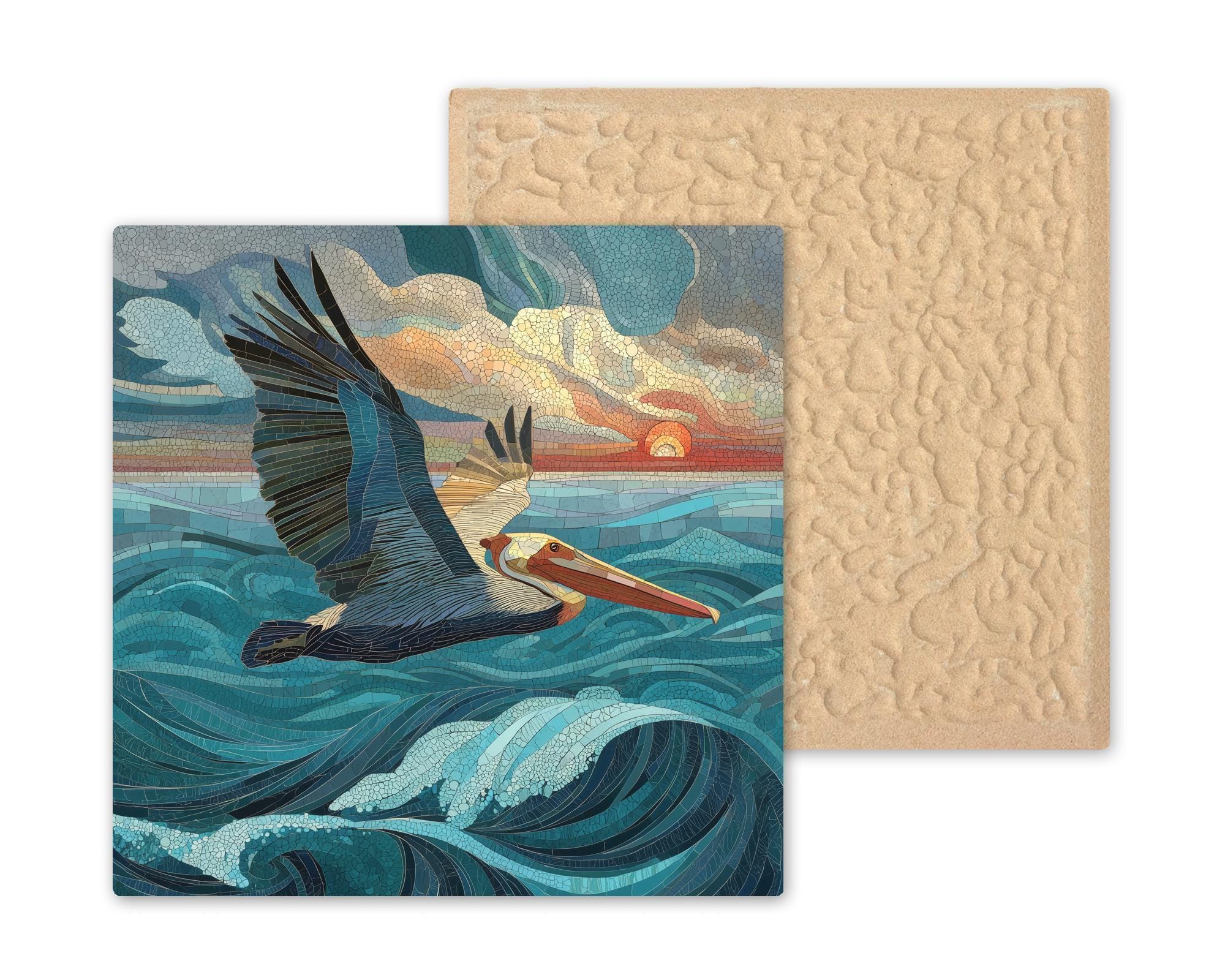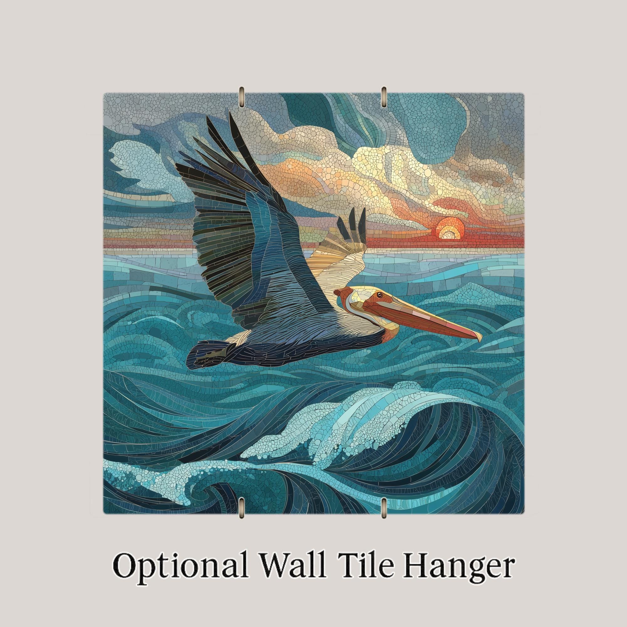 Bring the colors and movement of the sea into your home with this Pelican ceramic tile wall art, a bold coastal composition featuring a soaring bird over curling waves at sunset. The design captures the beauty of ocean life through vivid, layered detail and soft coastal tones.