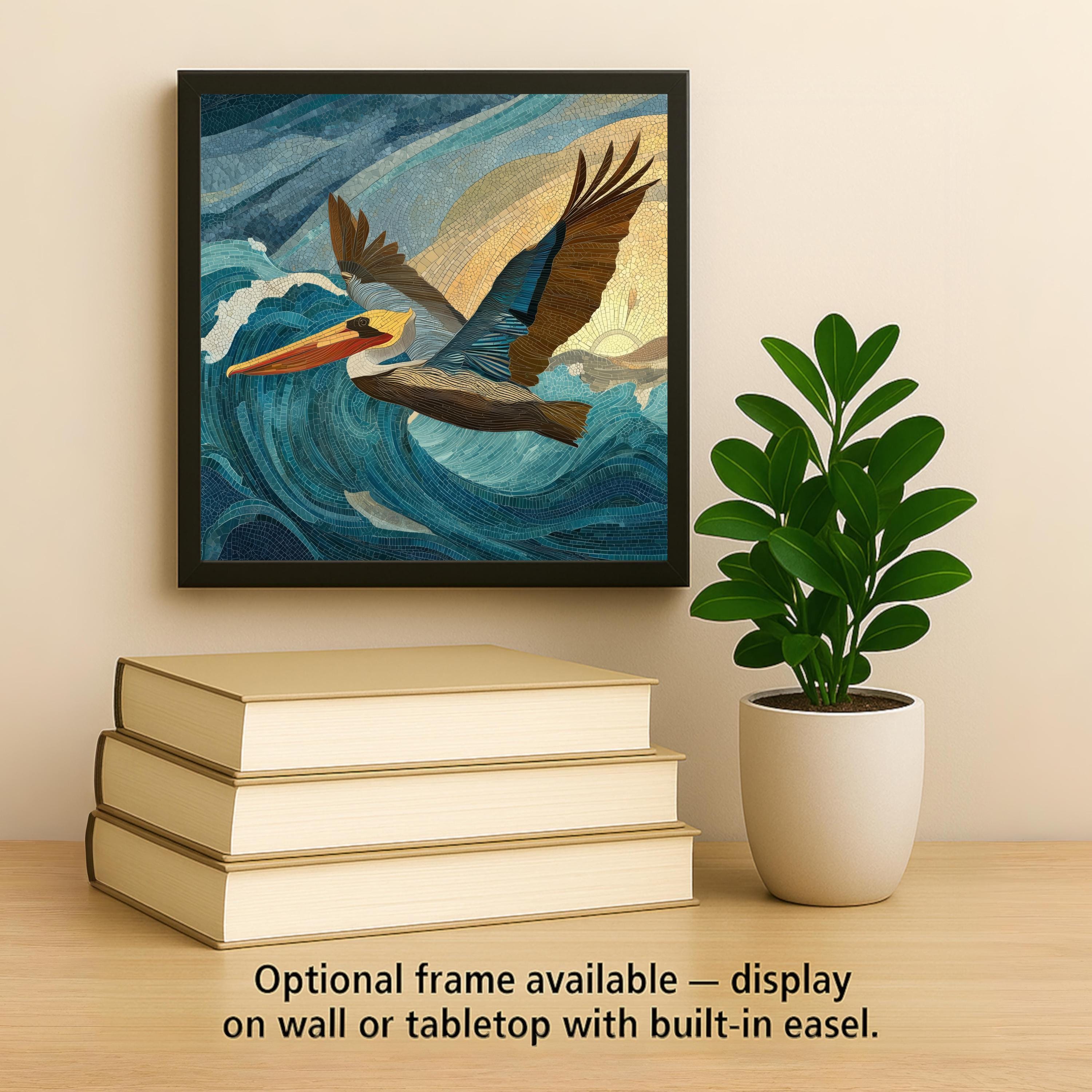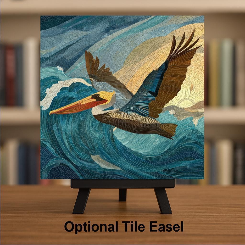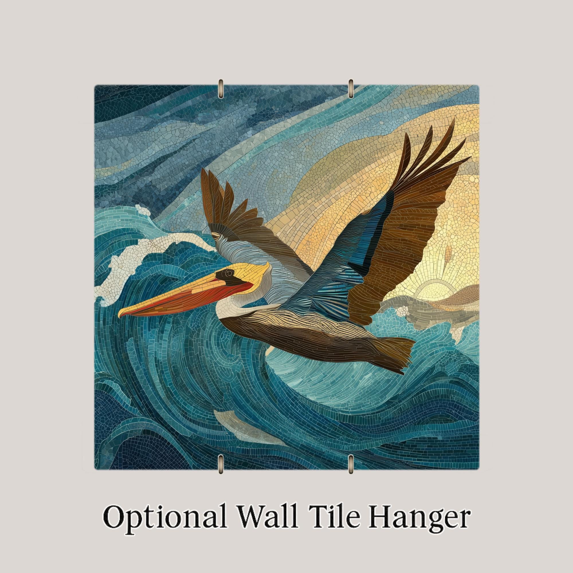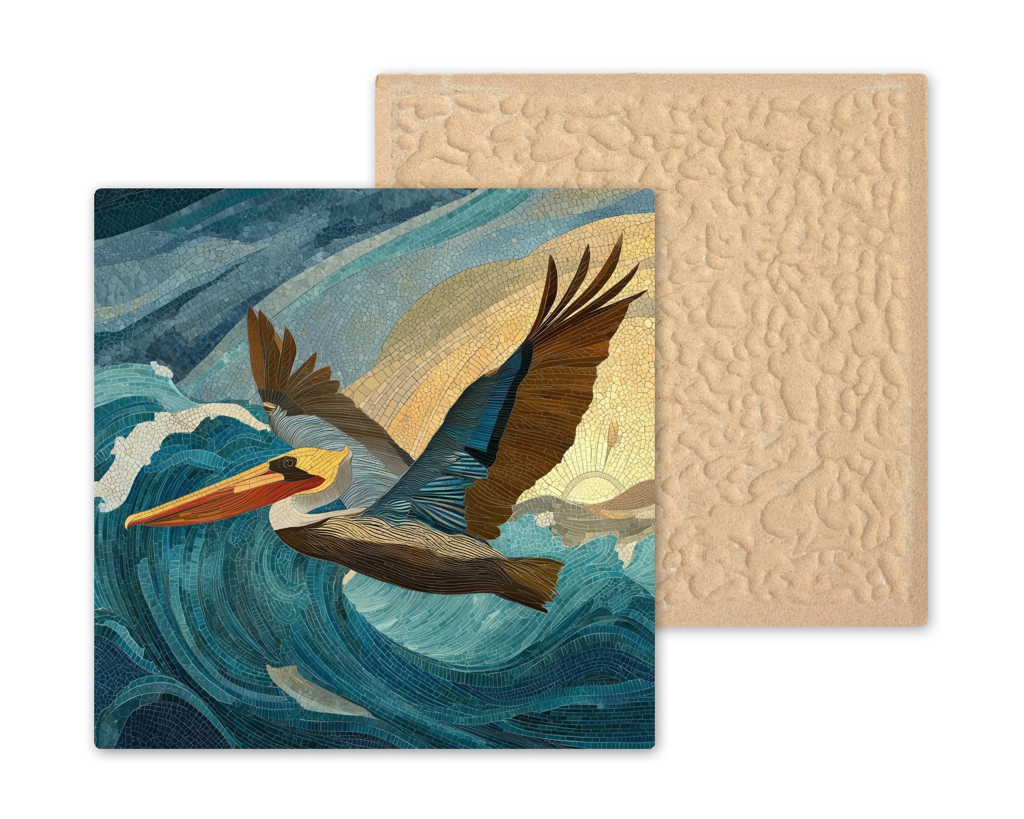 Celebrate the grace of coastal wildlife with this Pelican in Flight ceramic wall tile, featuring ocean blues, sandy golds, and warm sunset light. The artwork’s mosaic-style detailing gives it depth and motion, making it a captivating focal point for any room inspired by the sea.