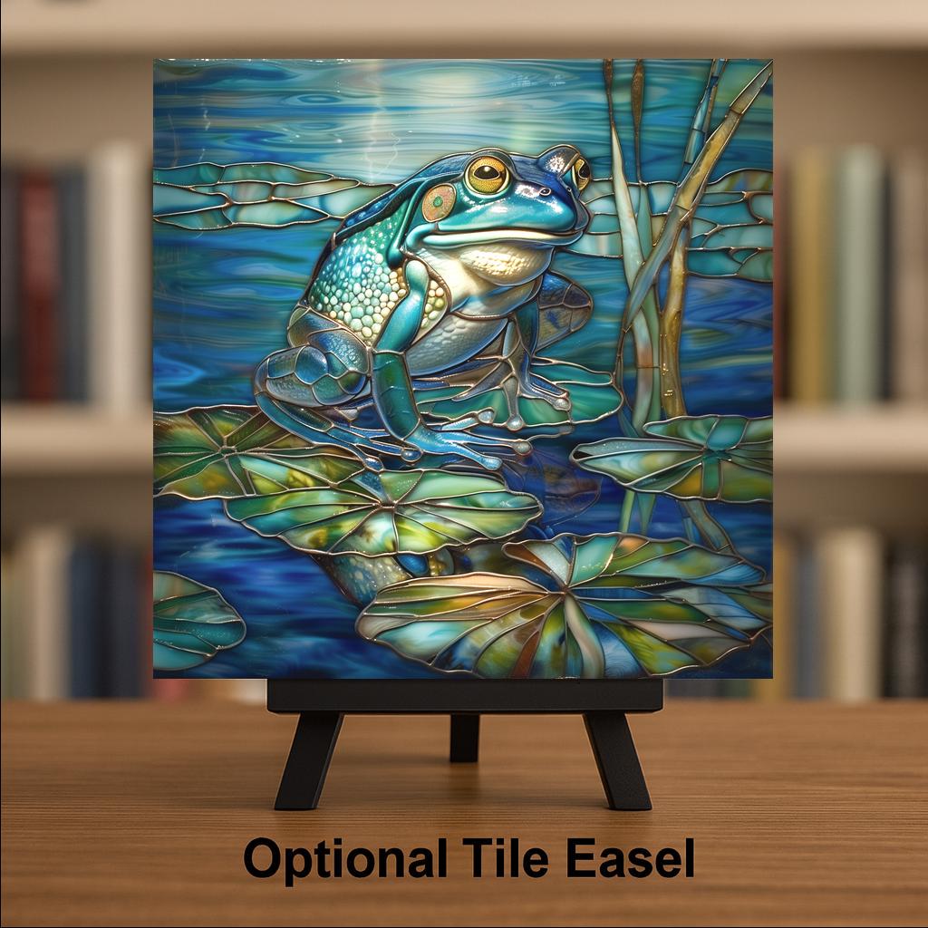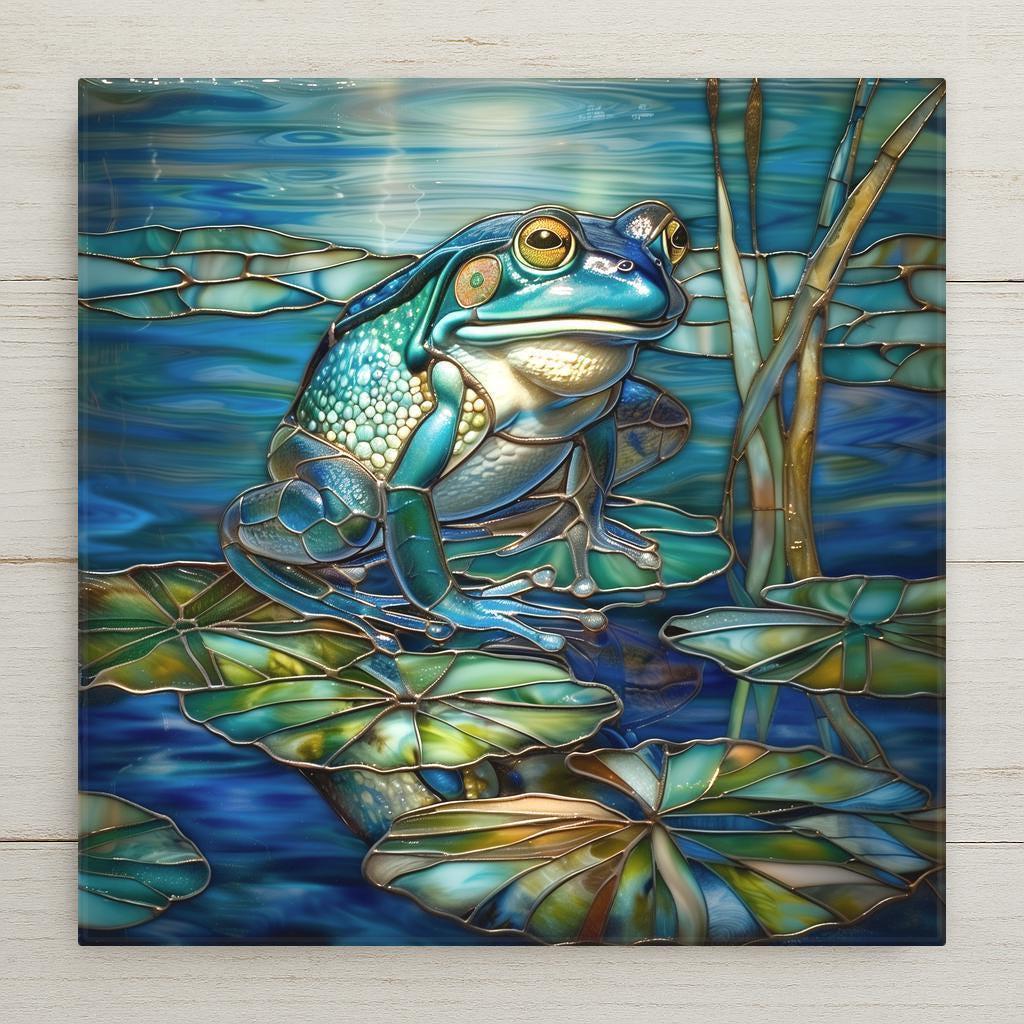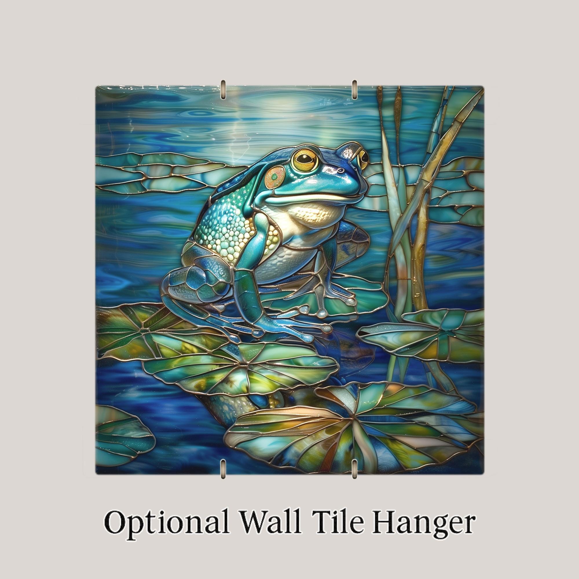 This Blue Frog Ceramic Tile Wall Art brings the tranquil charm of a water garden into your living space. Designed in a luminous stained-glass-inspired style, the frog’s turquoise hues shimmer against rich teal waters and glowing green lily pads. The intricate detail and color depth are infused directly into ceramic through sublimation, producing a glossy, fade-resistant finish that captures light beautifully.